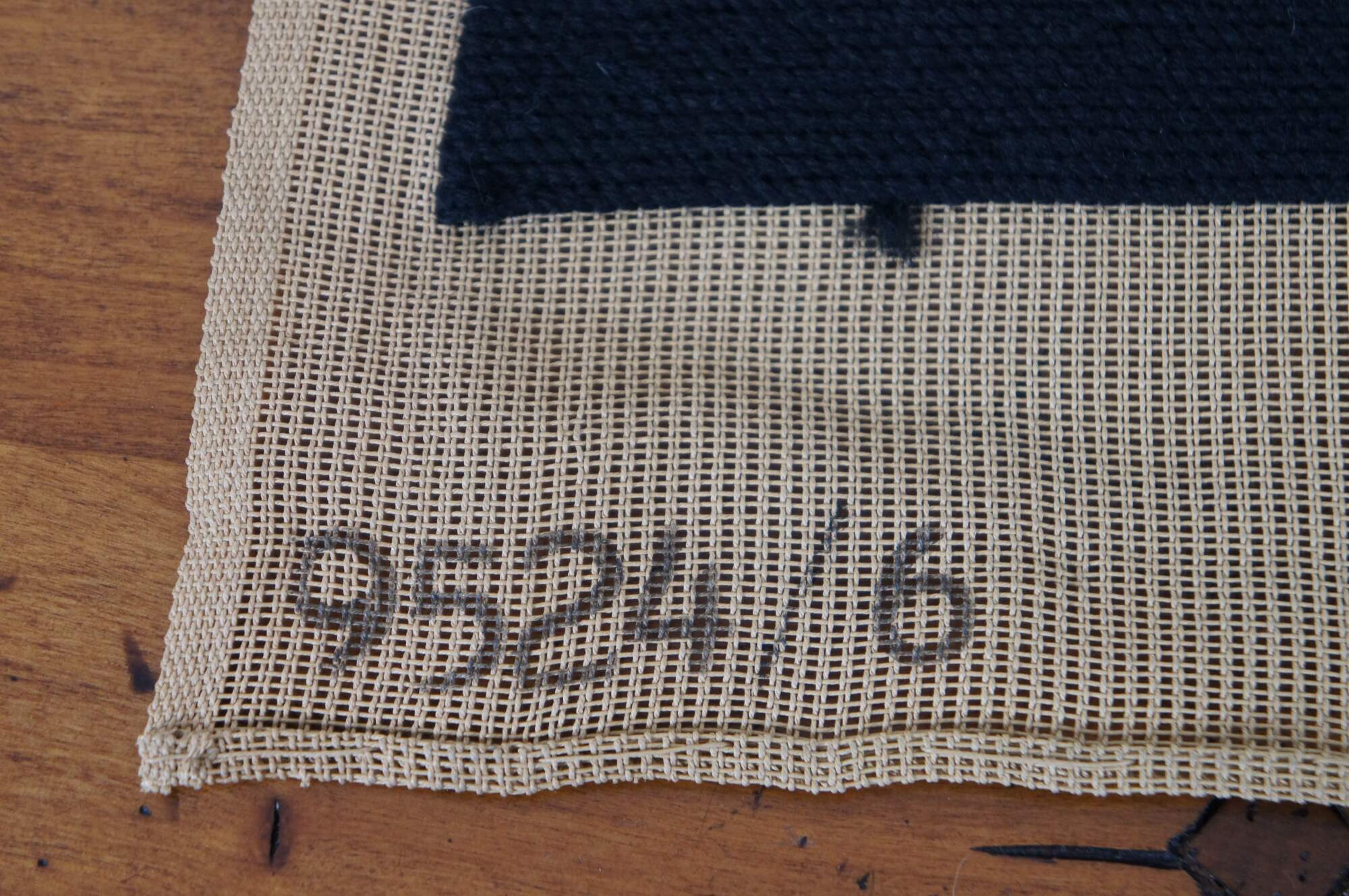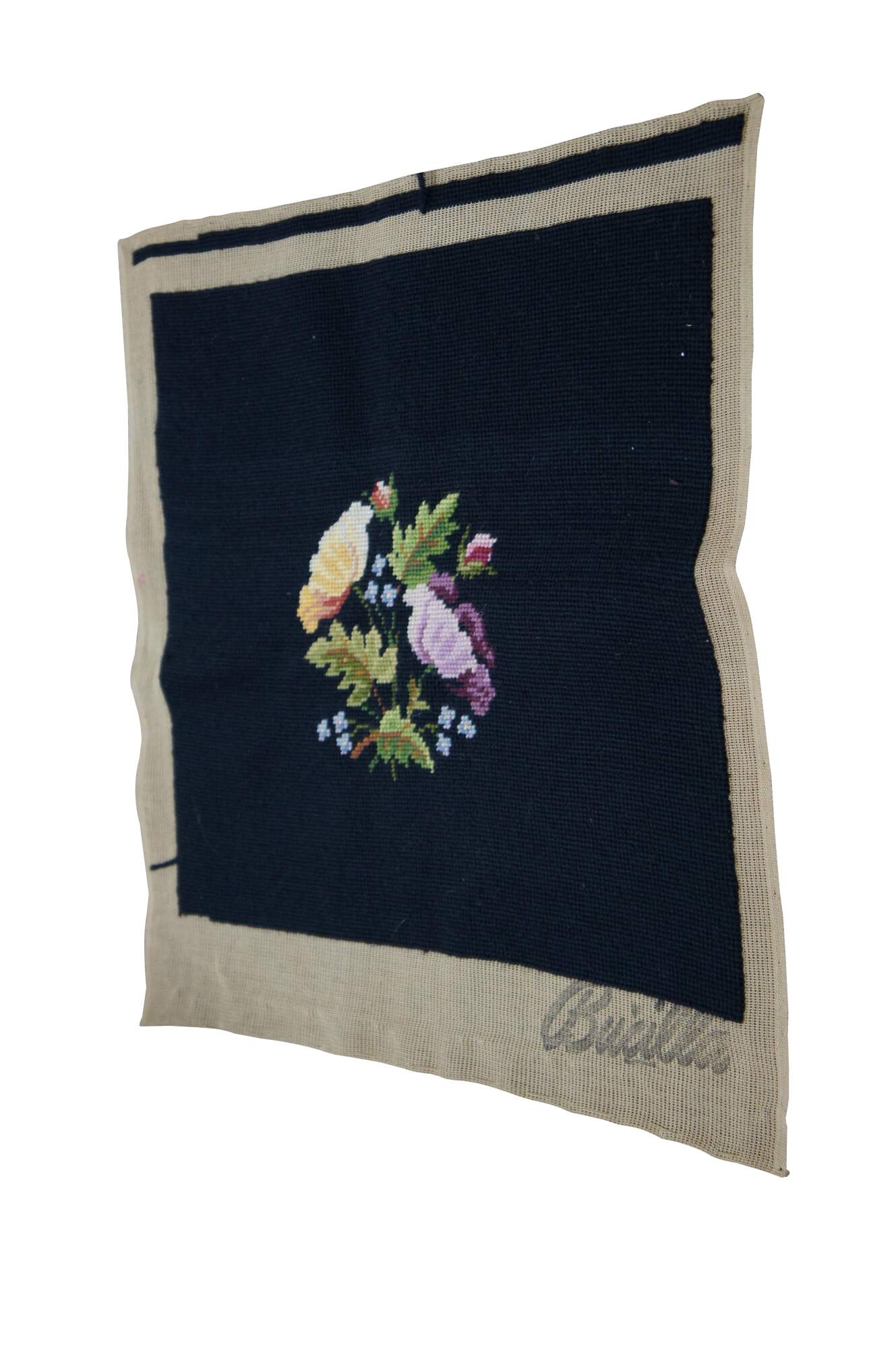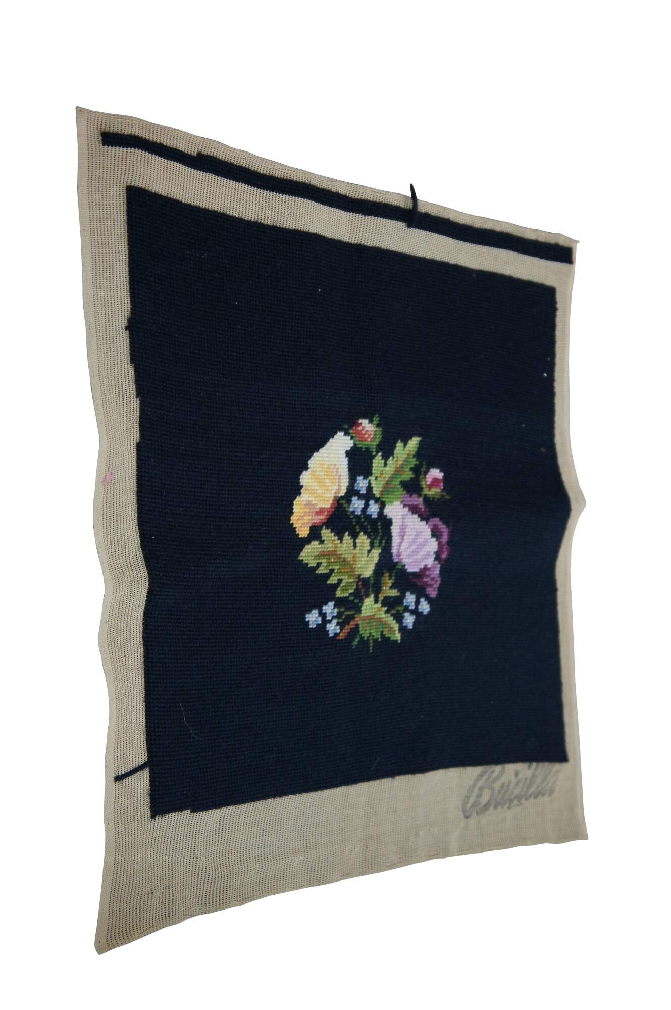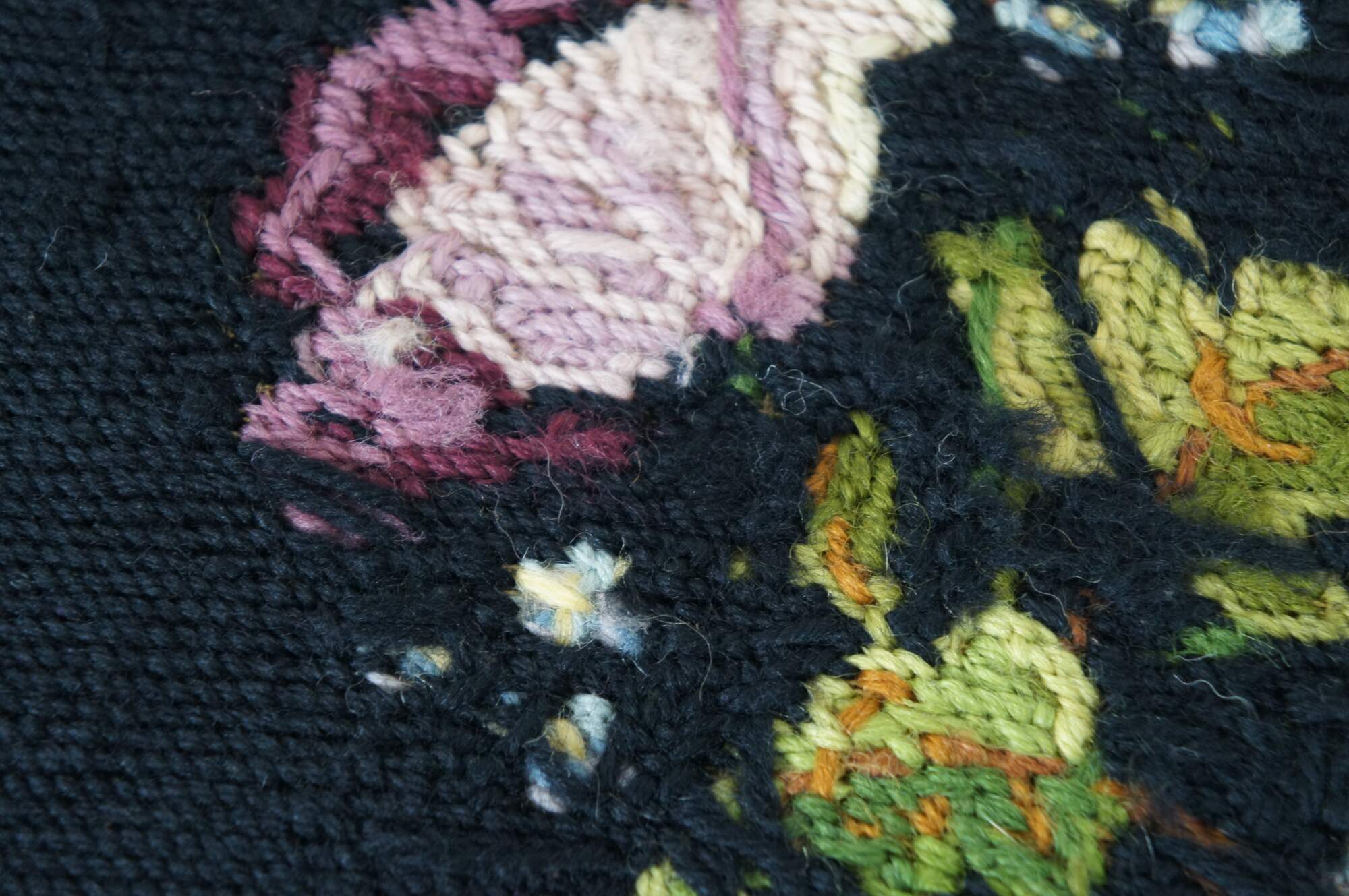 Vintage Bucilla needlepoint tapestry featuring floral motif in black with green, purple and yellow. Seat cover, pillow, foot stool, ottoman, chair, seat.