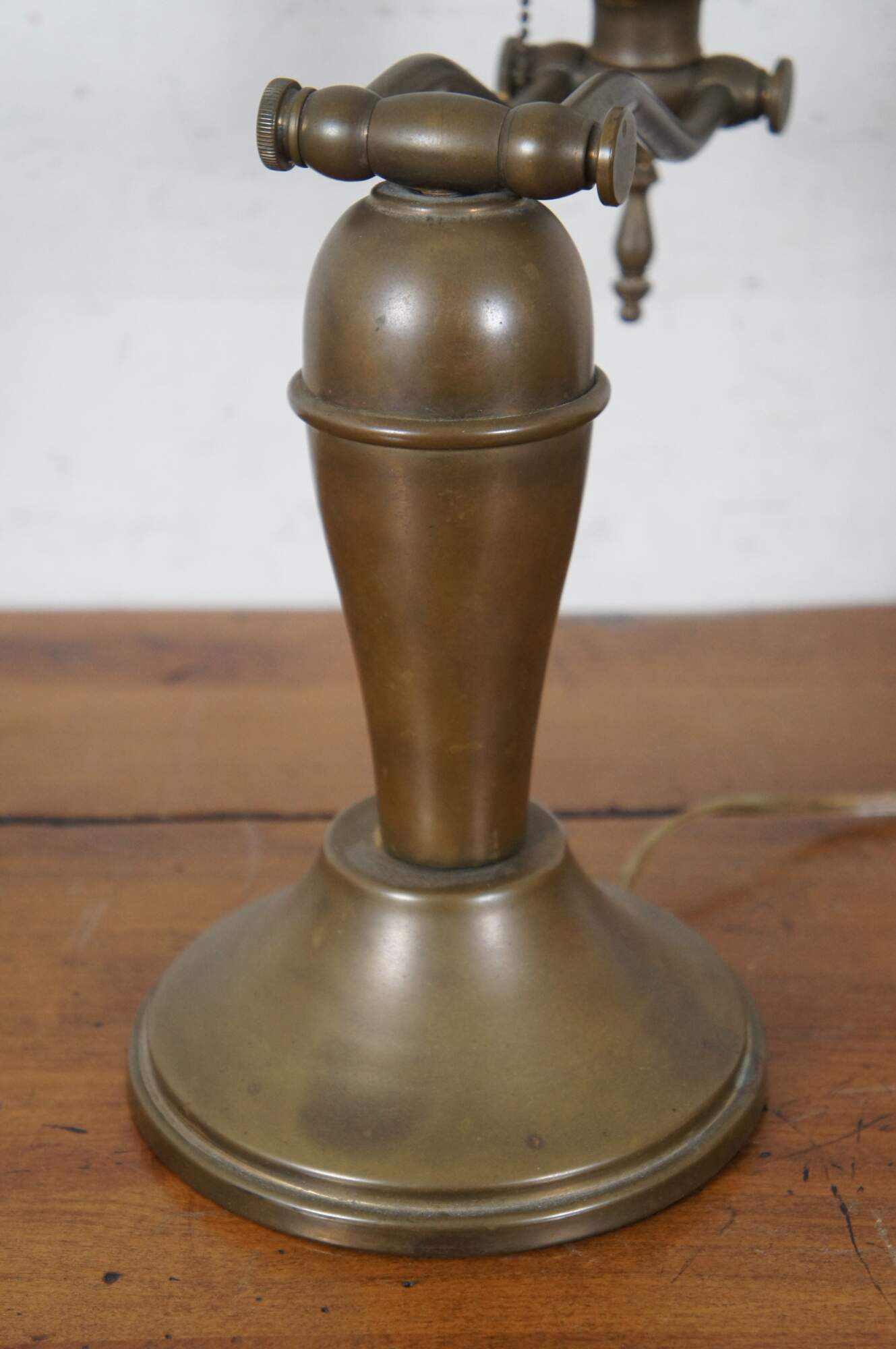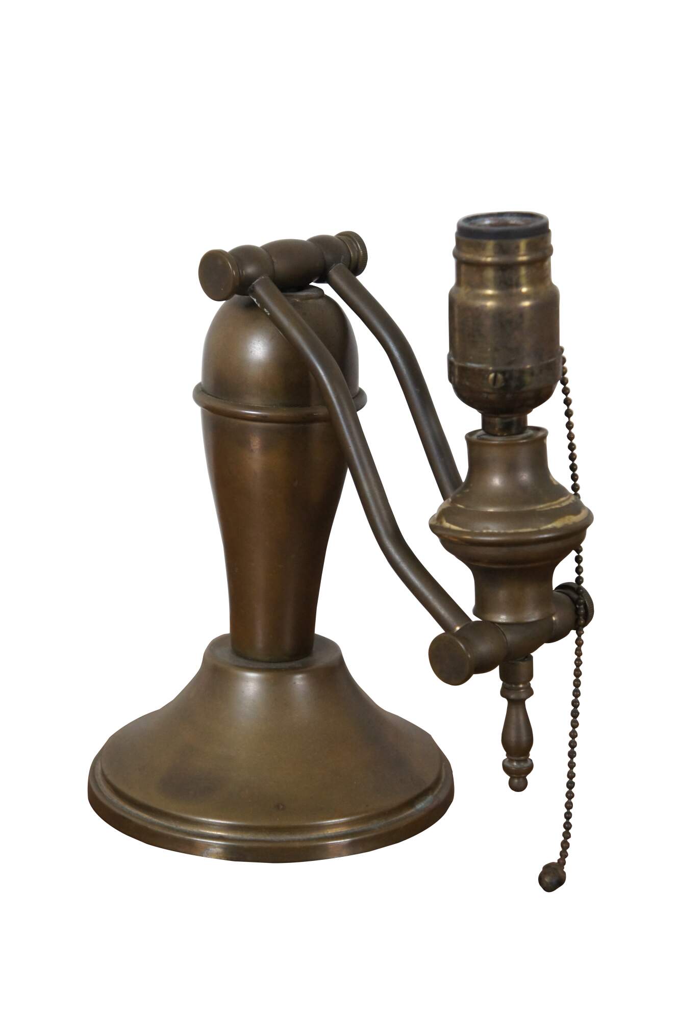 Vintage brass vanity desk / table lamp featuring articulating swing arm with pull chain, Hubbell socket and La Mode shade.