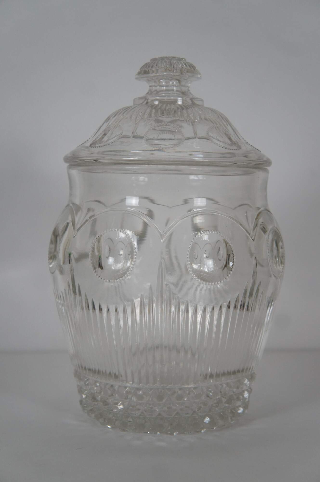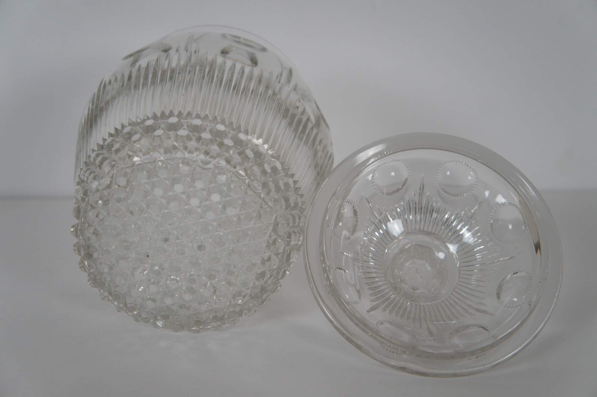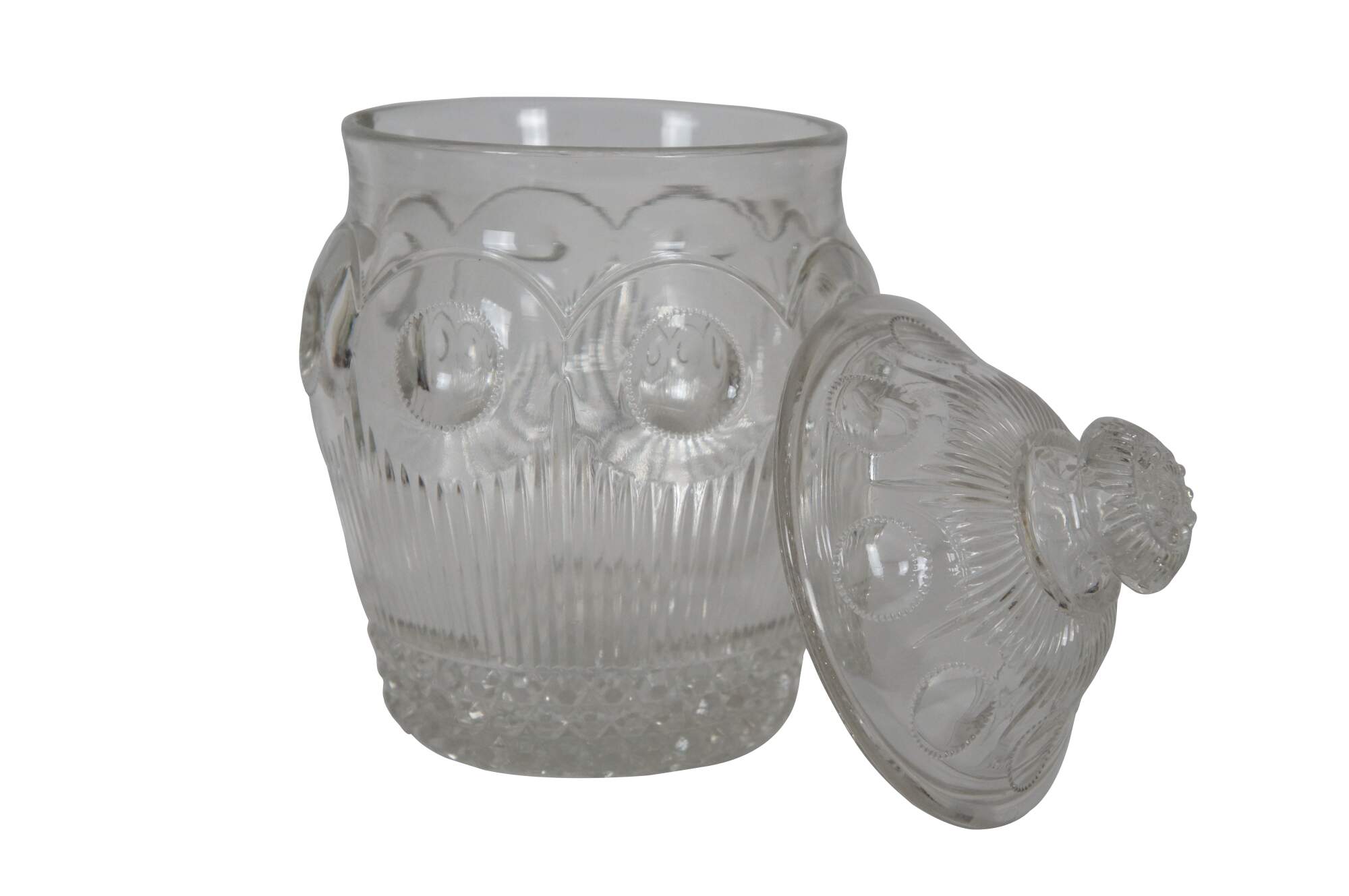 Art Deco era lidded glass jar with fluting and thumbprint pattern. Features matching lid.