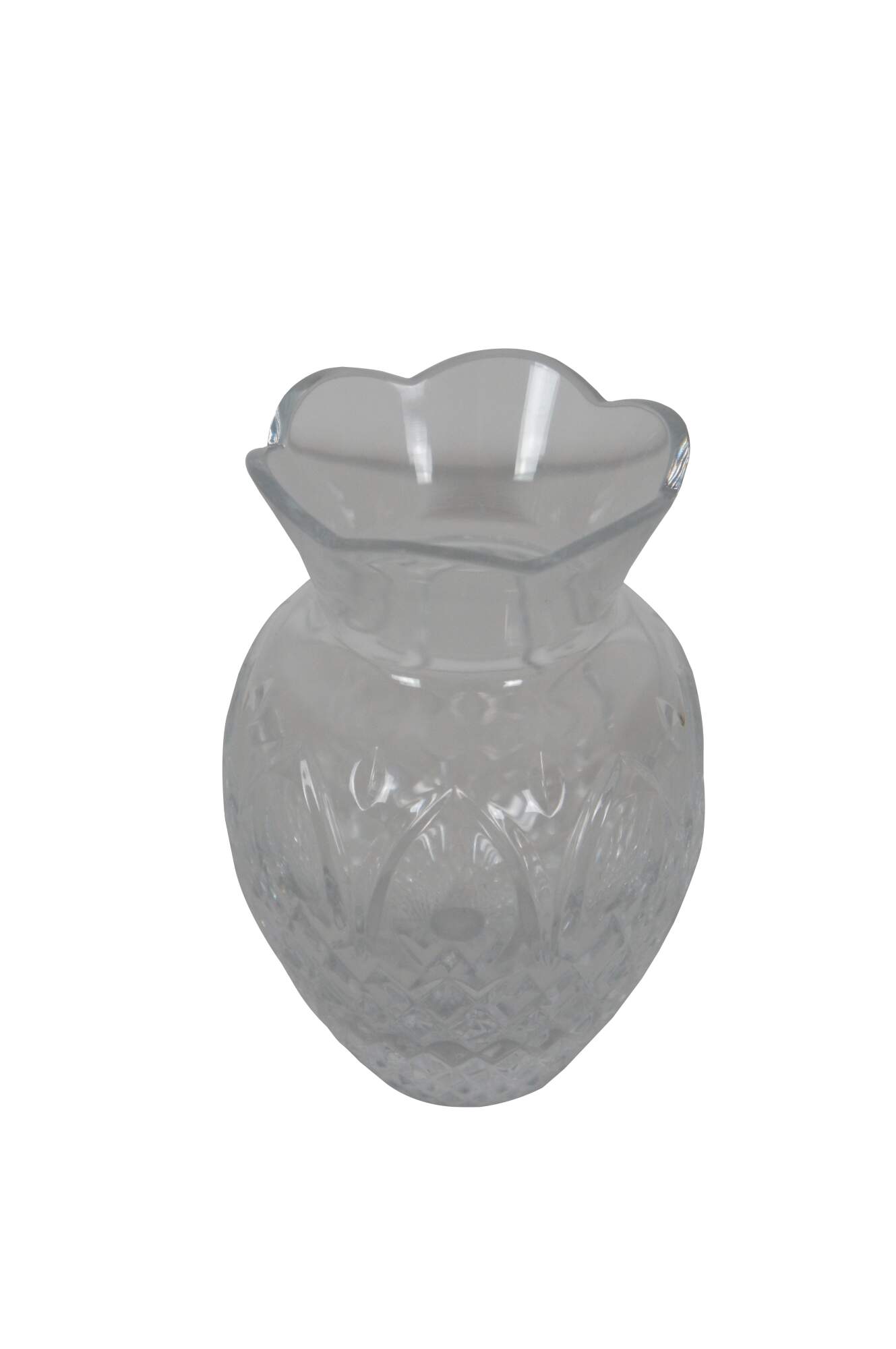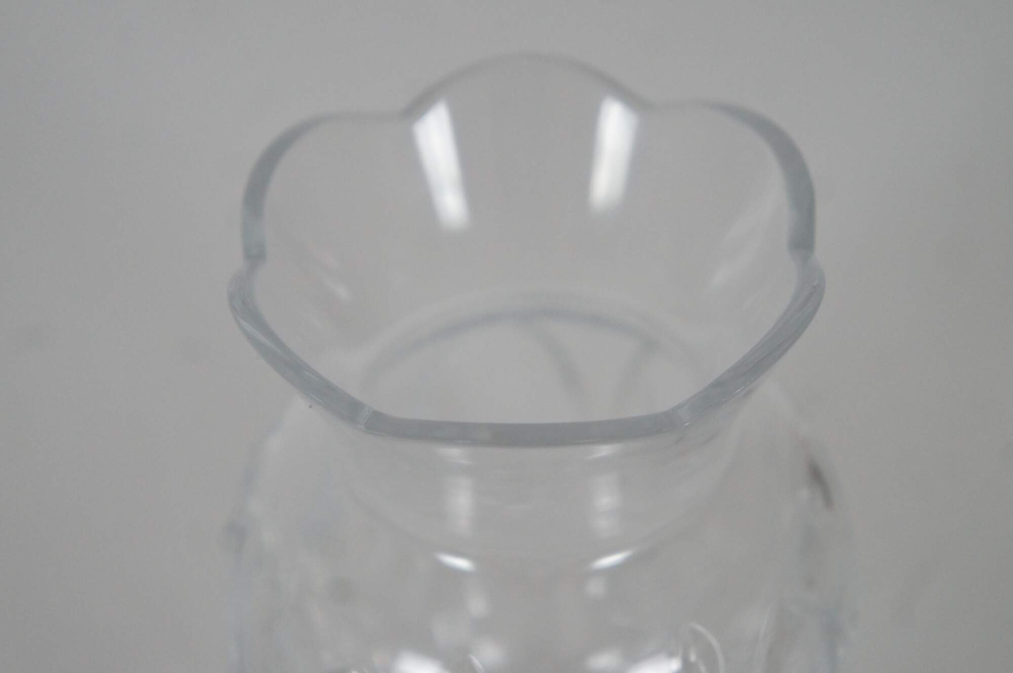 Vintage cut crystl signed bud vase. Features a diamond gridded design. Bottom is signed a double swirl mark.