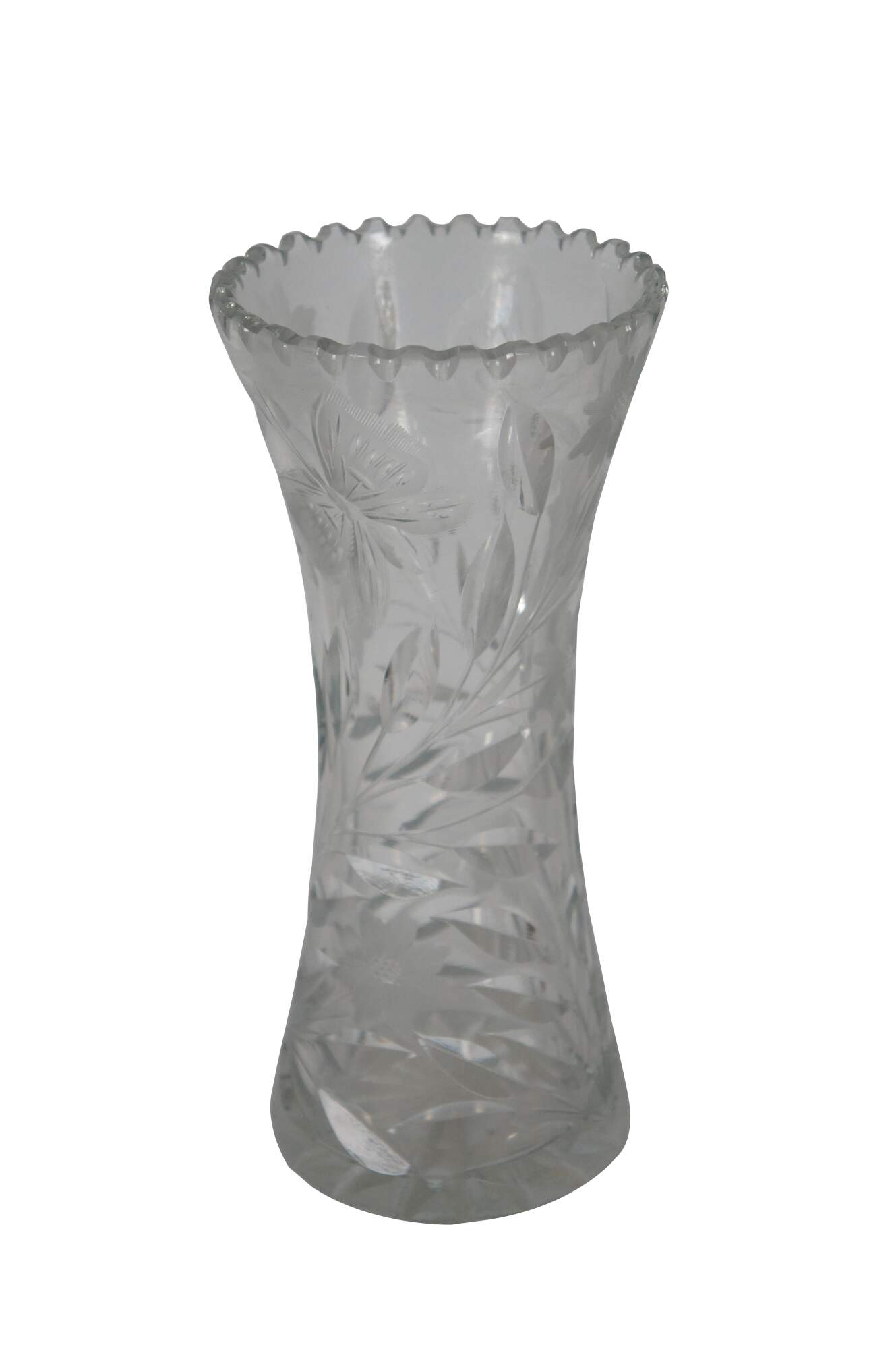 Vintage Brilliant Cut Glass Flower Vase. Features a deep cut floral pattern with butterflies and sawtooth edge.