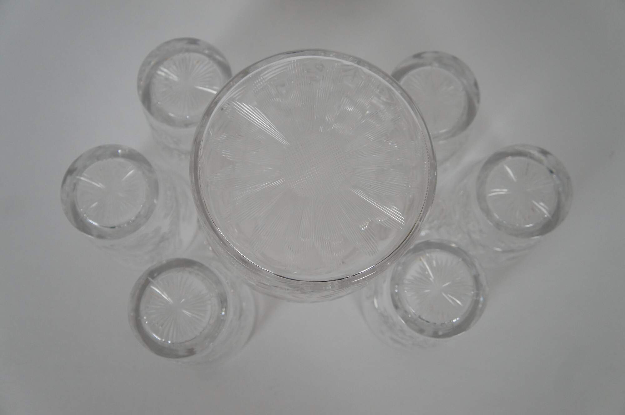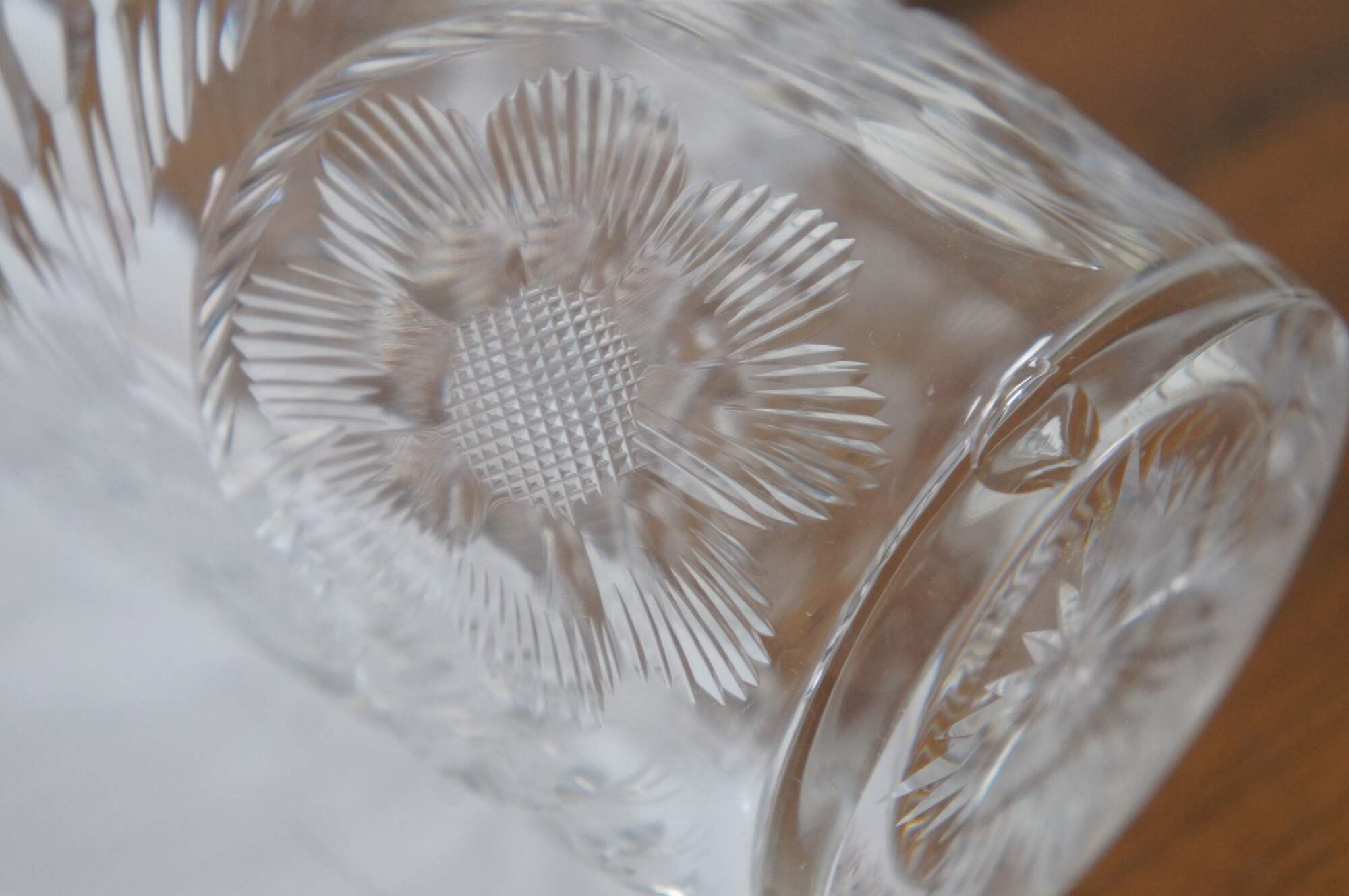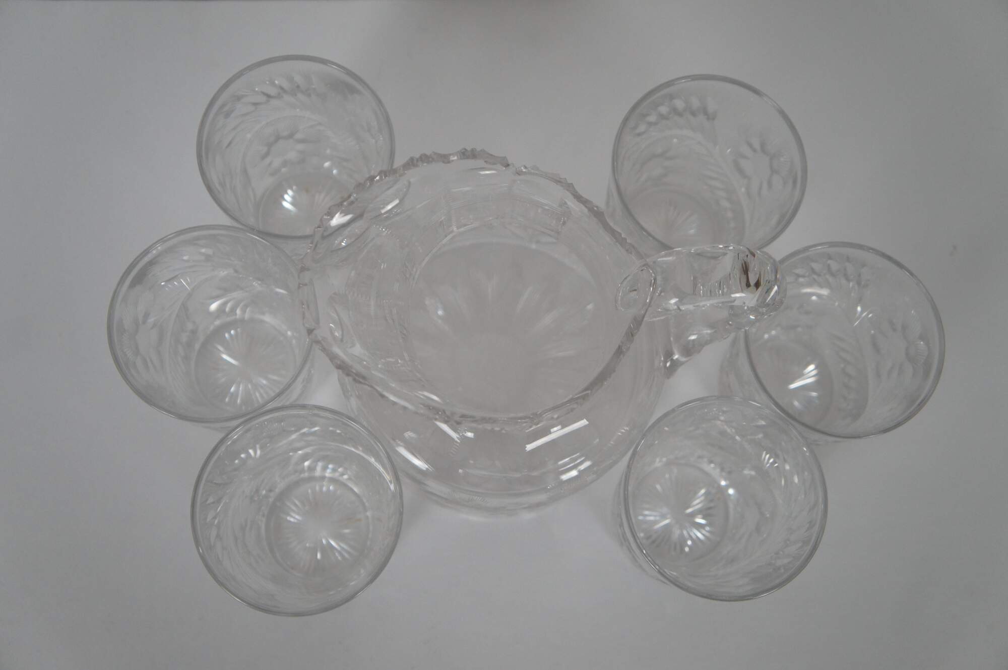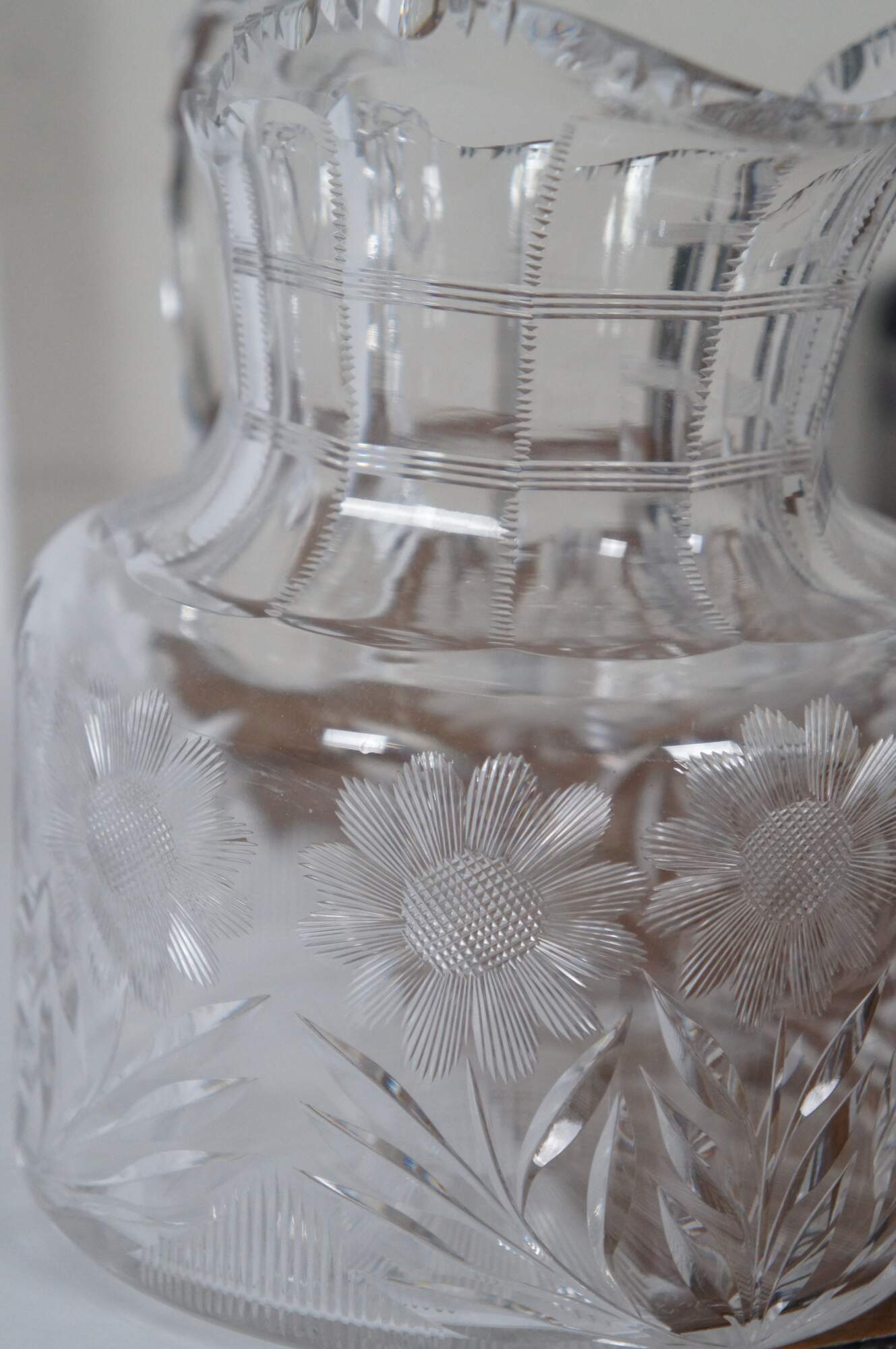 Antique heavy cut crystal pitcher and six tumbler glasses featuring floral daisy design.