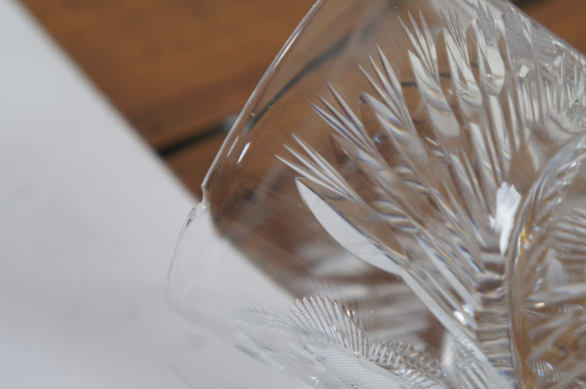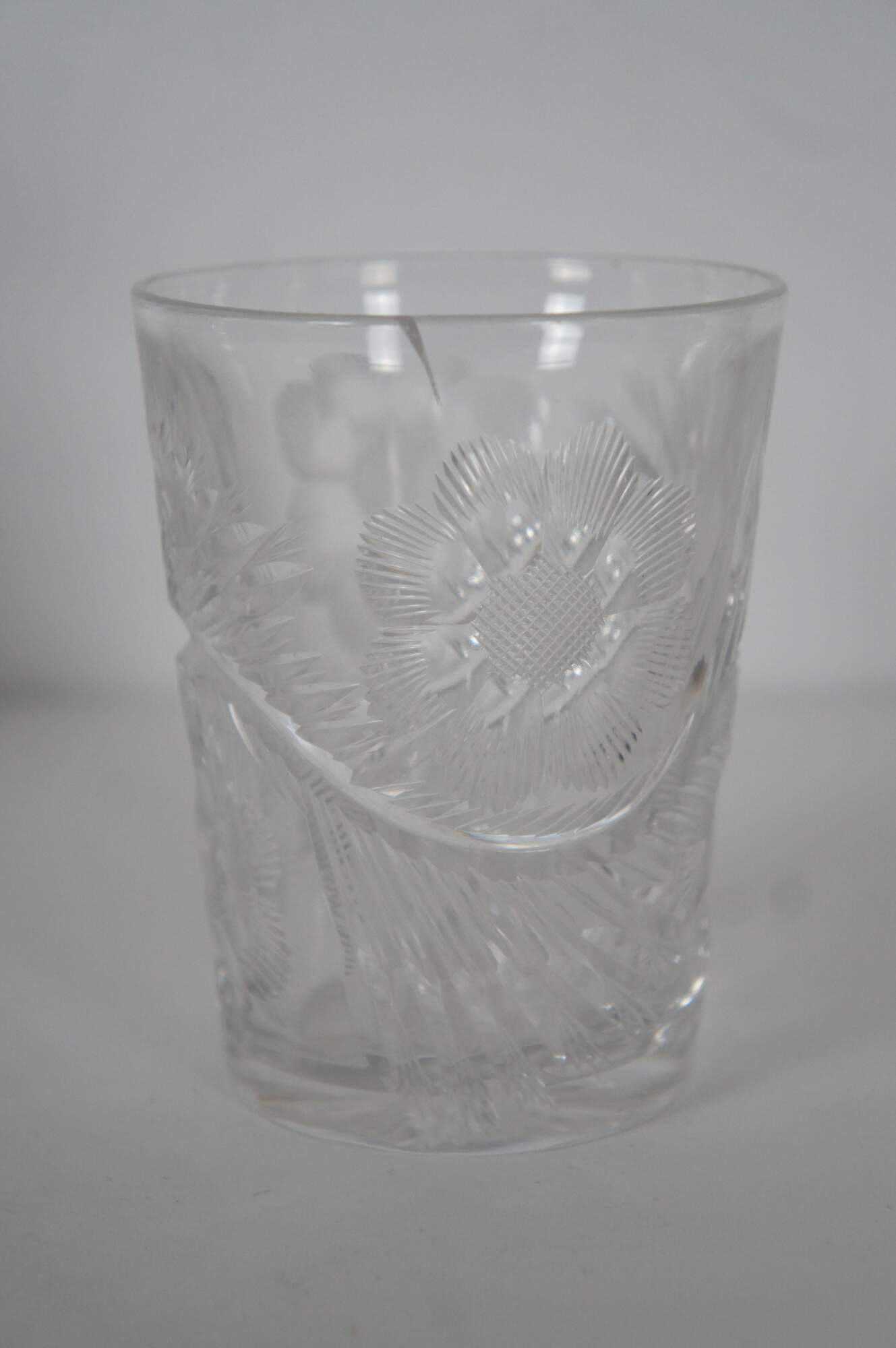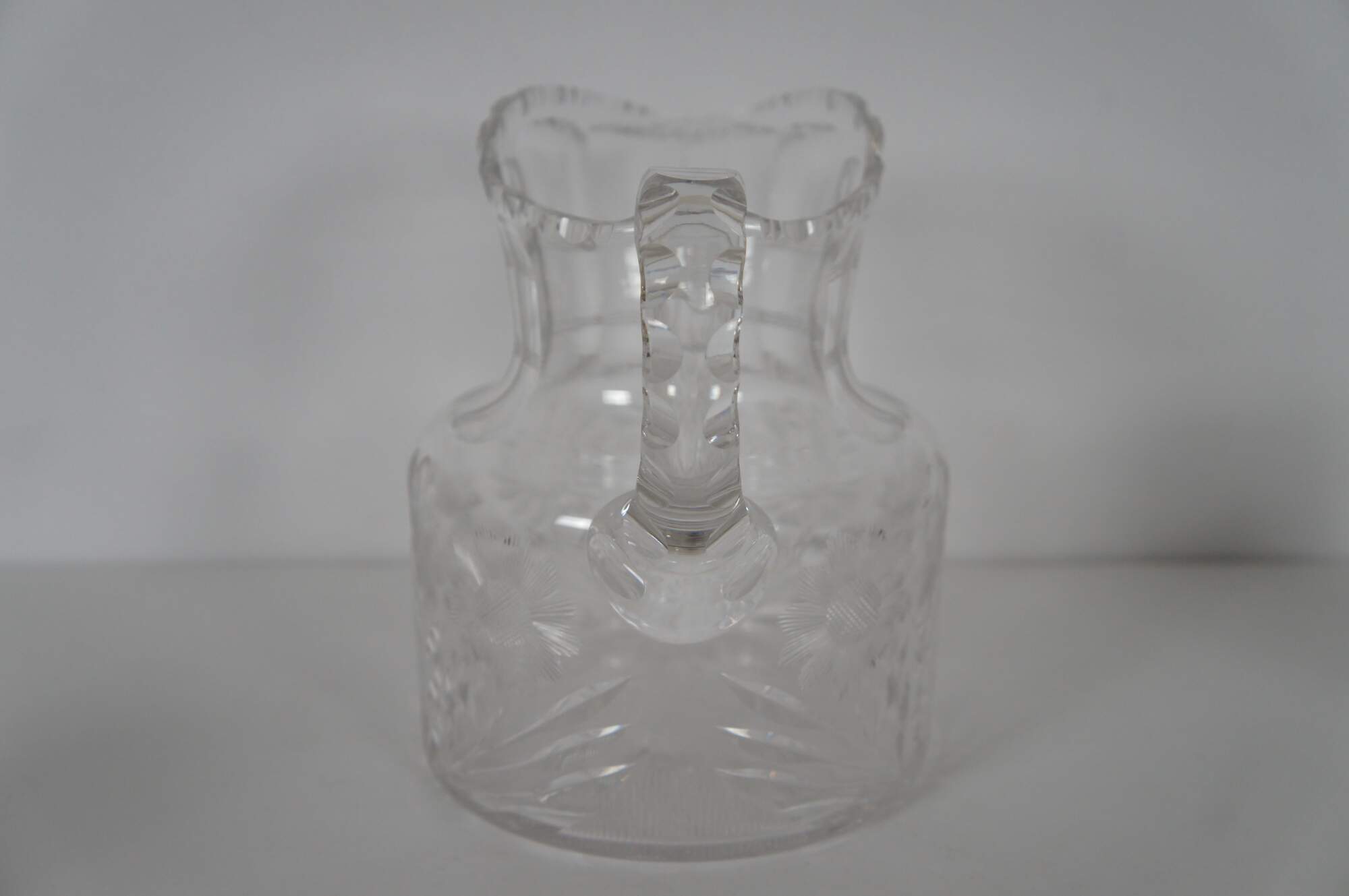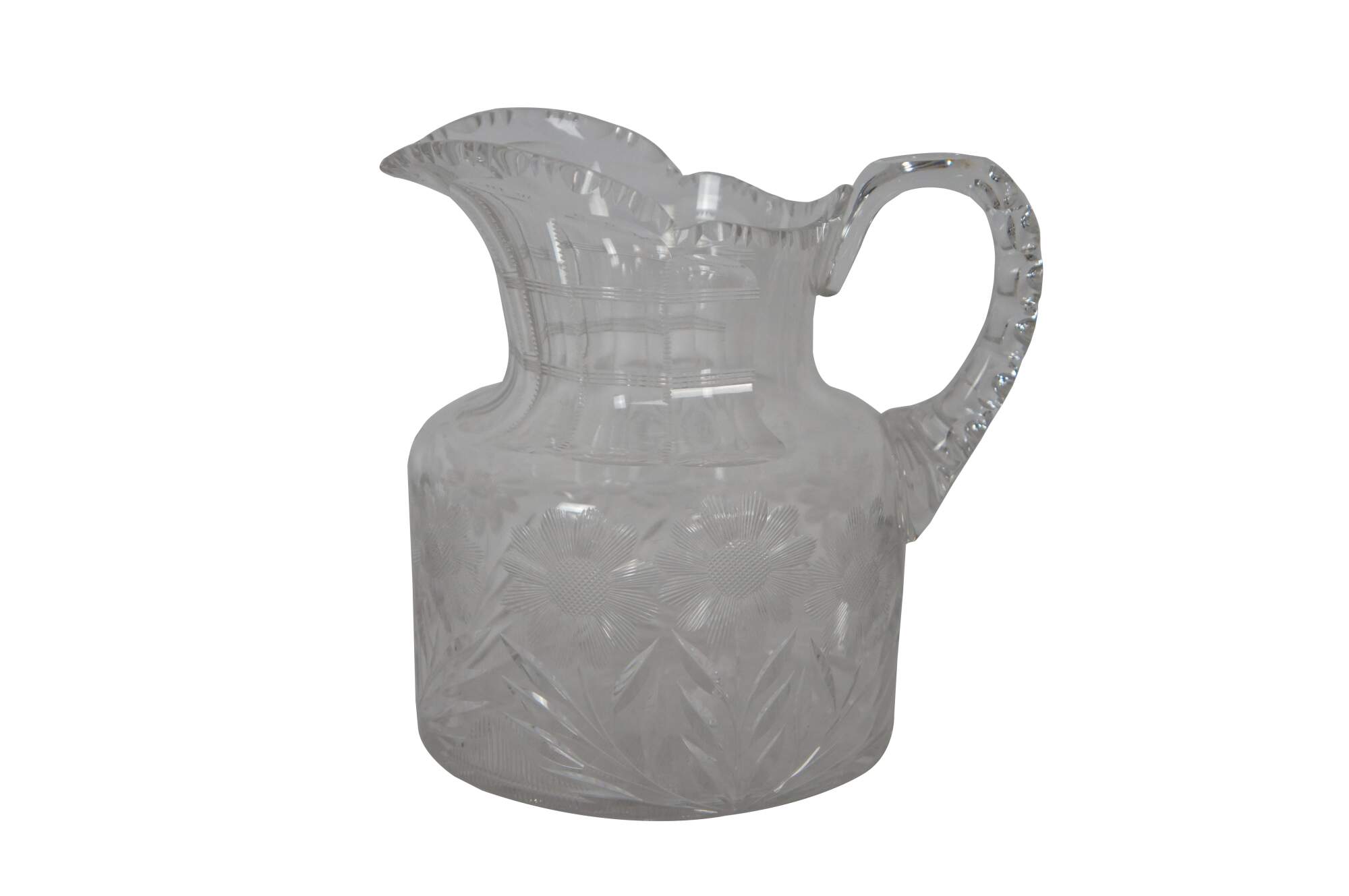 Antique heavy cut crystal pitcher and six tumbler glasses featuring floral daisy design.