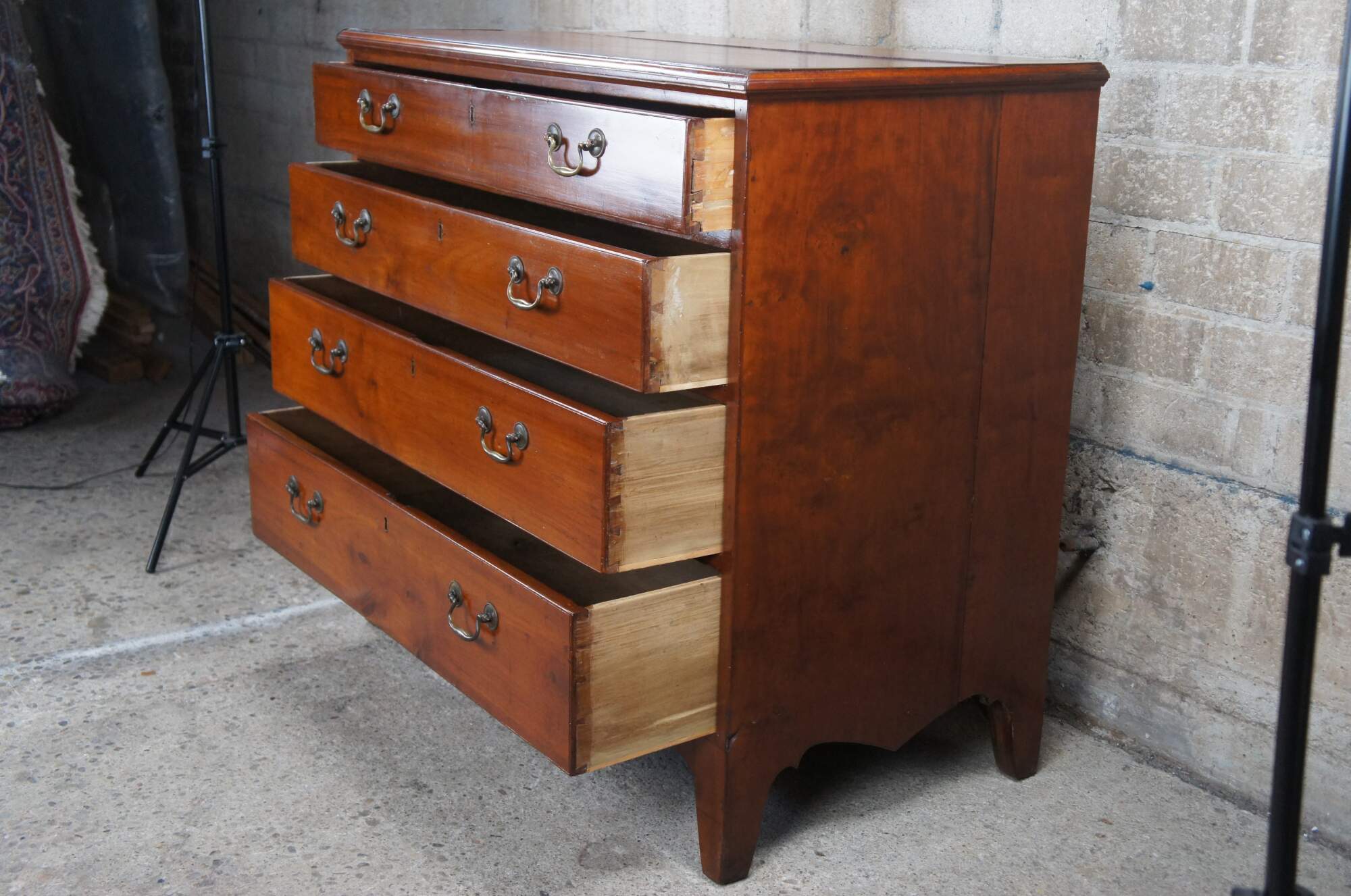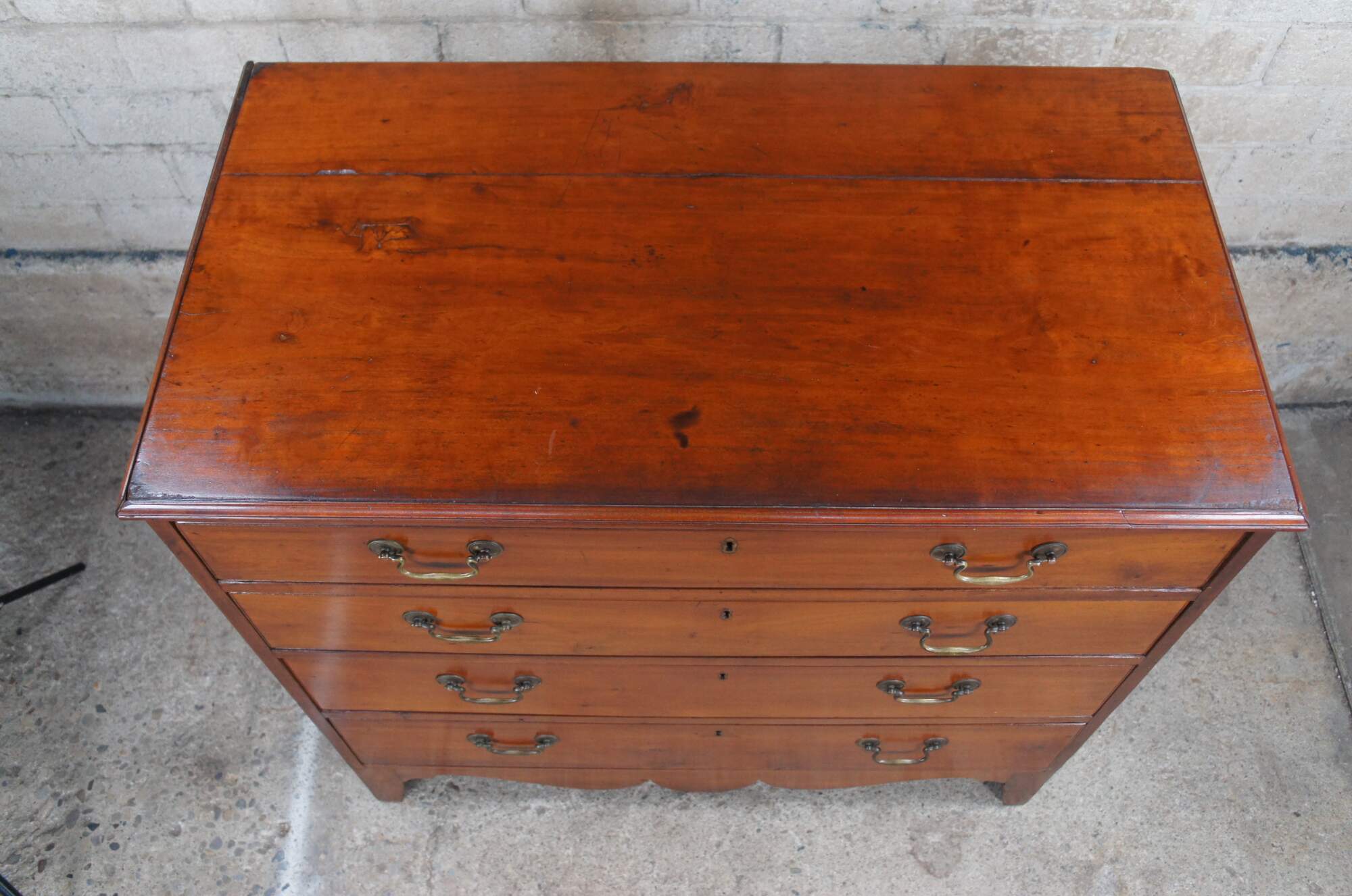 Antique early American dresser or chest of drawers. Made of cherry featuring four hand planed and dovetailed drawers with brass hardware and sepentine skirt. Circa early 19th century.