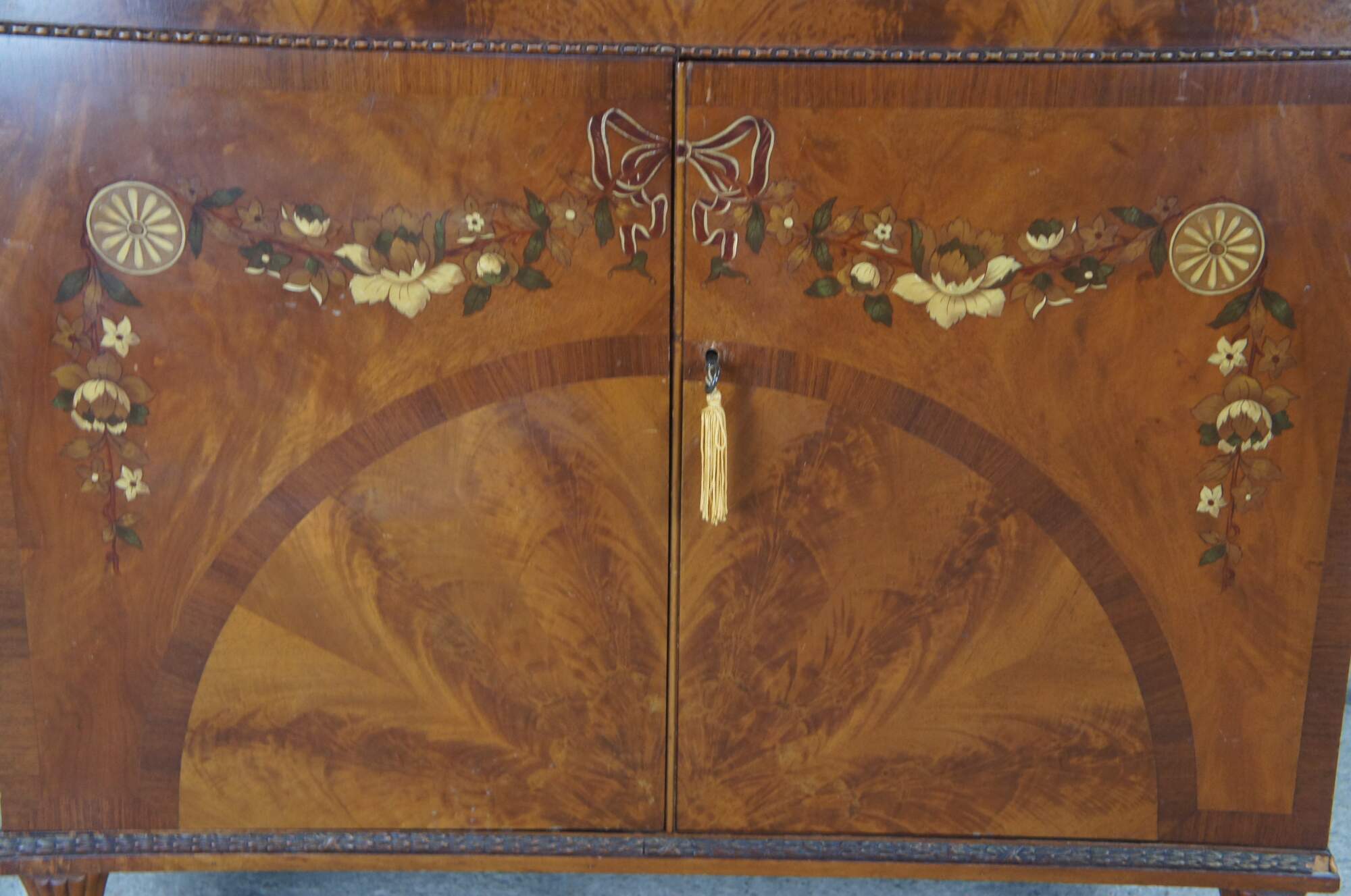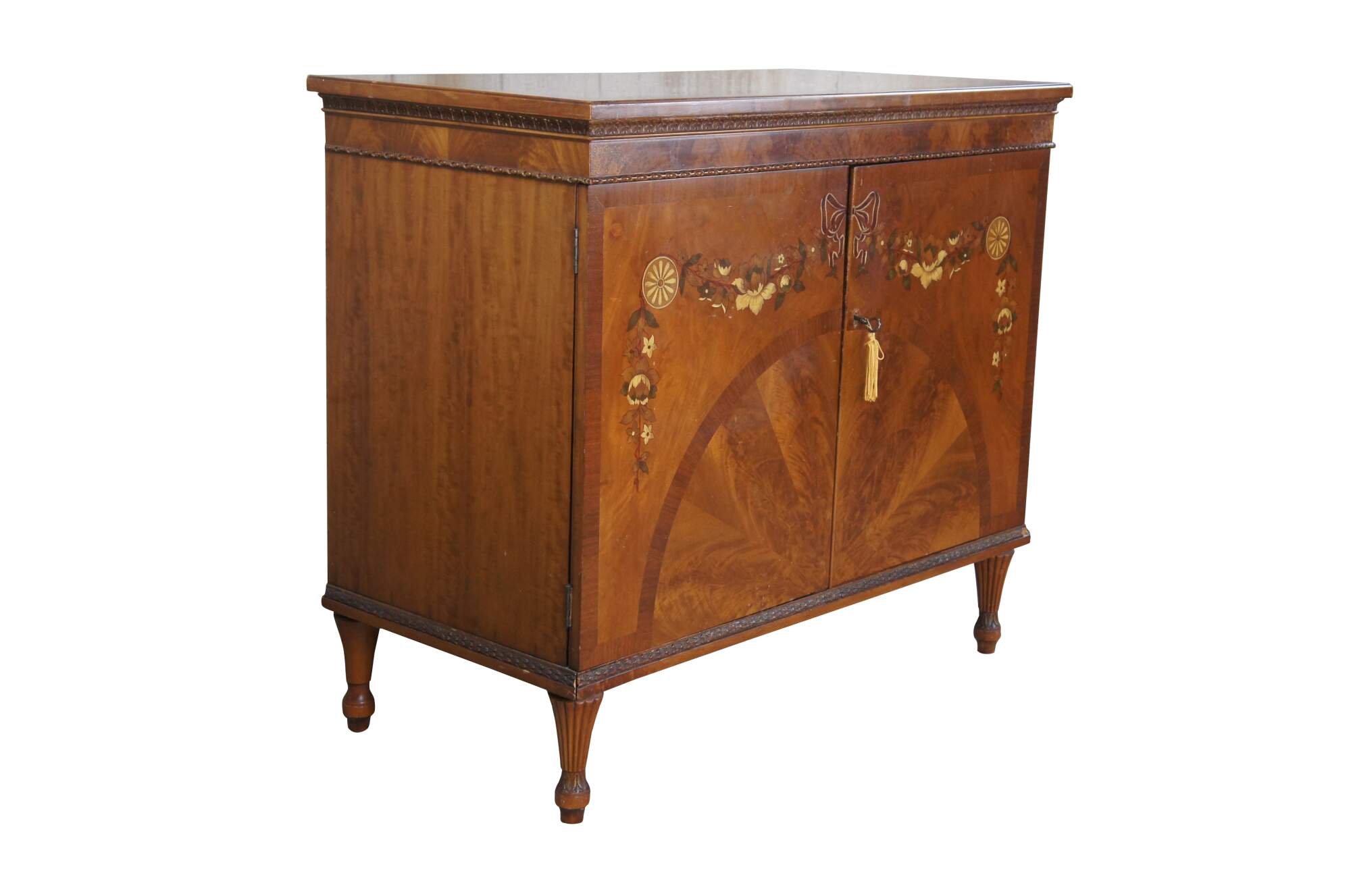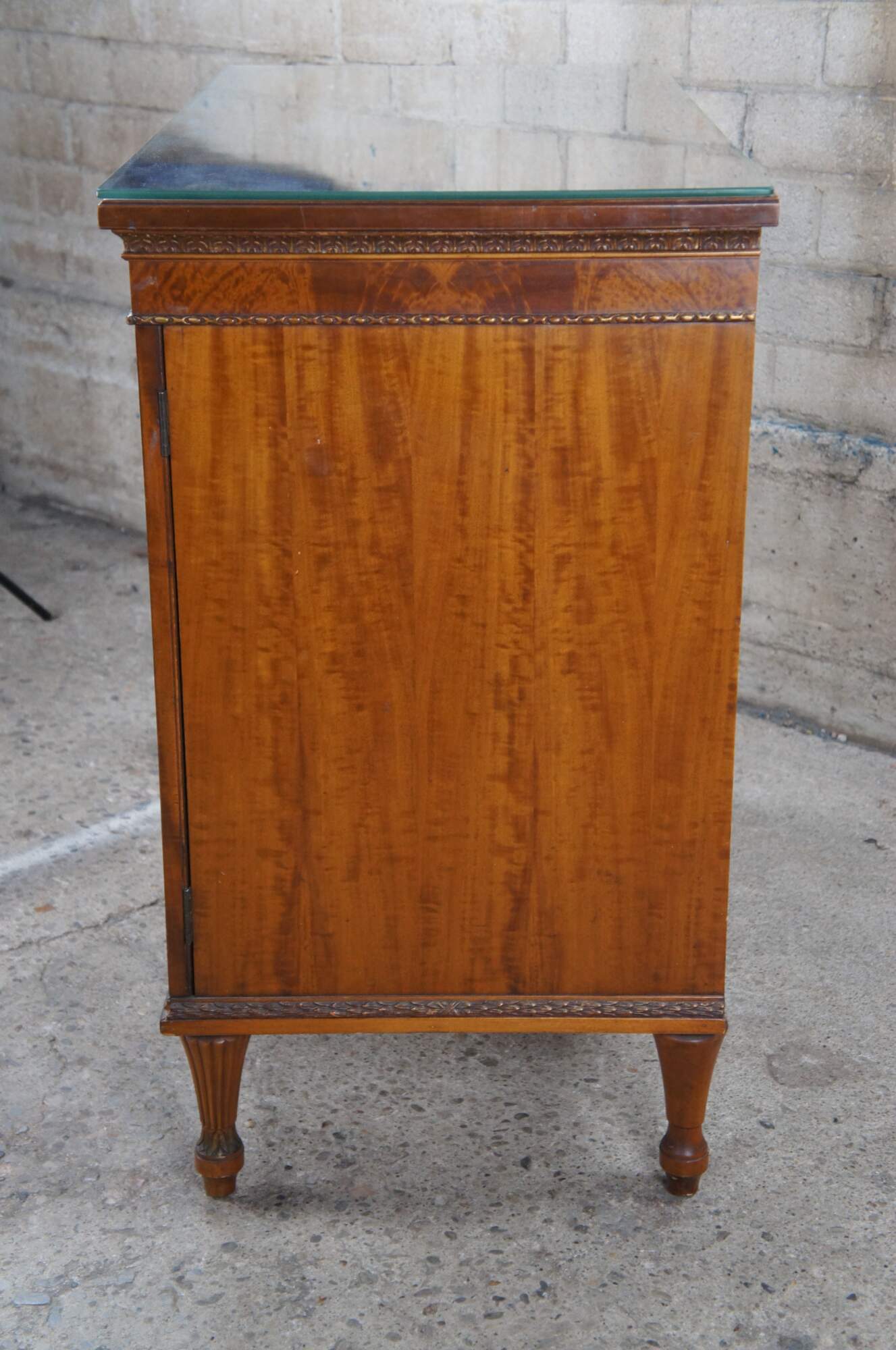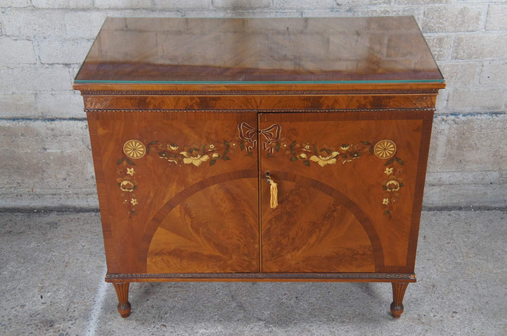 Antique satinwood buffet / cabinet / sideboard / console / Credenza / Huntboard featuring Italian Neoclassical and Art Deco styling with inlaid sunburst / starburst veneer surrounded by hand painted floral wreath with ribbons, bows and pinwheels. Marked Aspen 6276 along backside. The case is supported be reeded and tapered feet beneath a sheath apron. Include glass top with polished edge.