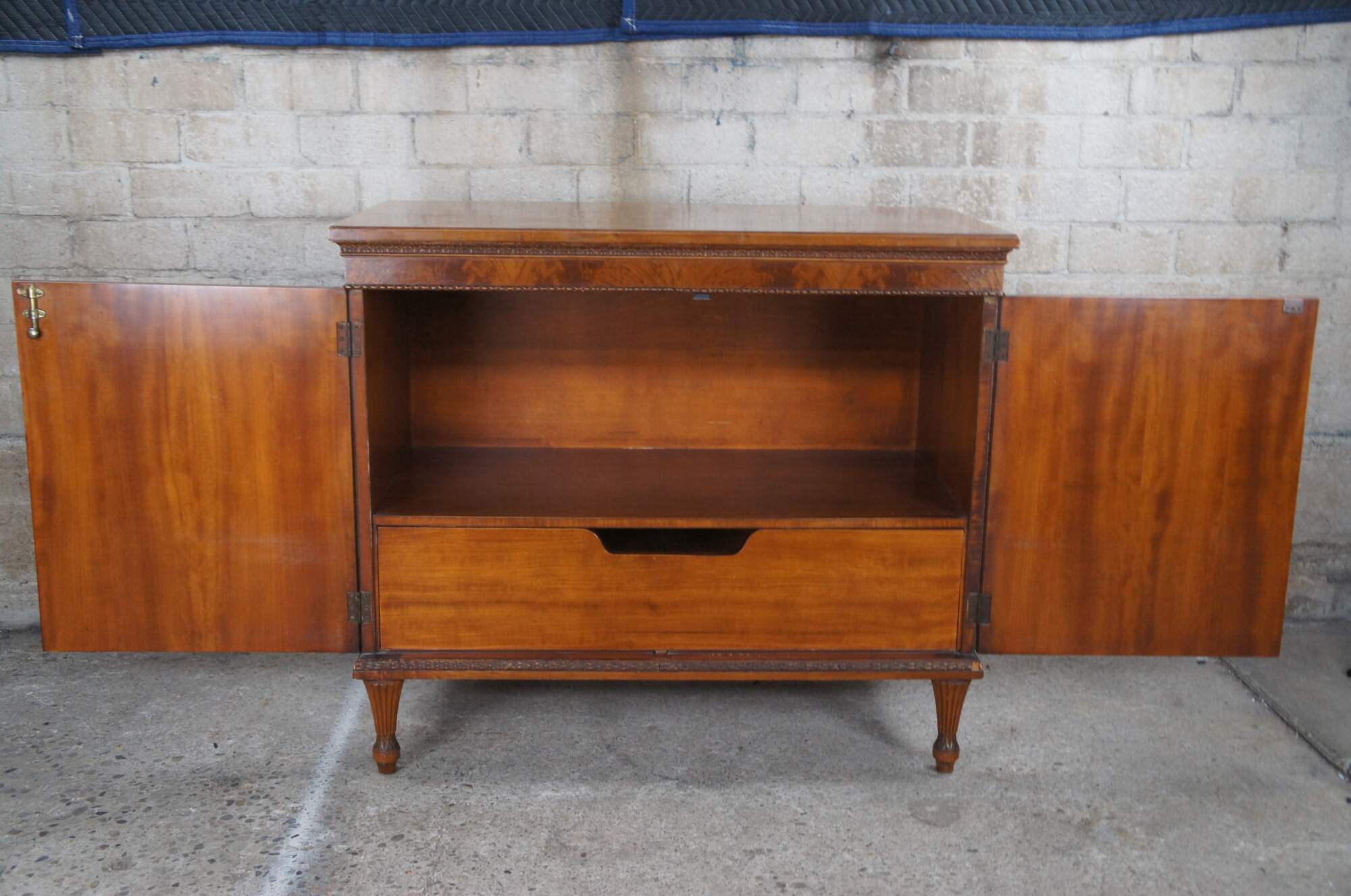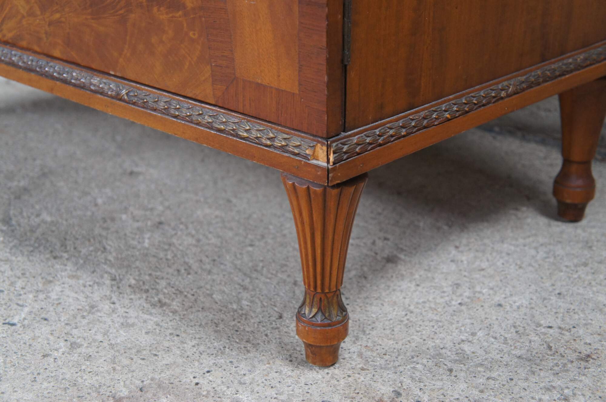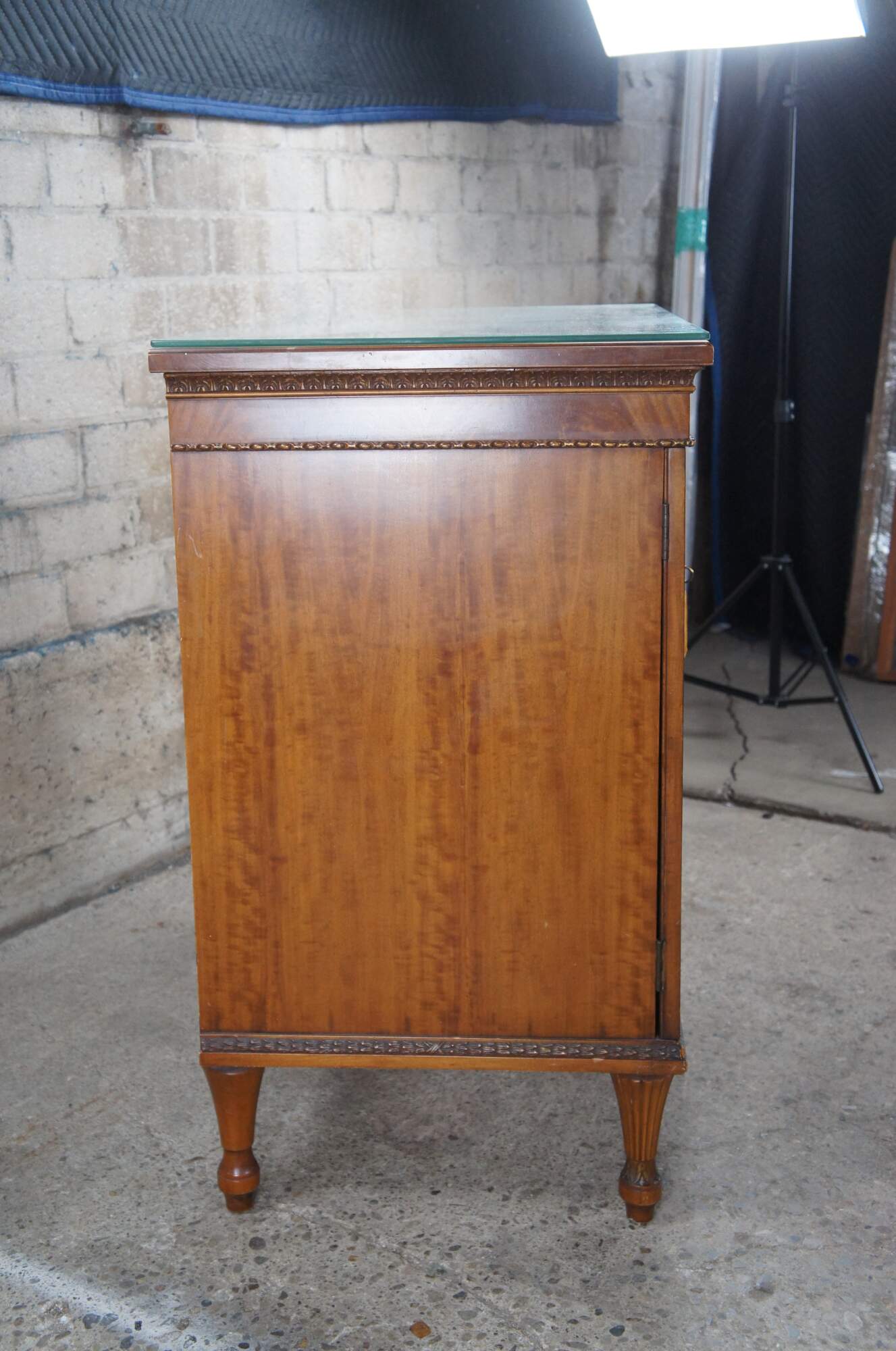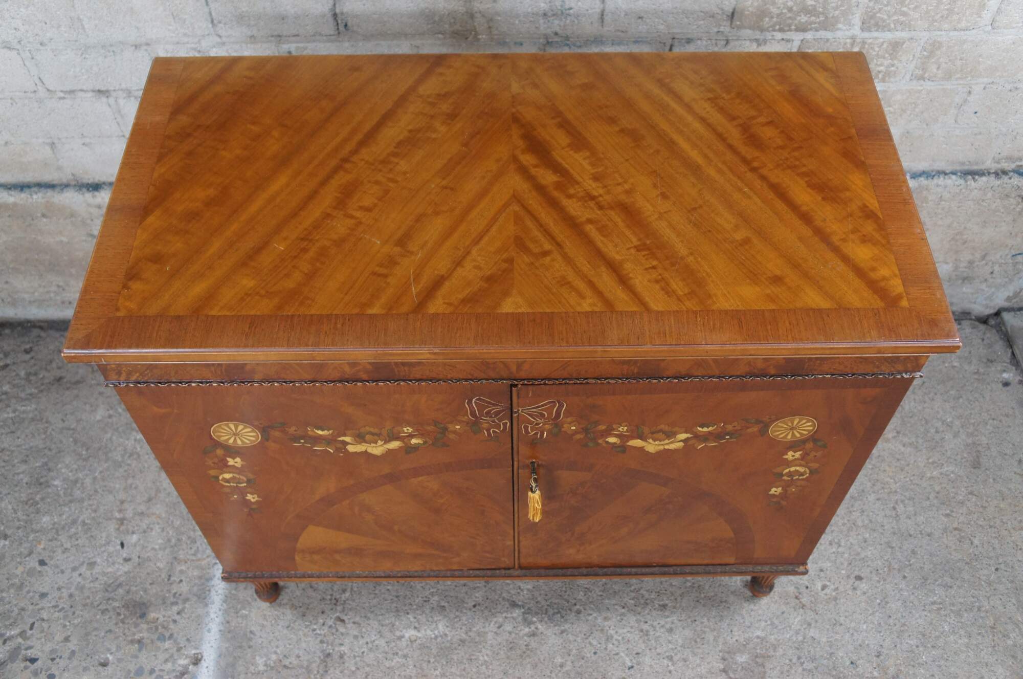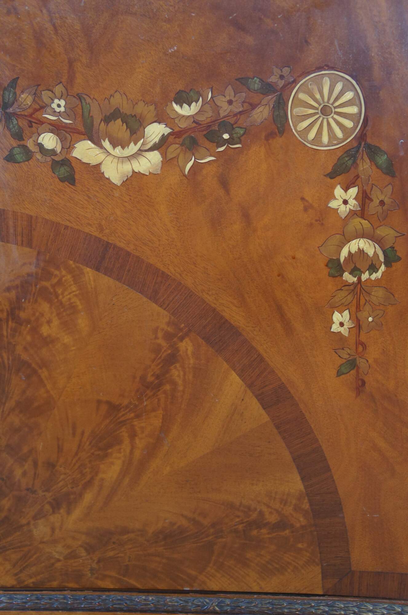Antique satinwood buffet / cabinet / sideboard / console / Credenza / Huntboard featuring Italian Neoclassical and Art Deco styling with inlaid sunburst / starburst veneer surrounded by hand painted floral wreath with ribbons, bows and pinwheels. Marked Aspen 6276 along backside. The case is supported be reeded and tapered feet beneath a sheath apron. Include glass top with polished edge.
