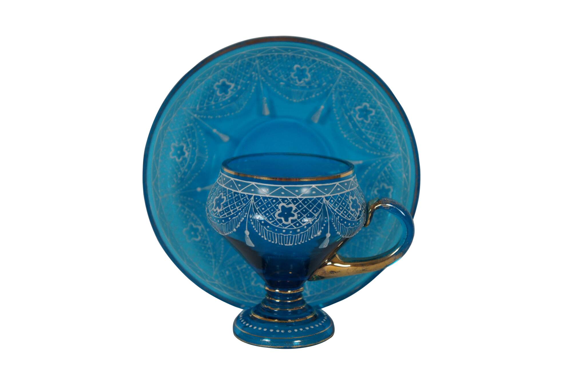 Vintage Moser Bohemian blue glass demitasse teacup and saucer featuring gold and white painted details.