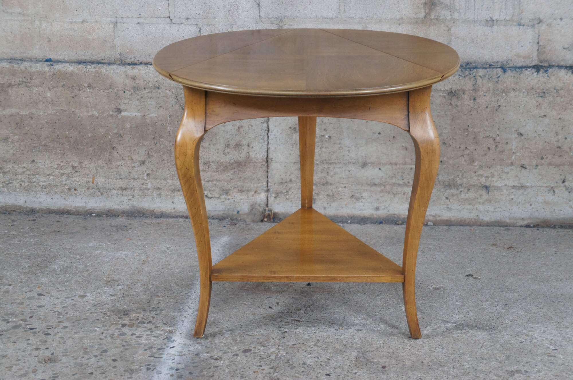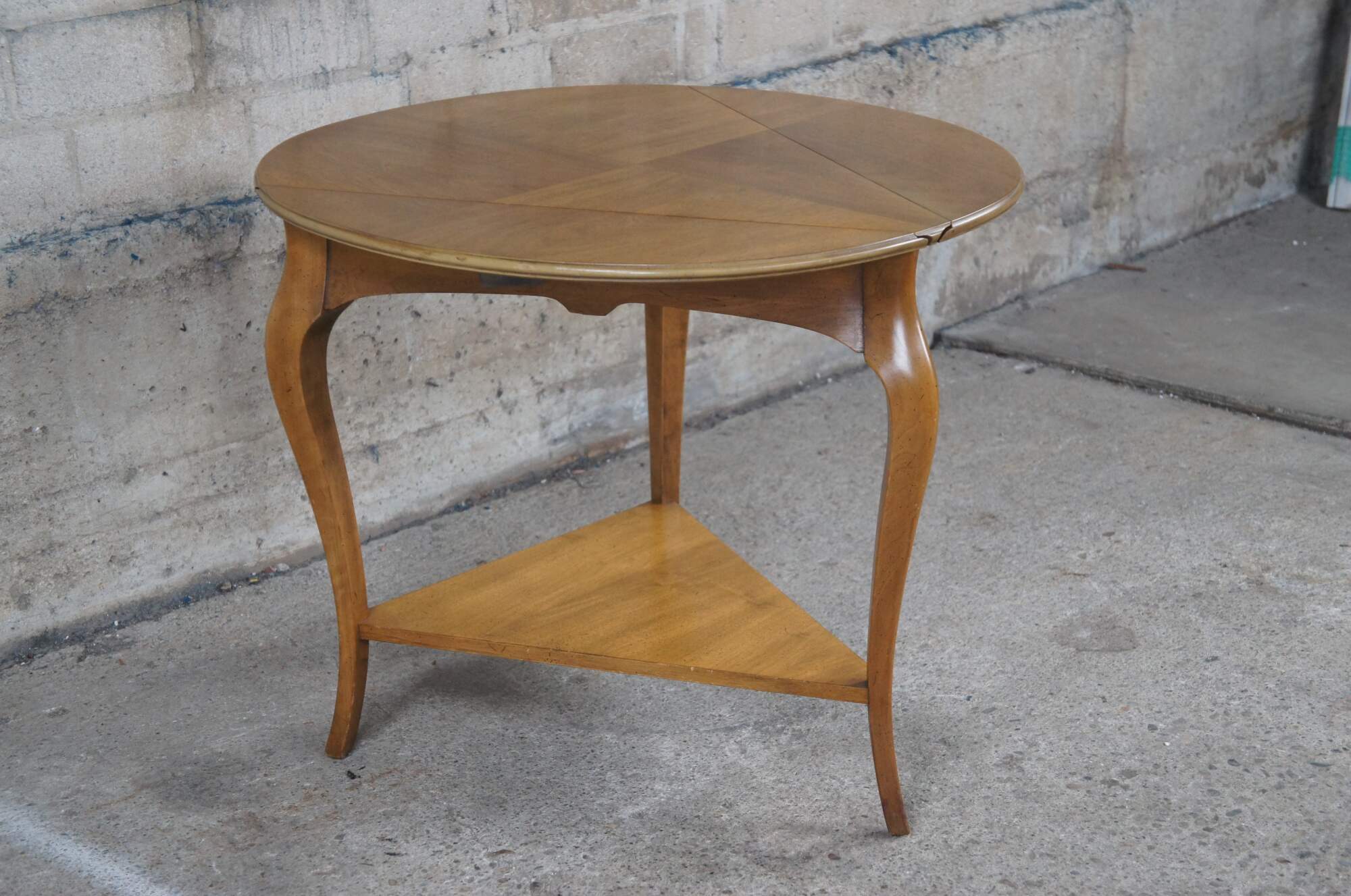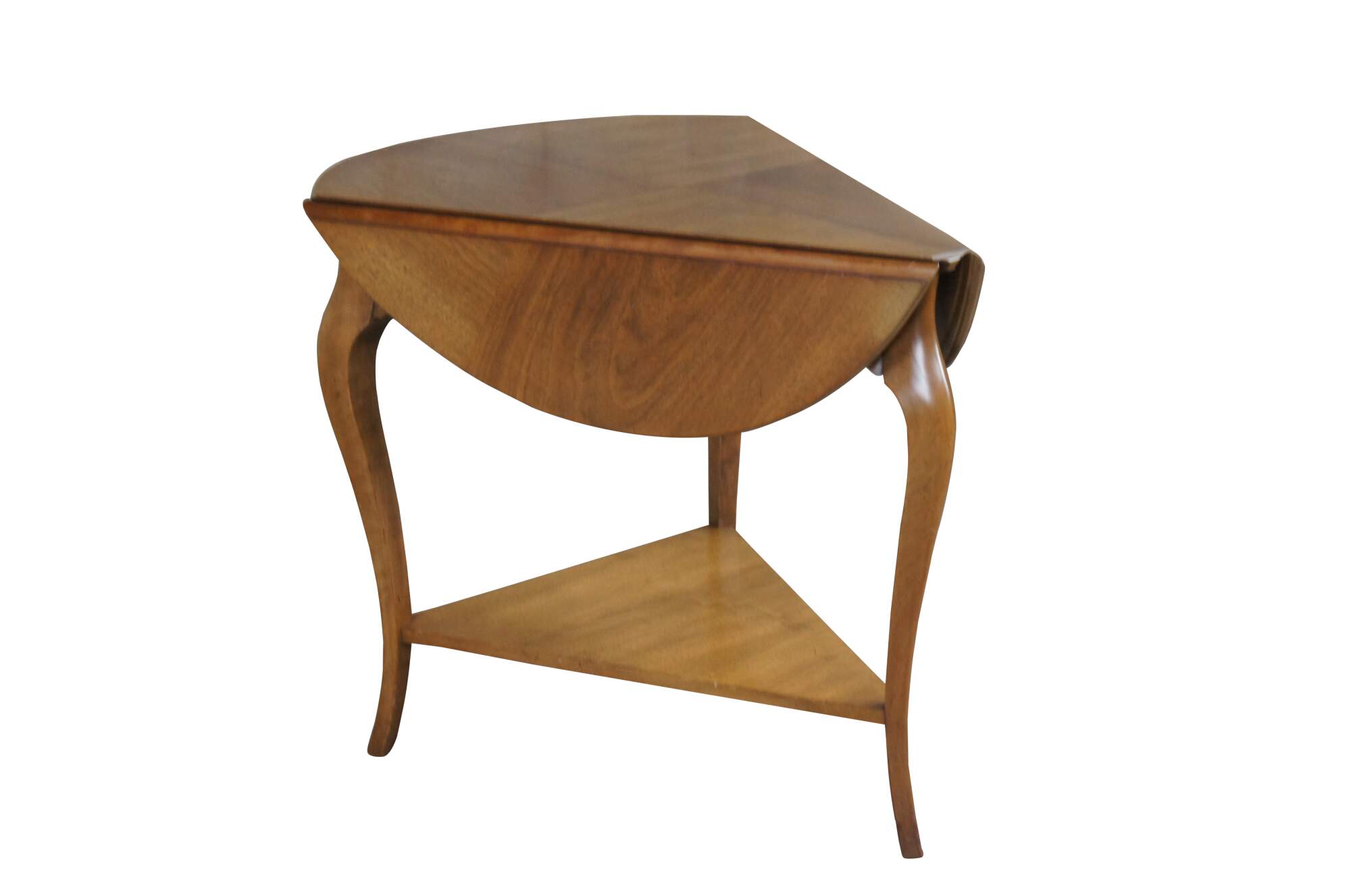 Vintage John Widdicomb handkerchief accent table, circa 1960s. Made of walnut featuring triangular form with two tiered drop leaf design, matchbook top and cabriole legs.