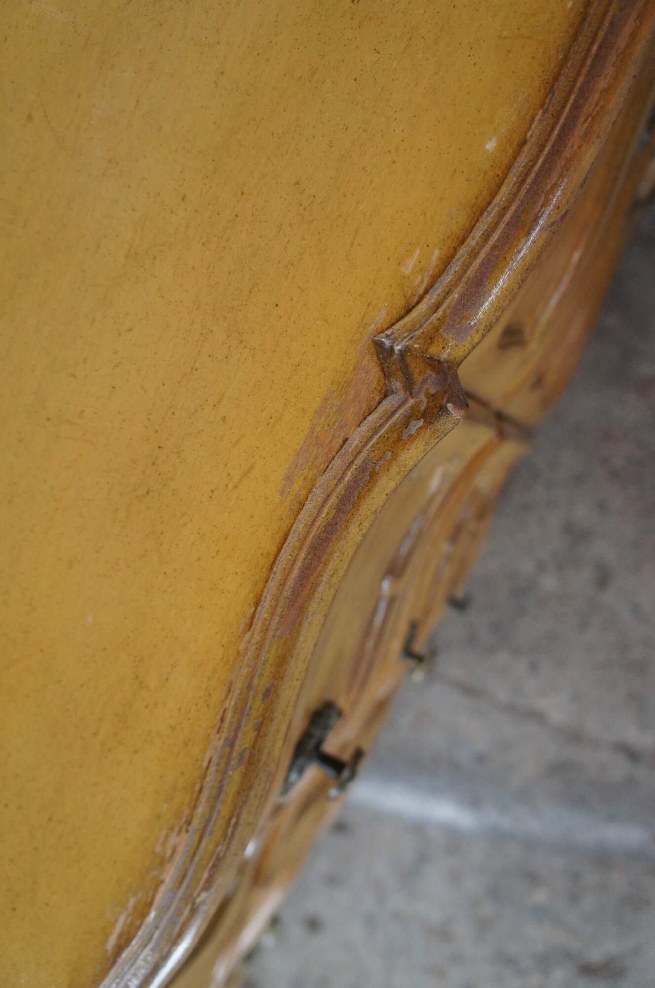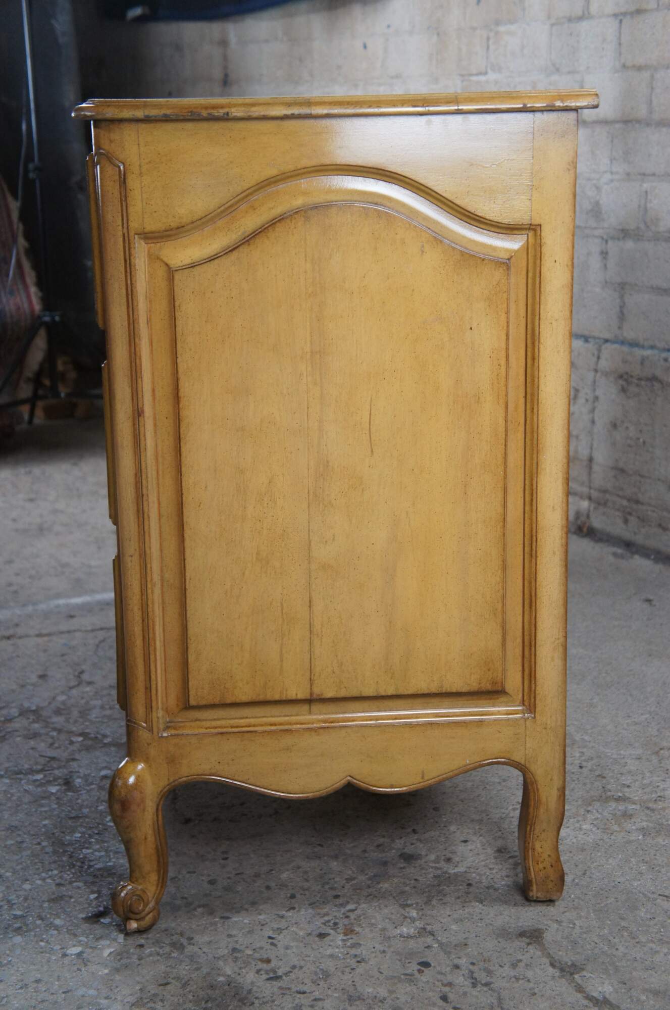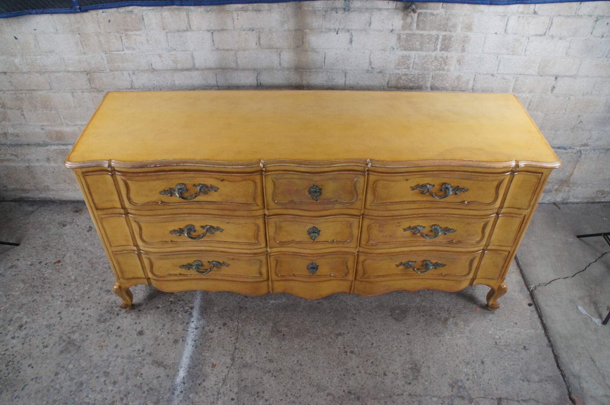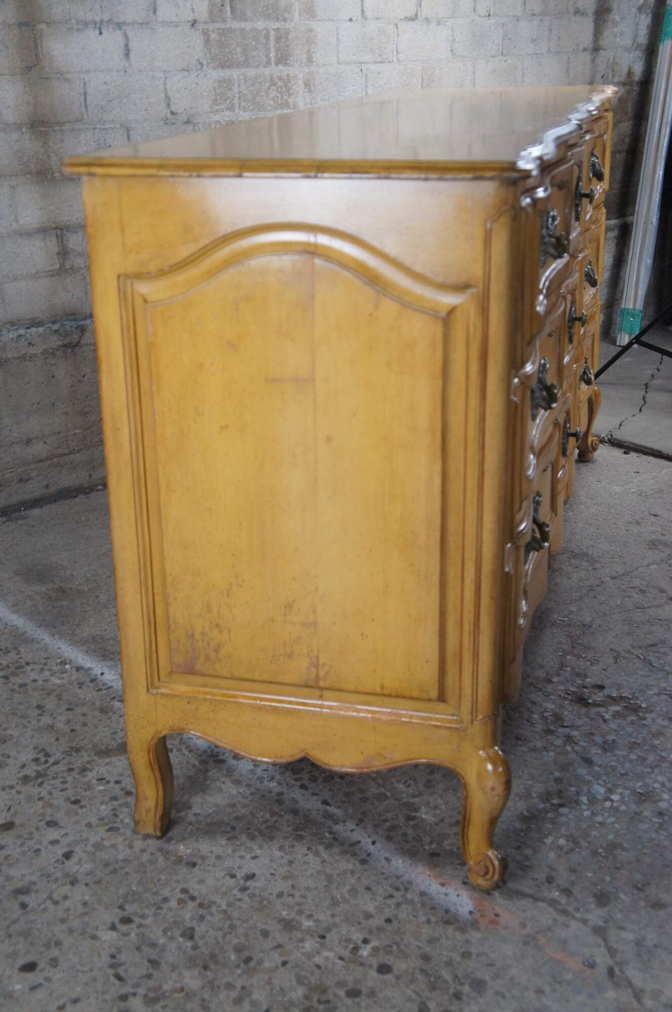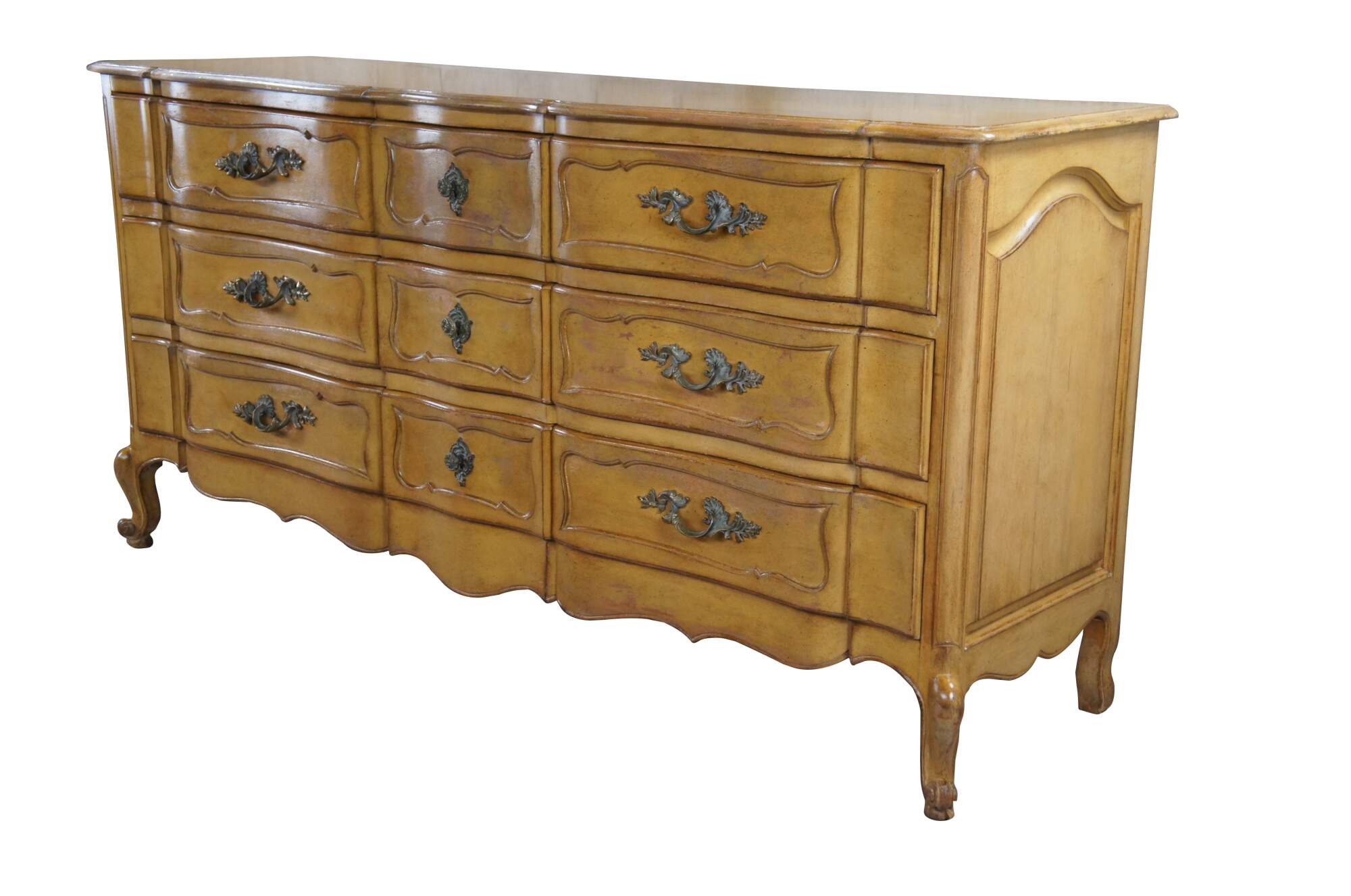 A stout mid century French Provincial dresser featuring serpentine form with nine dovetailed oakdrawers, paneled accents and cabriole legs. Attributed to Bethlehem Furniture Co.