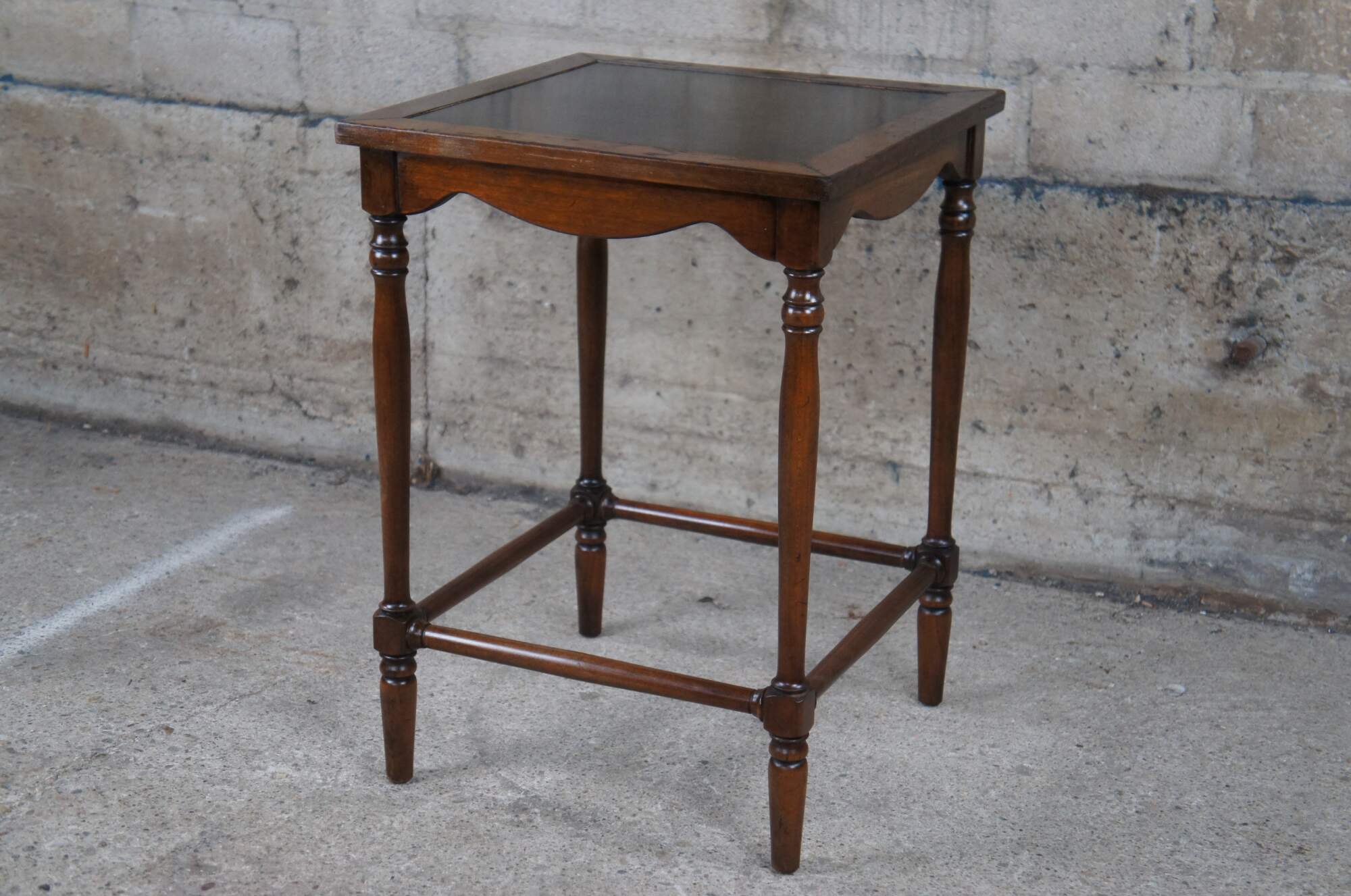 Vintage Statton Trutype Americana collection side table or plant stand. Made of oak featuring turned supports with a black formica inset top.