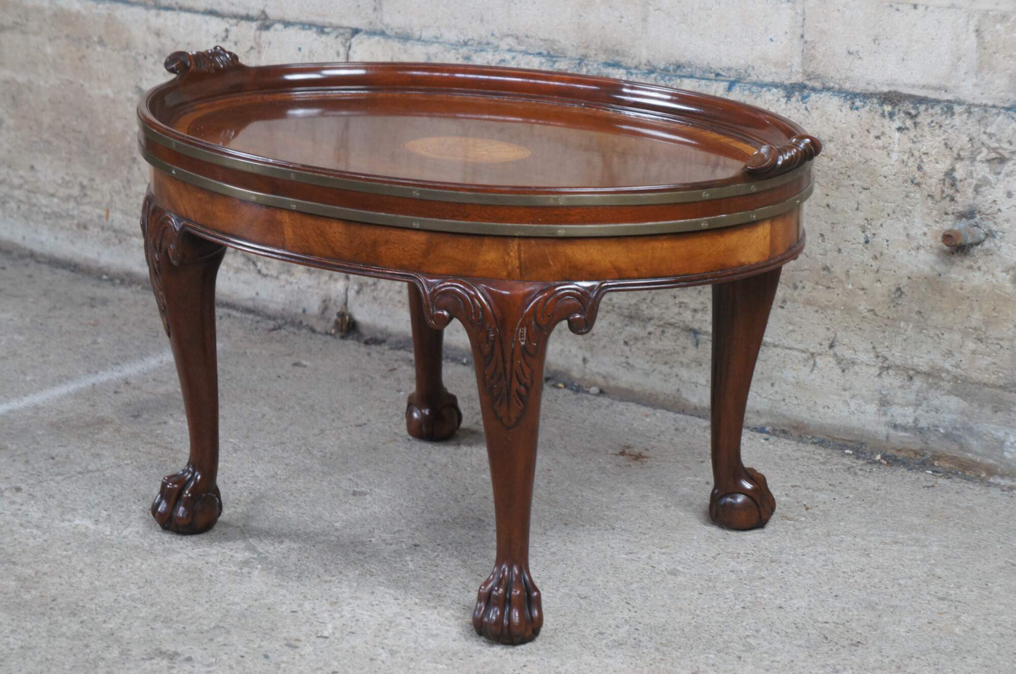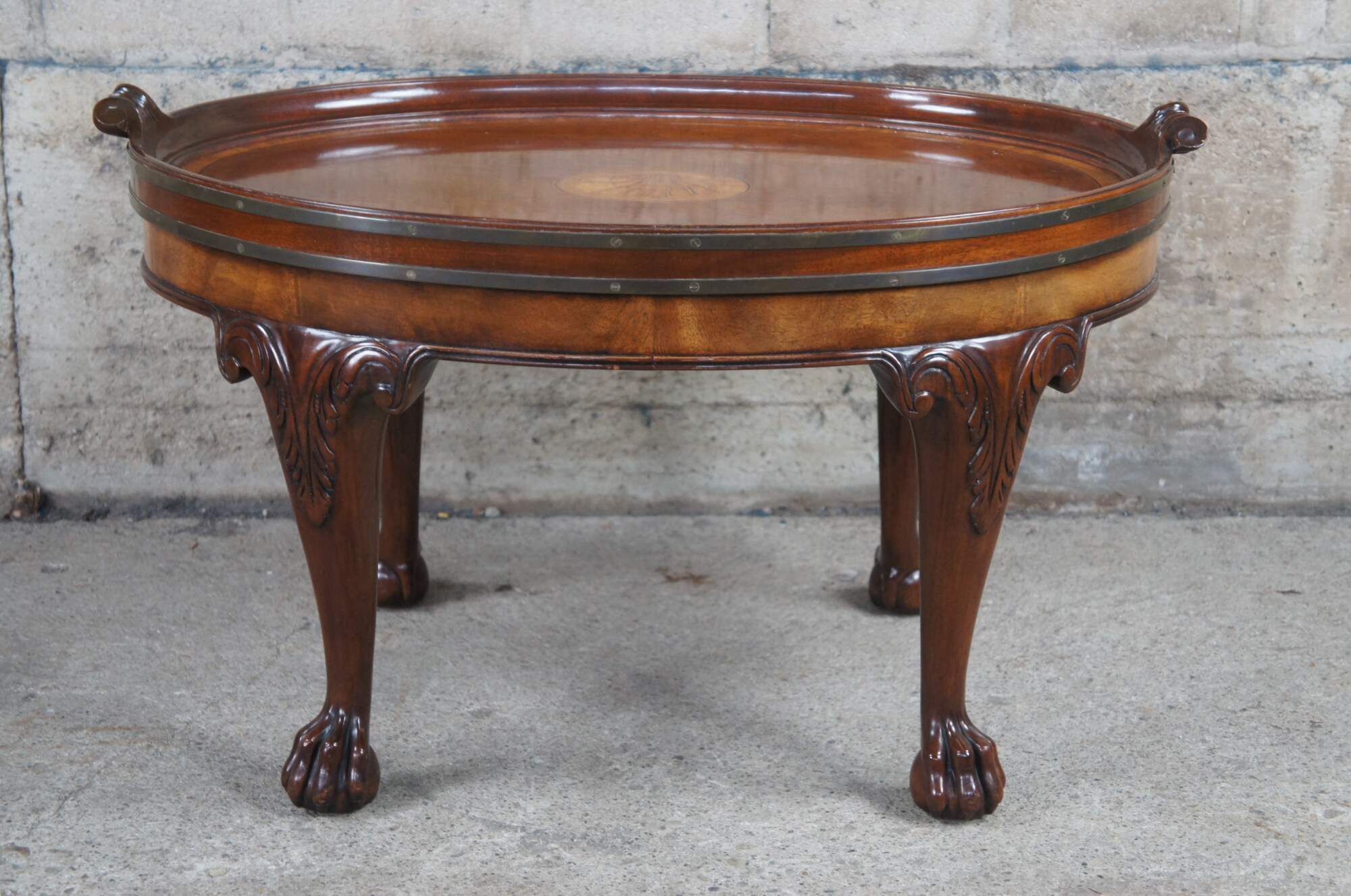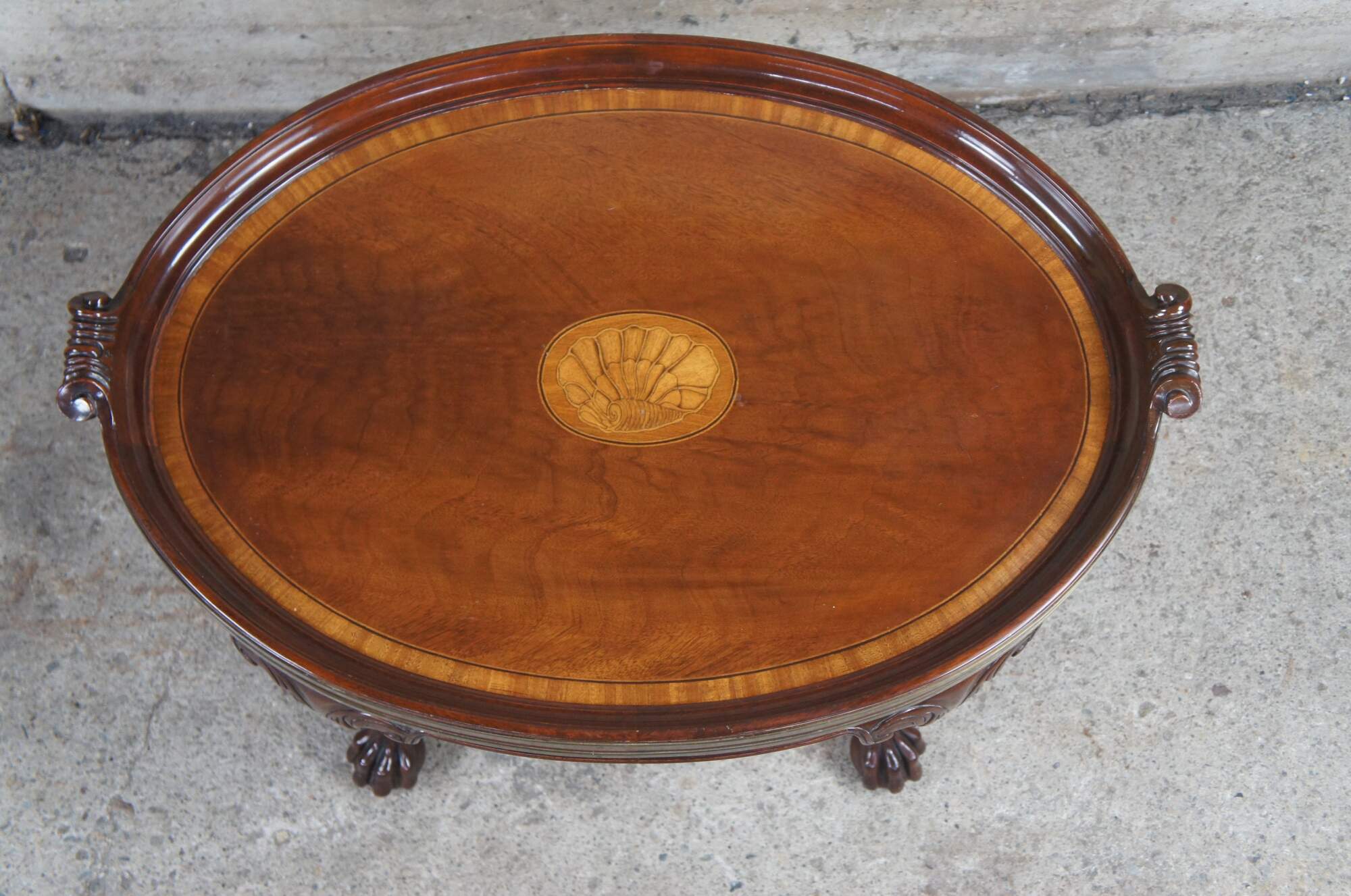 Vintage Baker Furniture Stately Homes Collection coffee table. Drawing inspiration from English Georgian and Chippendale styling. Made from mahogany and satinwood with an oval form and tray style inset top. Features marquetry inlay with sea shell medallion, accented with brass banding, acanthus carving, and ball and claw feet.