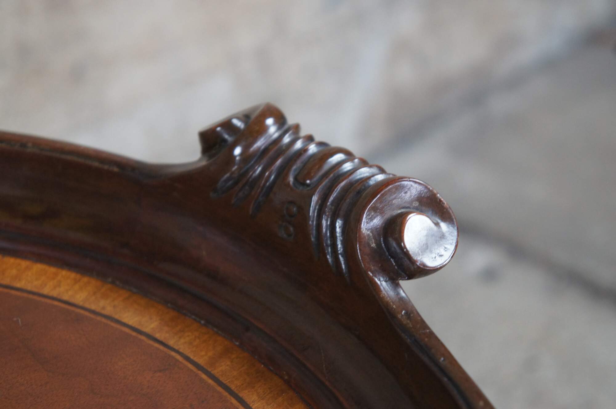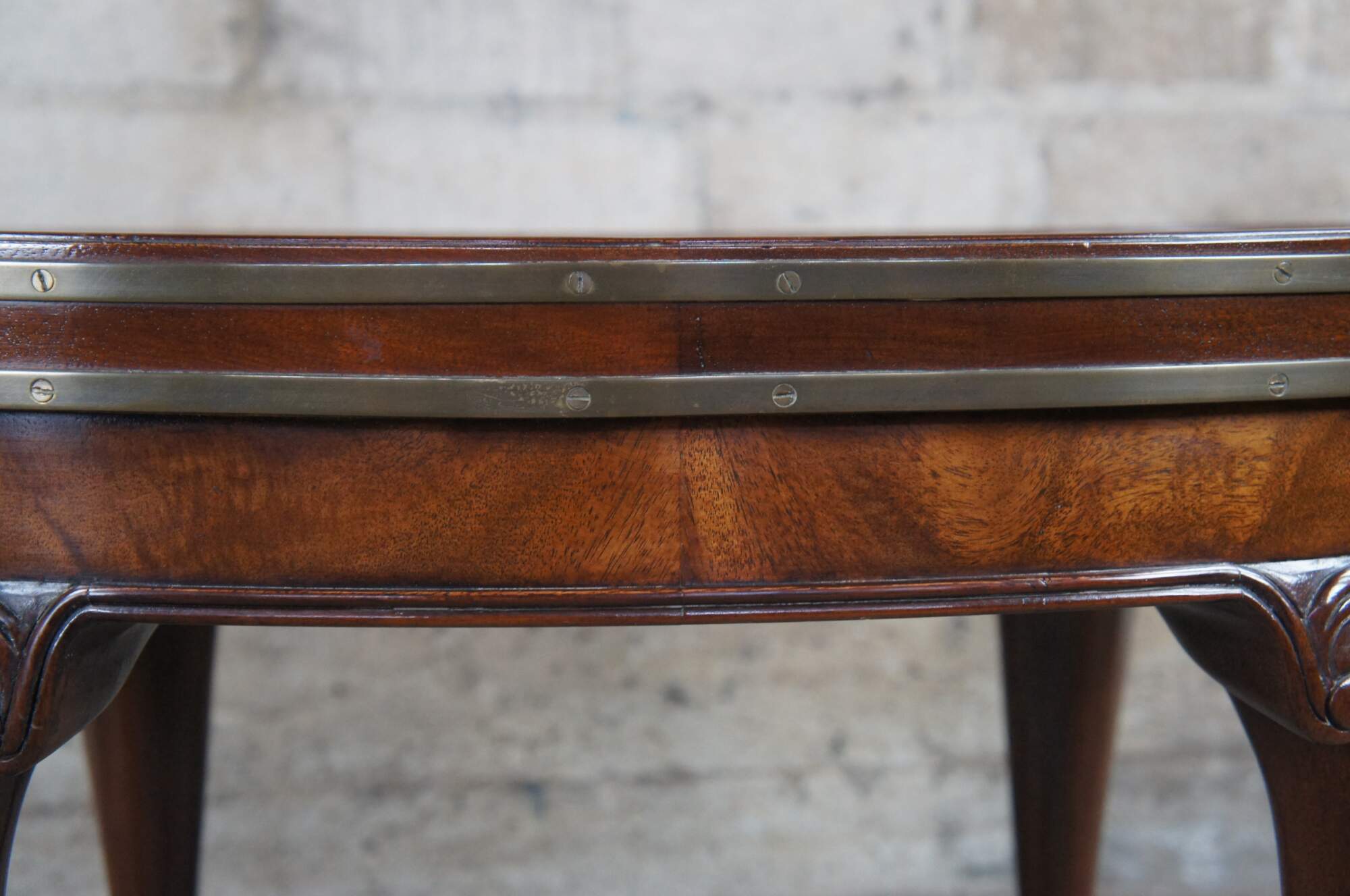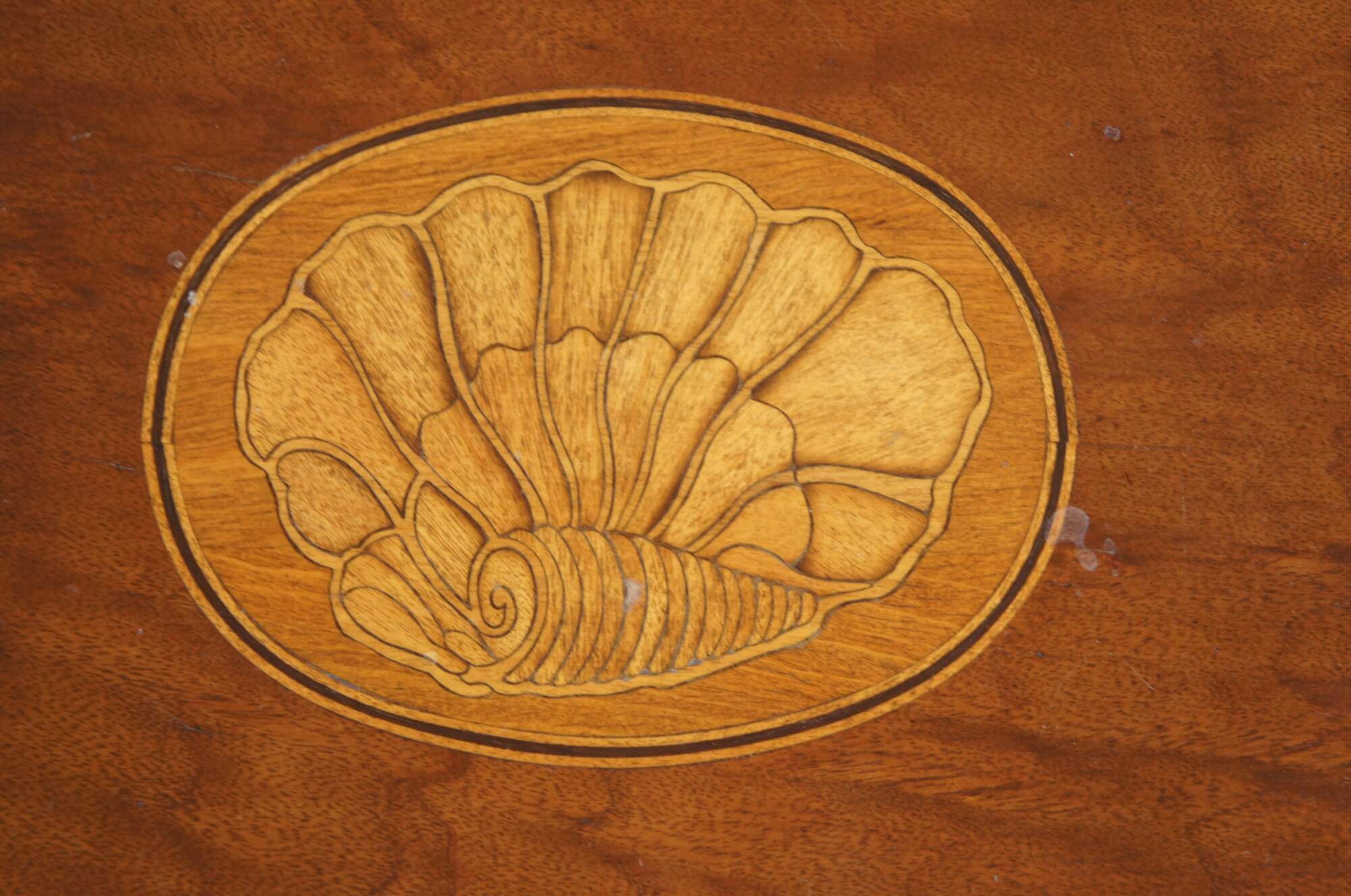 Vintage Baker Furniture Stately Homes Collection coffee table. Drawing inspiration from English Georgian and Chippendale styling. Made from mahogany and satinwood with an oval form and tray style inset top. Features marquetry inlay with sea shell medallion, accented with brass banding, acanthus carving, and ball and claw feet.