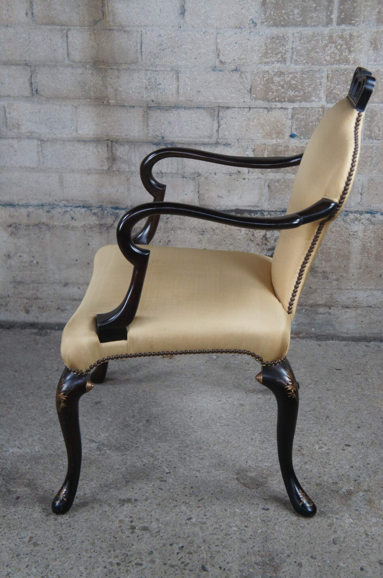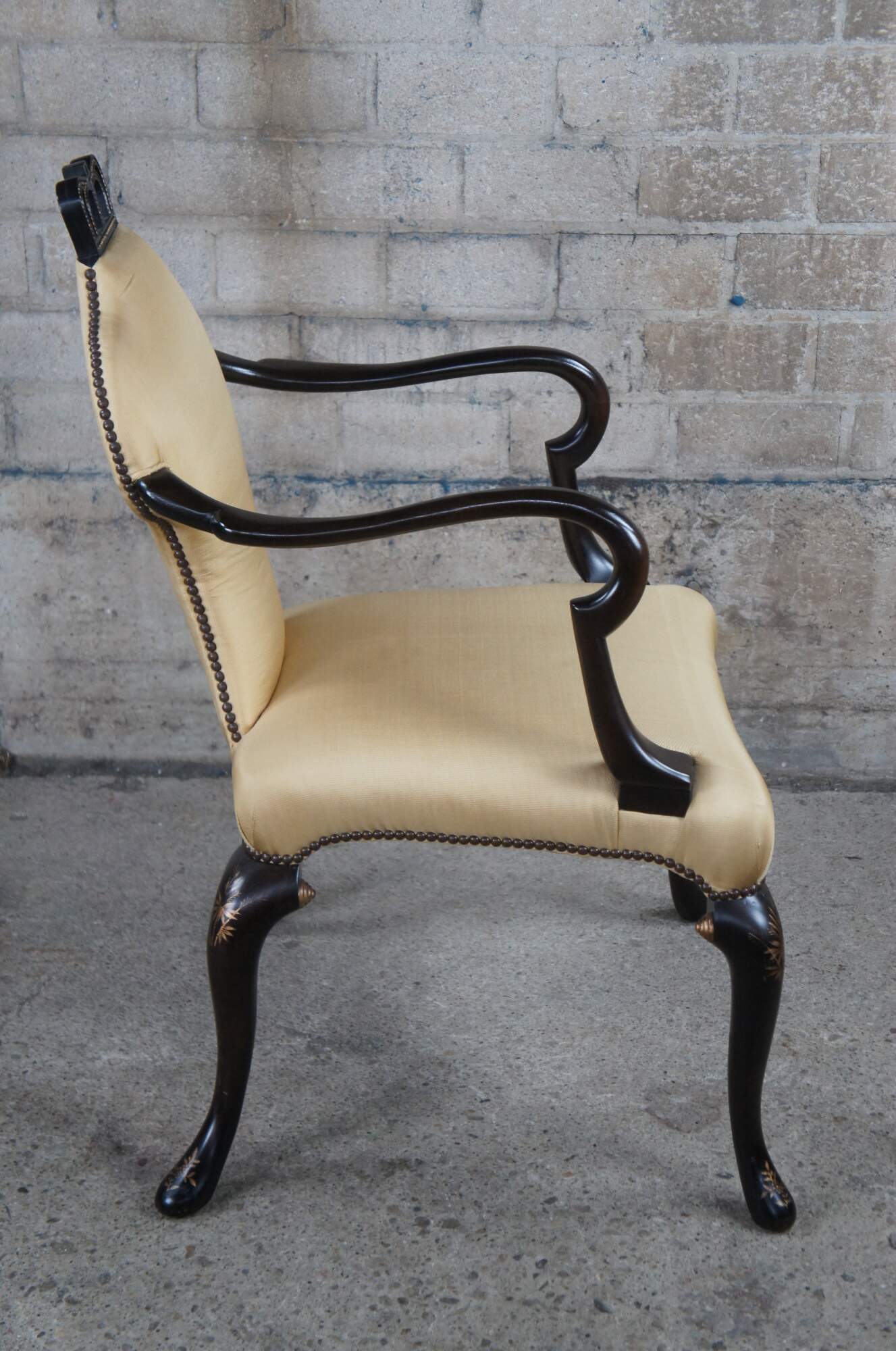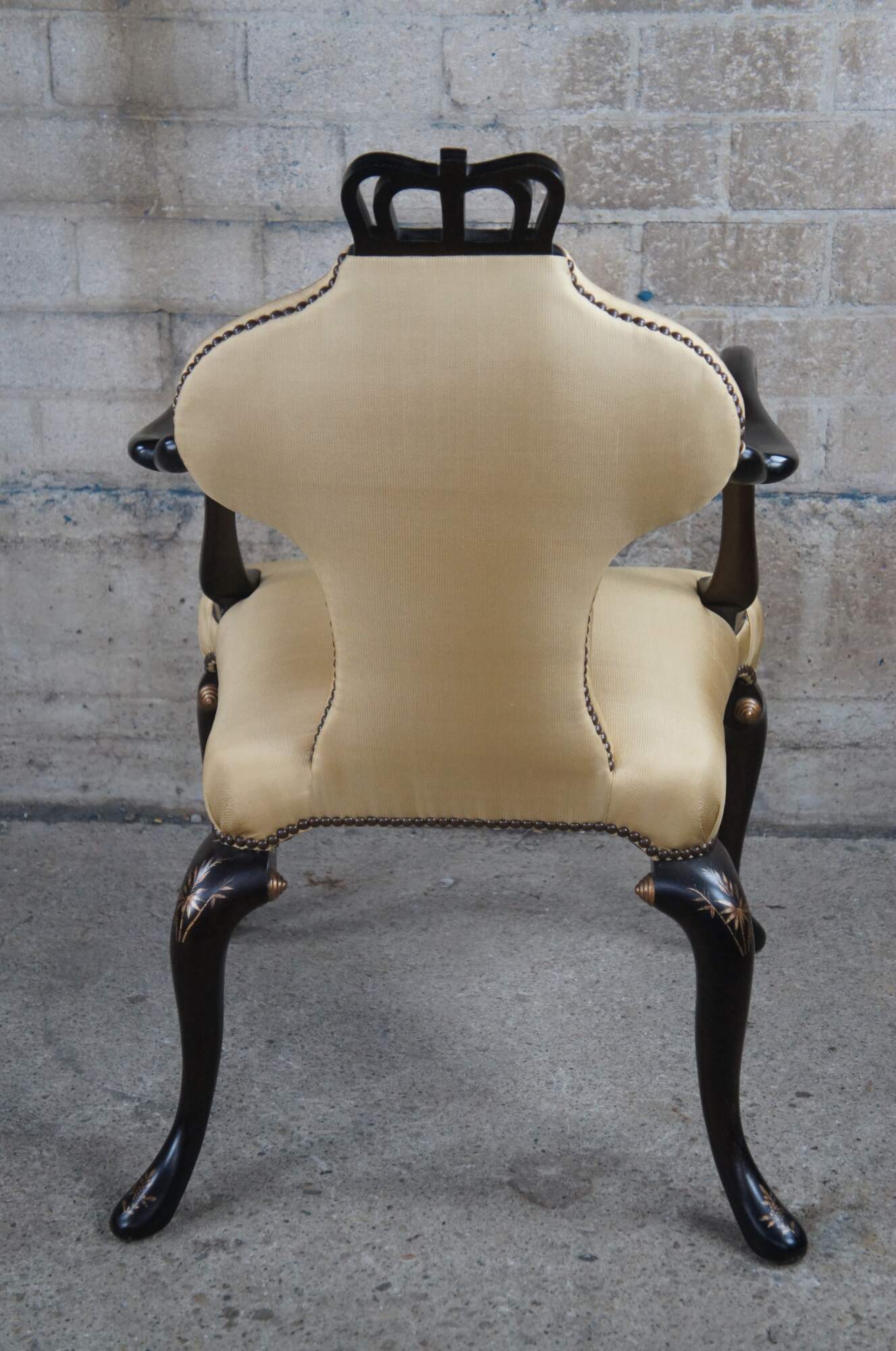 A Queen Anne Chair with an upholstered back in lieu of a splat. Elongated shepherd's crook (gooseneck) arm. Distinctive cabriole legs, with unusual splayed back legs. Nailhead trim. This chair owes to Lord Middleton and the family's home at Wollaton Hall - a Tudor palace filled with the work of Robert Adam, Thomas Chippendale and England's well - known portraitists. The crown suggests that it was made for the visit by the royal family. Ideal at a desk or positioned as a piece of sculpture. Gold decorated trim accents on crown and legs (5139D, inset). Circa 1710. No. BA5139