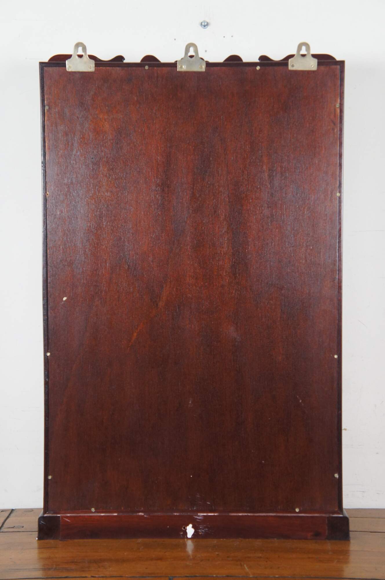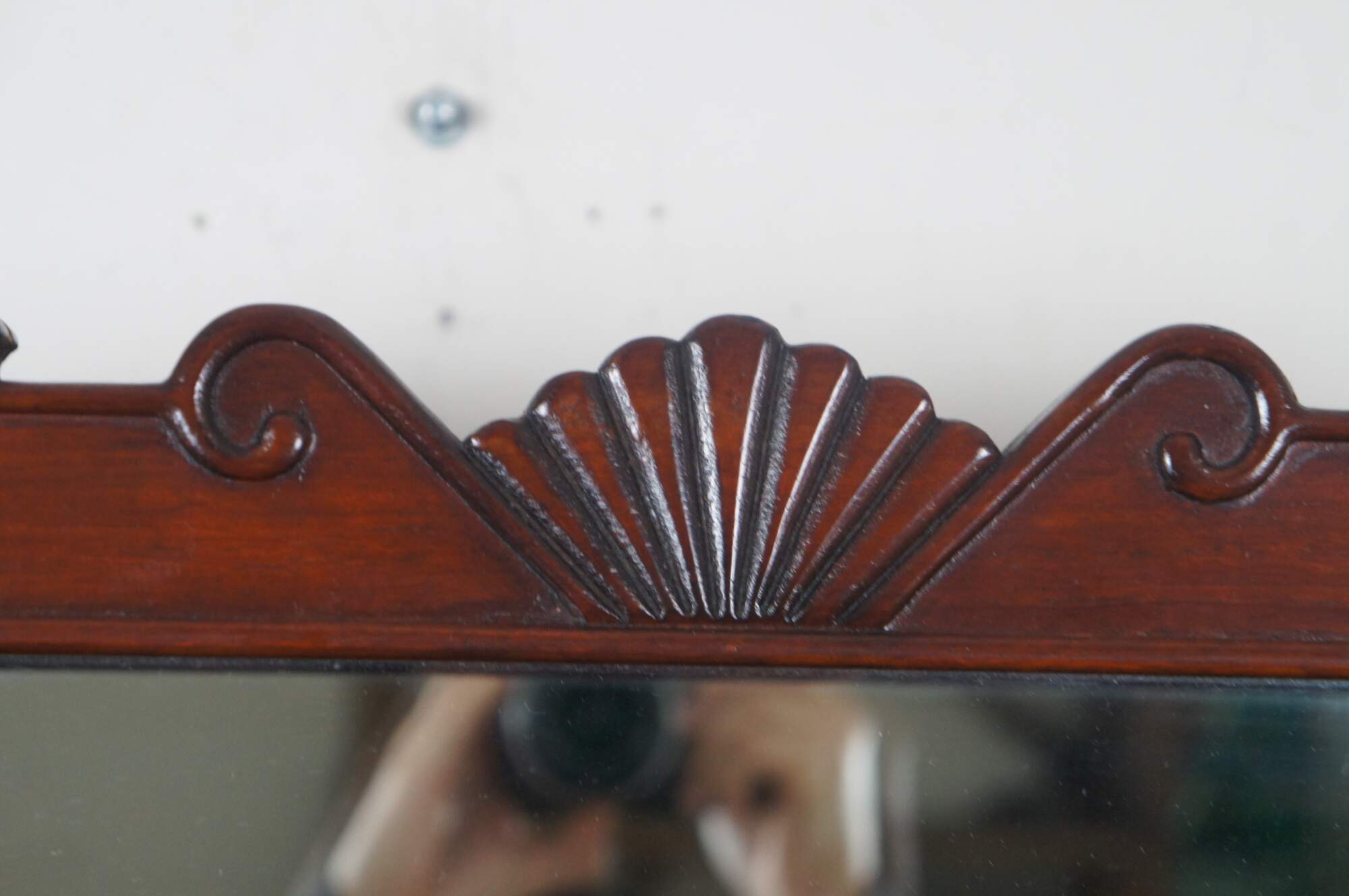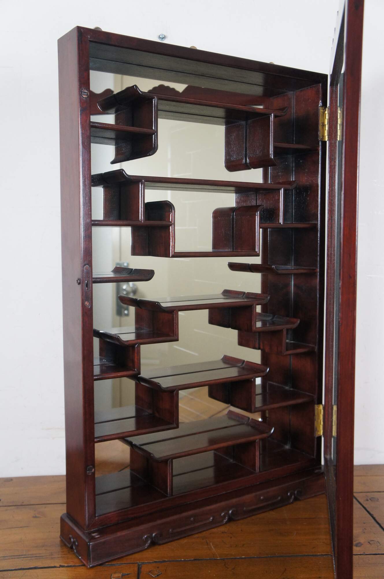 Vintage Chinese etagere wall shelf curio cabinet featuring Chippendale styling with mirrored back, carved shell top glass door and mutliple display shelves for Natsuke / trinkets / snuff bottles ect.