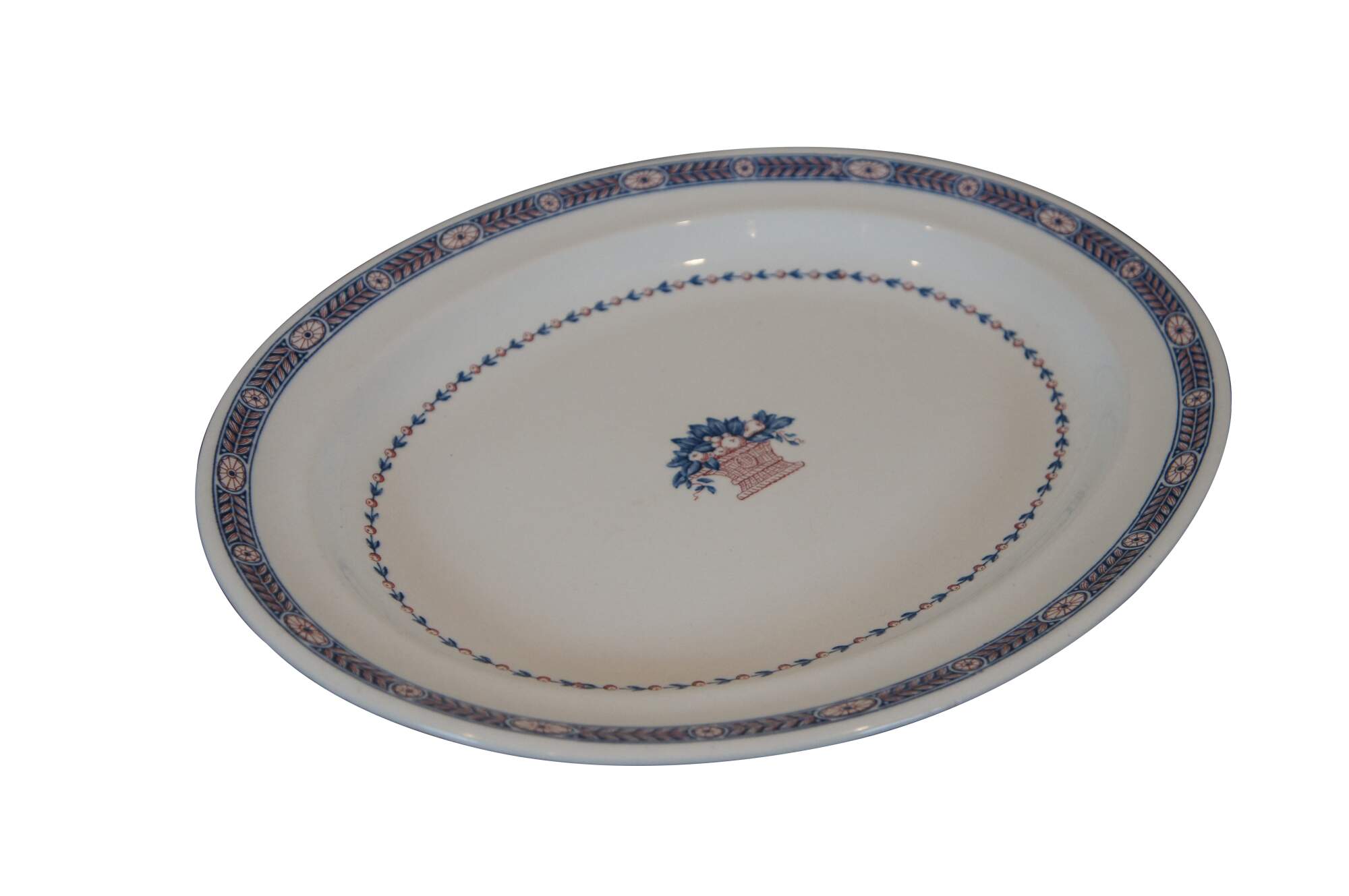 Vintage Wedgwood Boston Etruria, England oval platter in blue white and red featuring a floral motif with fruit / flower basket at the center.