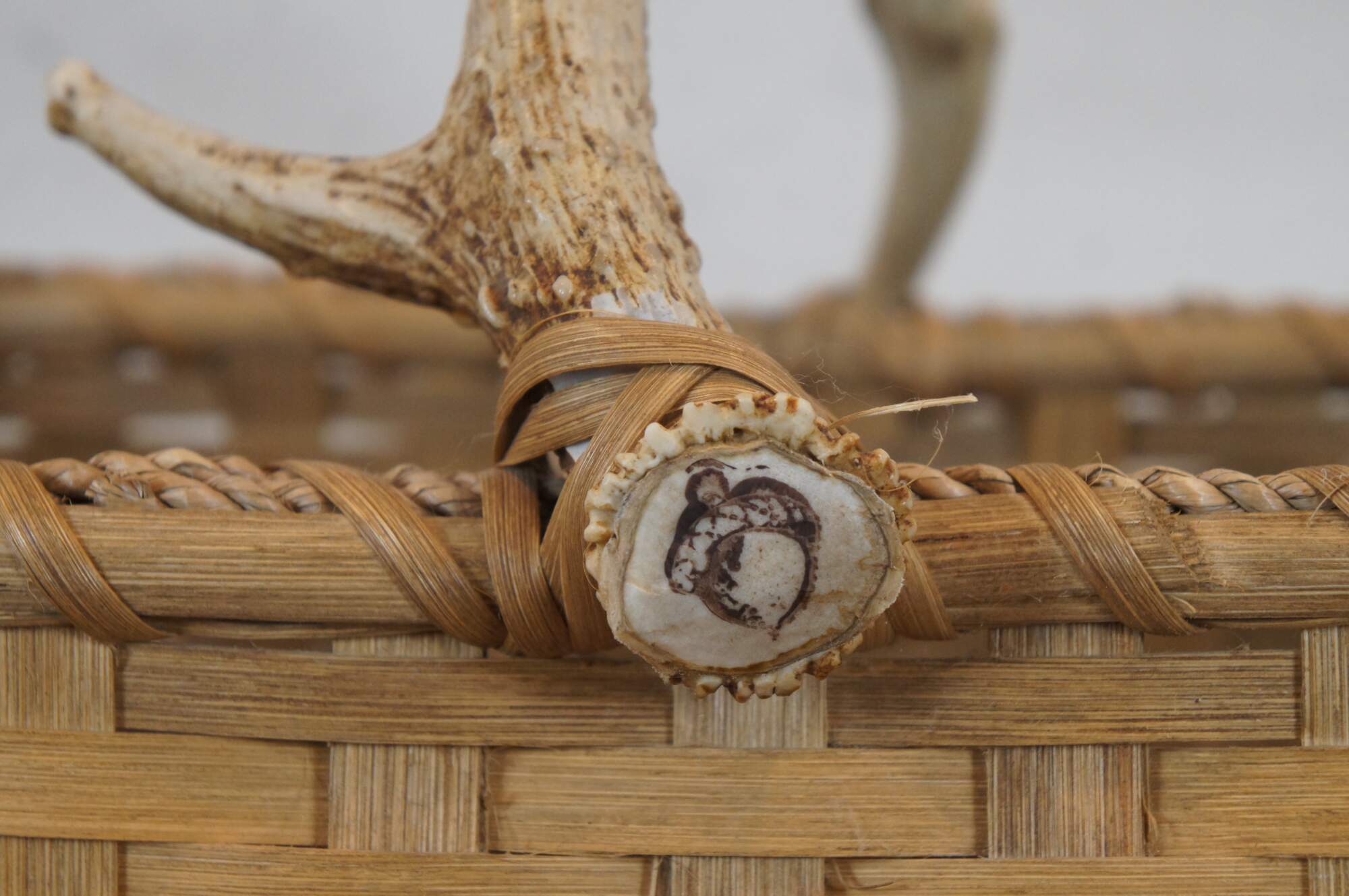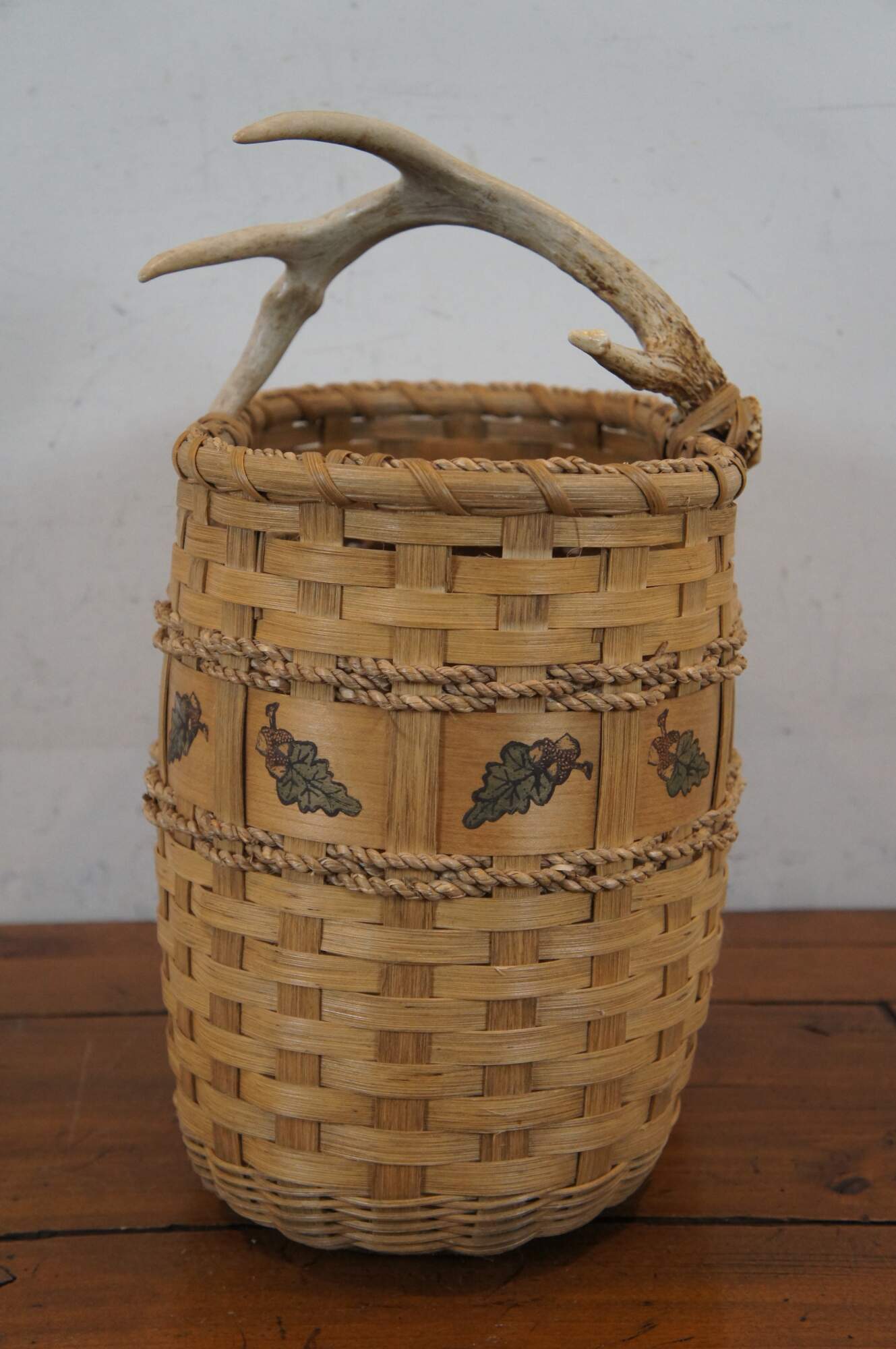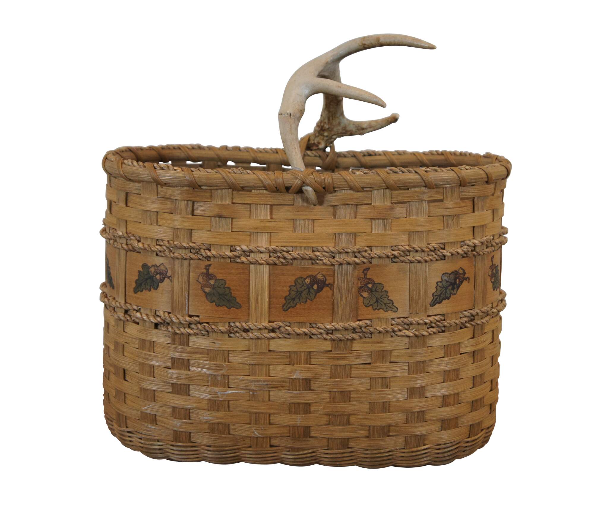 Large vintage wicker harvest basket featuring antler handle with acorn / leaf theme and rope twist accents.