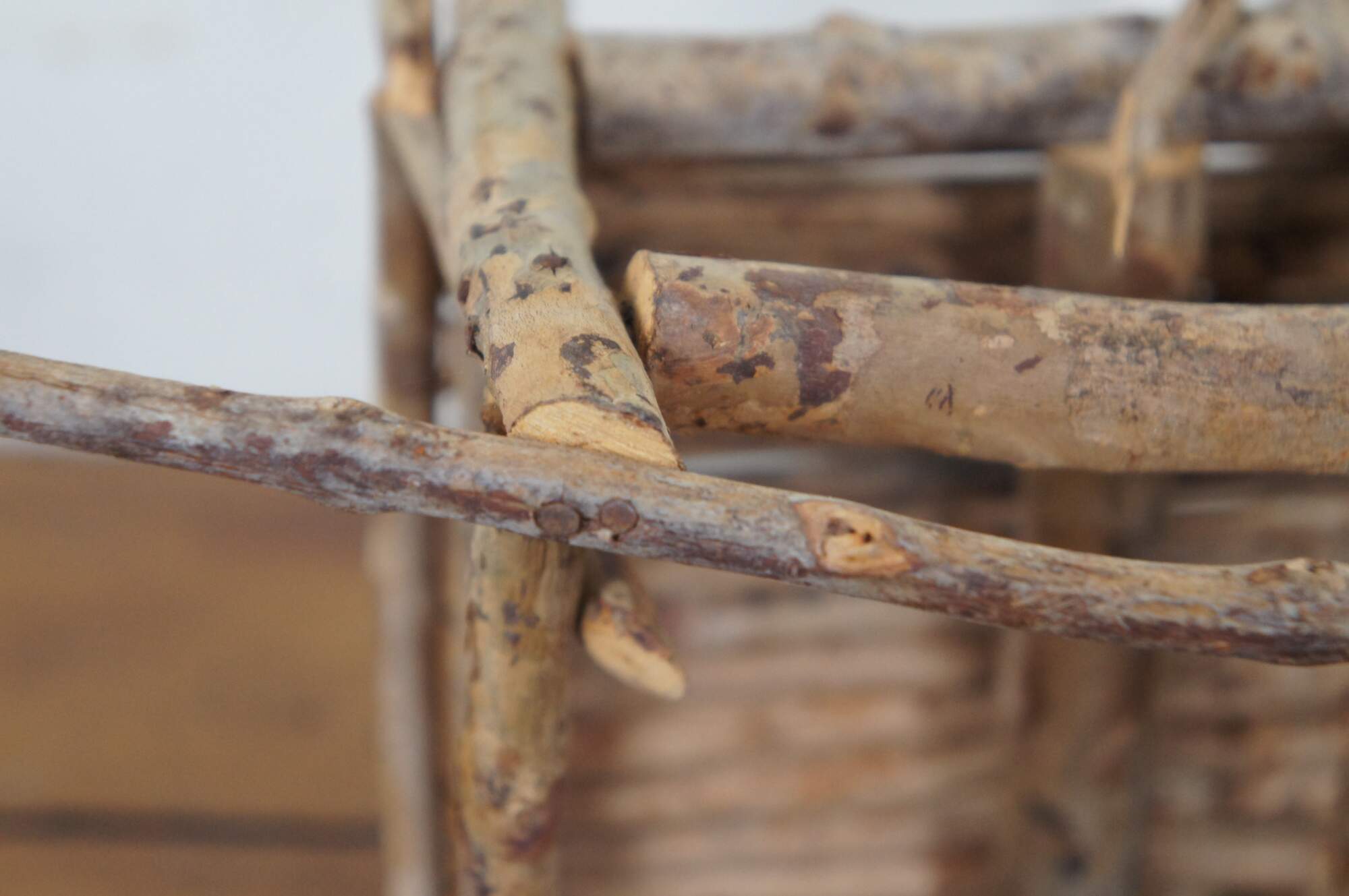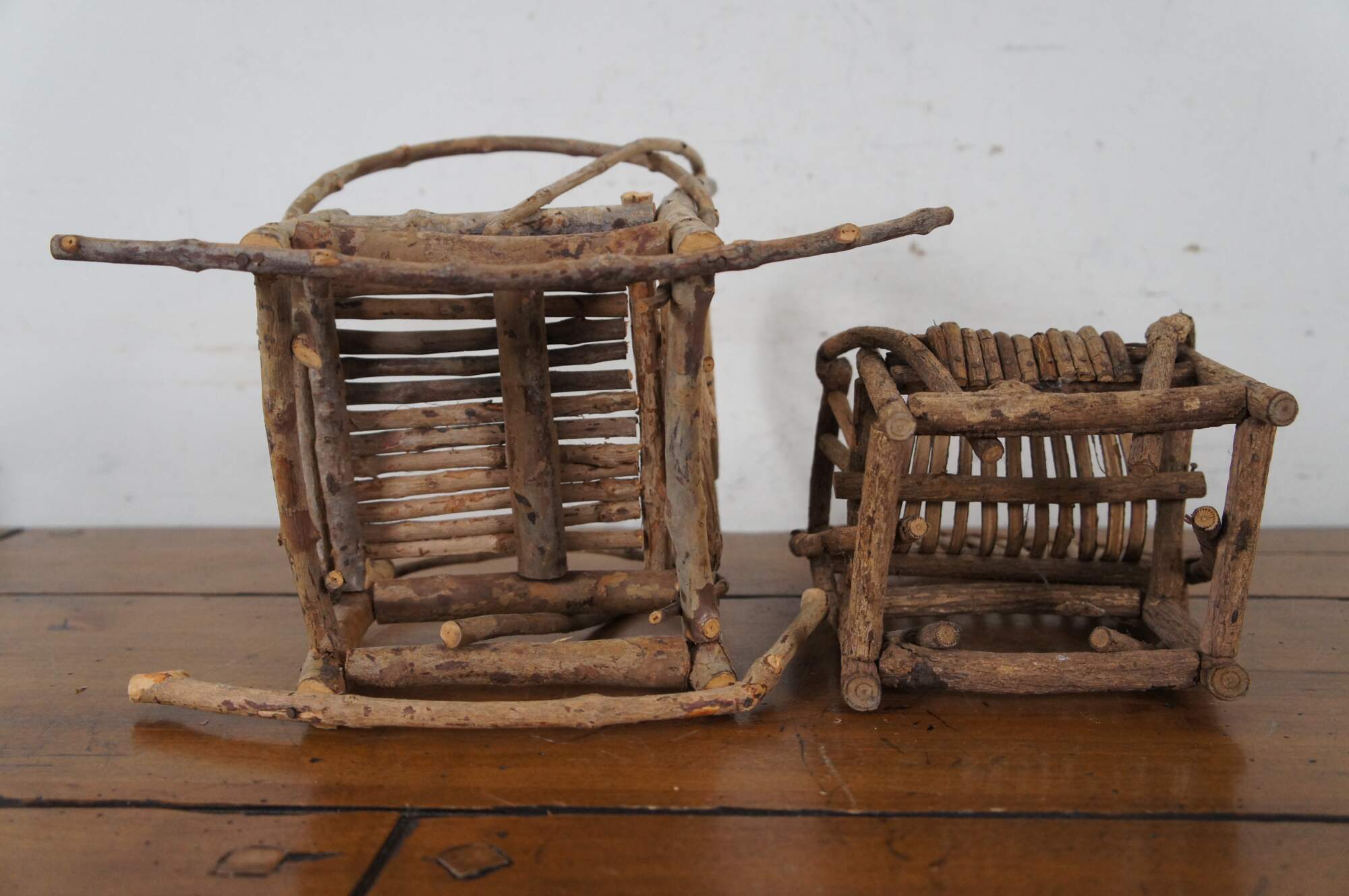 Two vintage folk art miniature salesman sample / doll / cabin decor Adirondak chairs featuring rustic bentwood / twig designs; one rocker and one armchair.