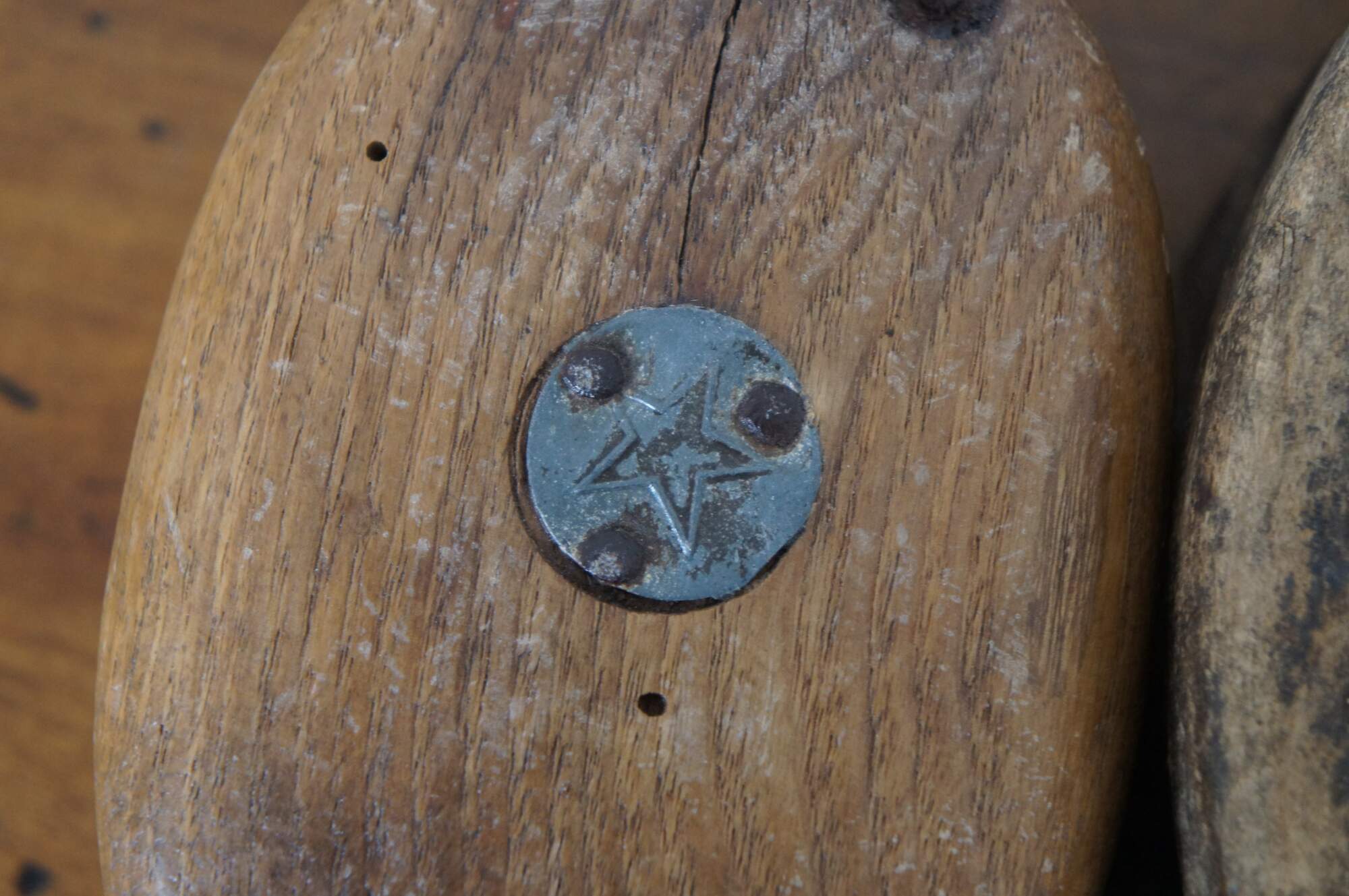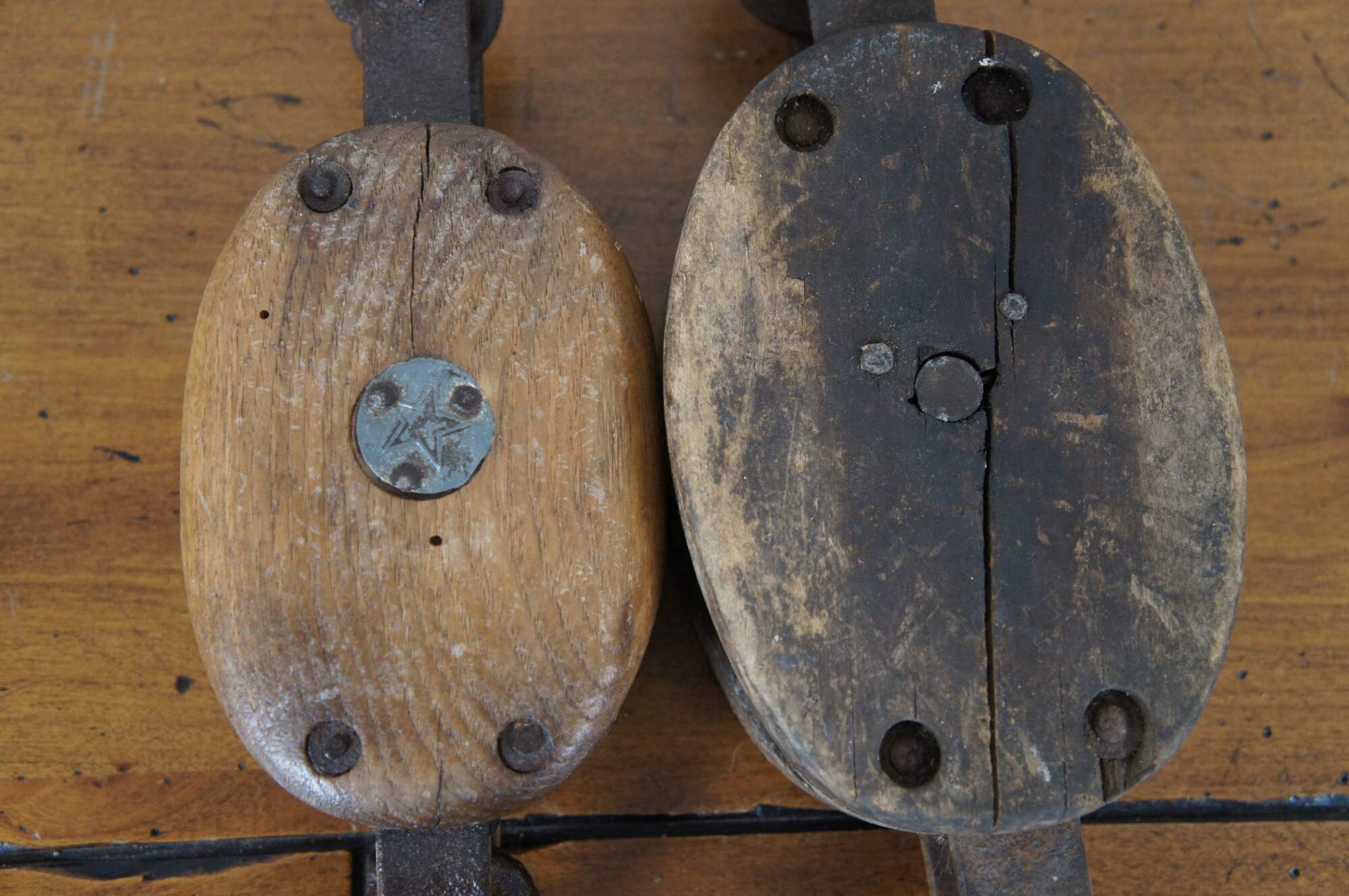 Two primitive antique iron and wood pulley hoist hooks, one by Starline. Rustic, nautical, industrial, farmhouse, cabin decor.