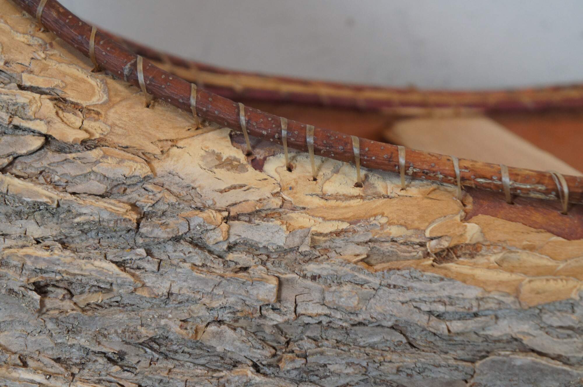 Vintage 1/3 scale folk art canoe model. Made of birch bark and bentwood featuring traditional primitive construction. Log cabin, lodge, store display.