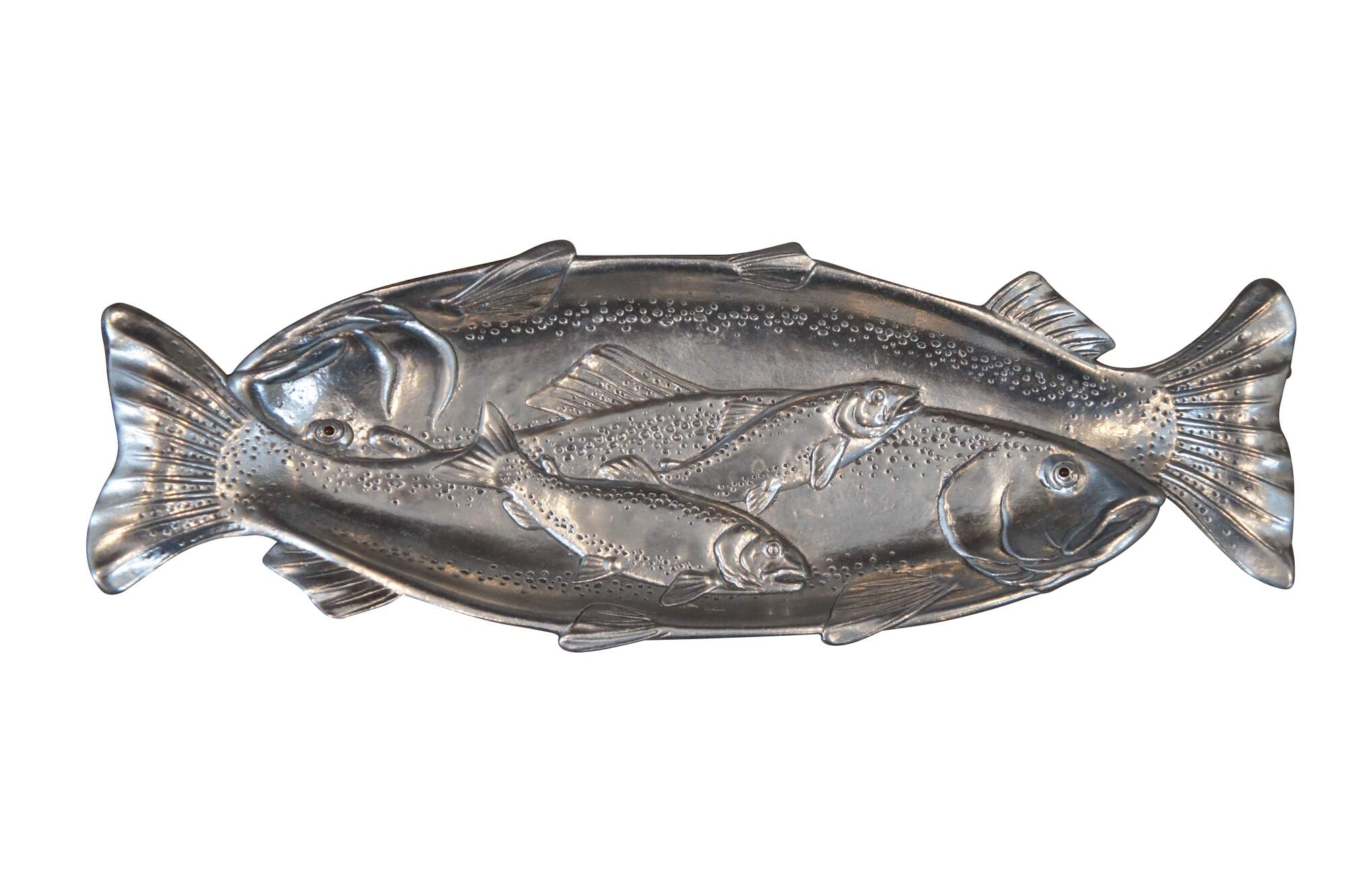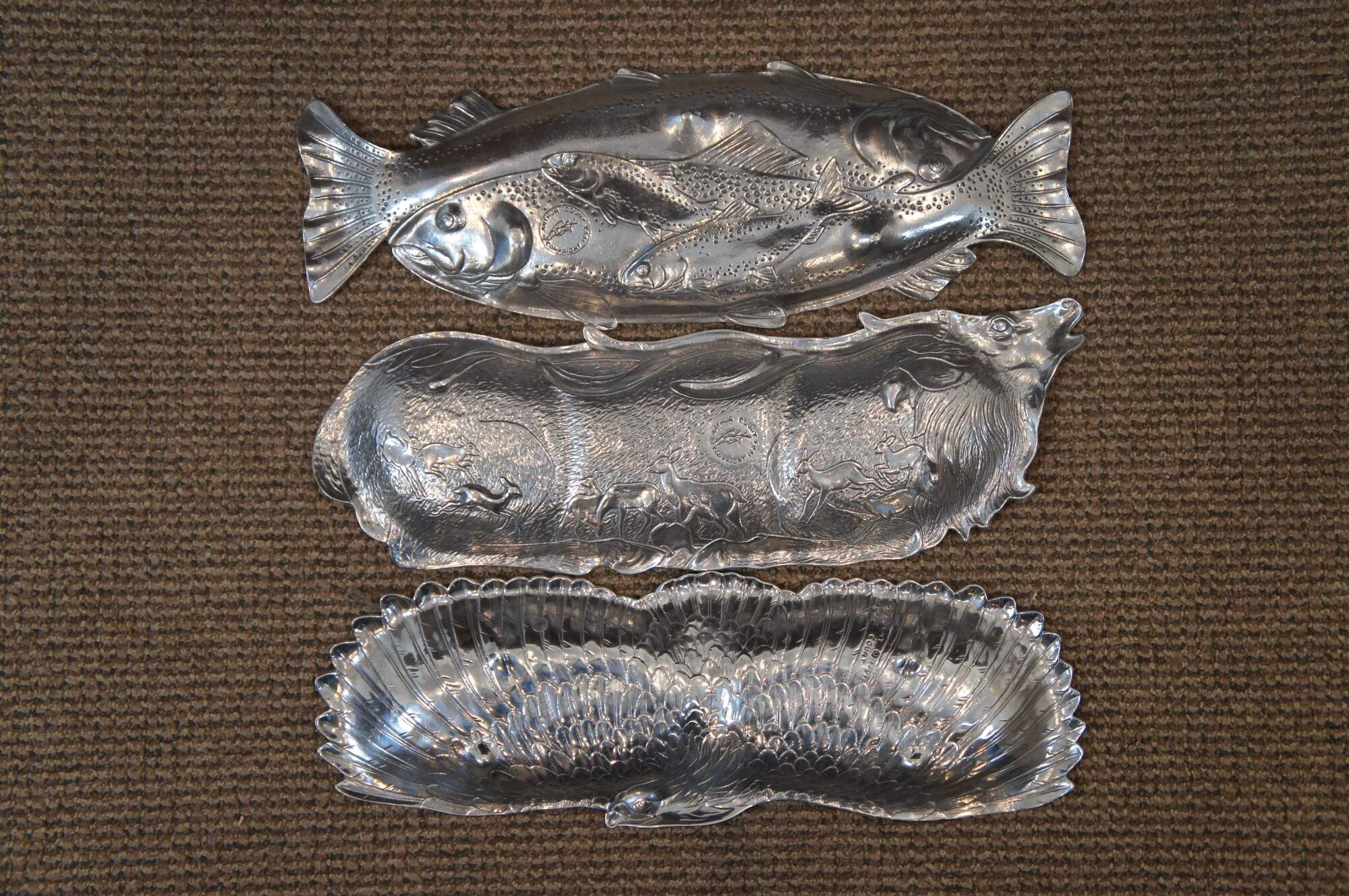Three vintage Arthur Court animal / hunt theme serving trays or platters. Made of aluminum featuring Carnelian jeweled eyes. Includes 1991 Bald Eagle, 1993 School of Salmon / fish and 1993 Deer / Stag / Elk.