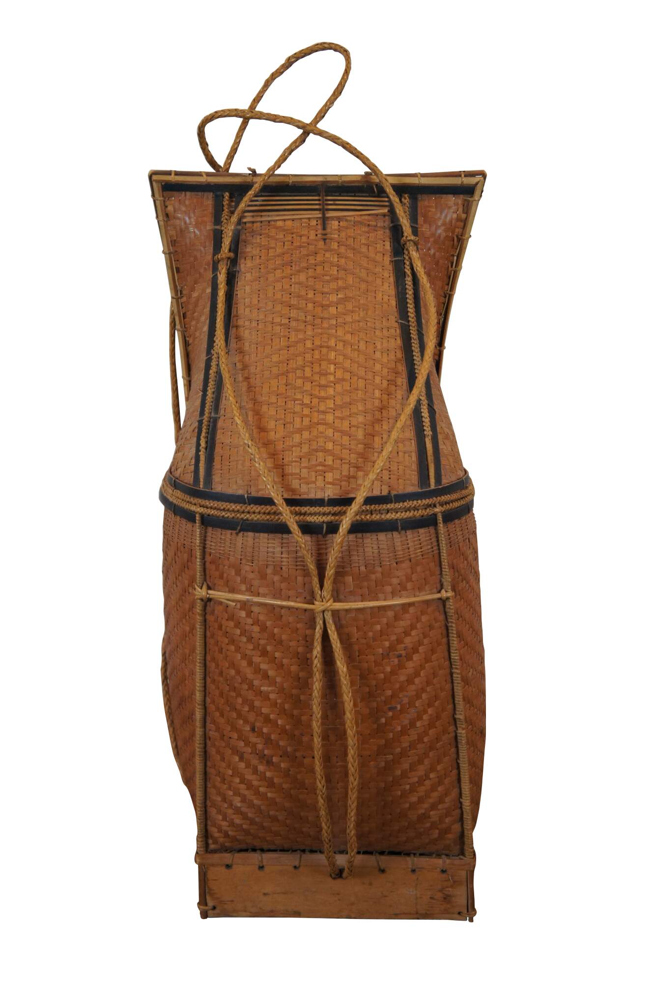 Antique folk art tribal woven wicker and bamboo baby carrying basket from Thailand.