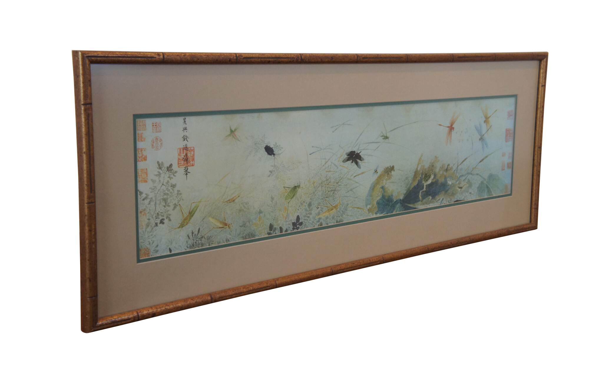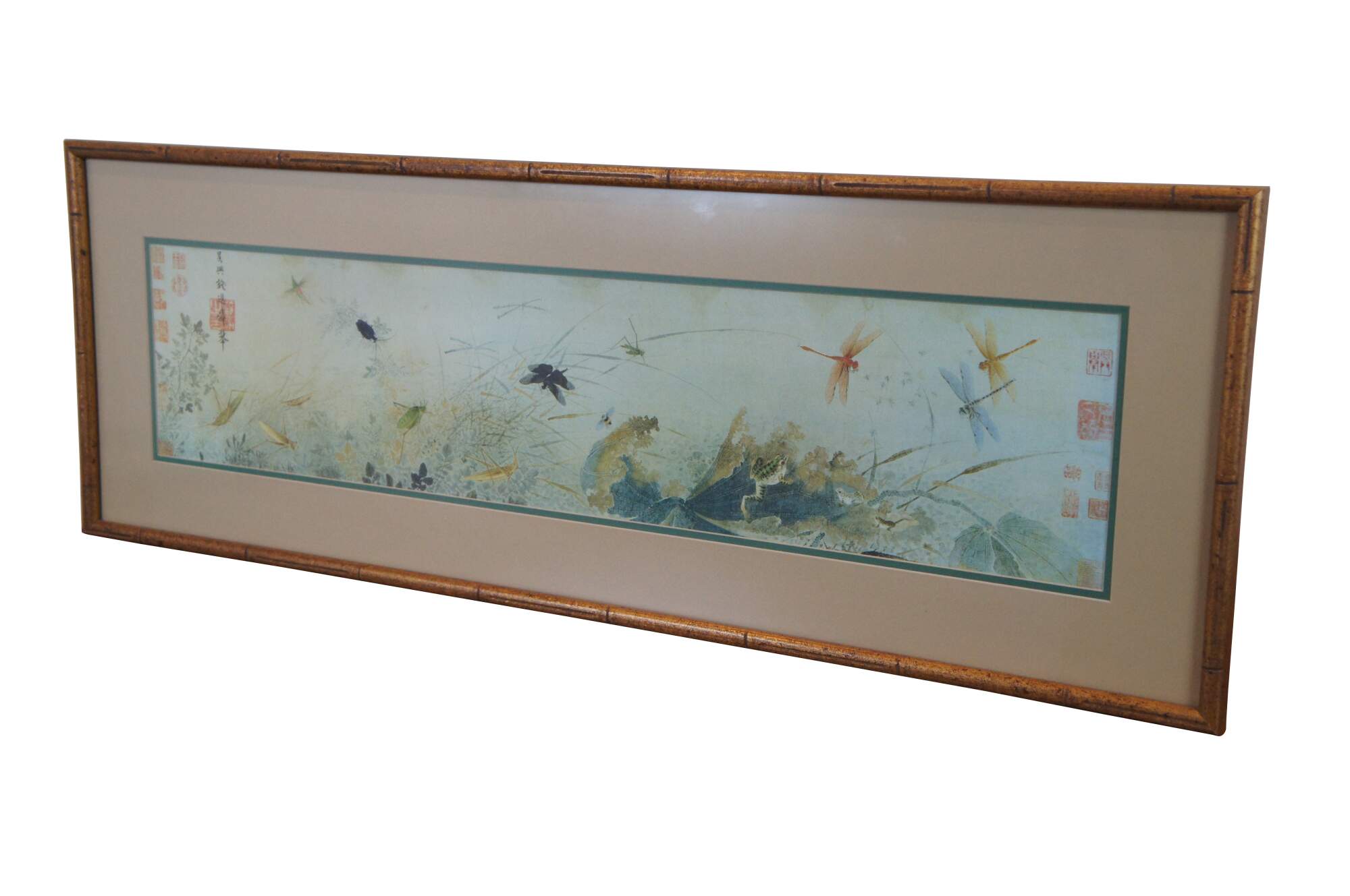 Vintage Qian Xuan, Early Autumn, lithograph print in faux bamboo frame. Qian Xuan was one of the first scholar-painters to unite poetry, painting, and calligraphy within a single work.