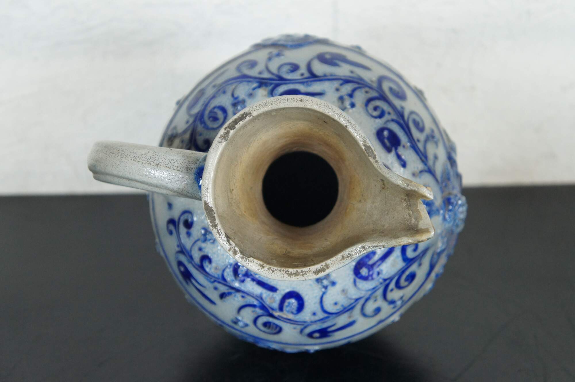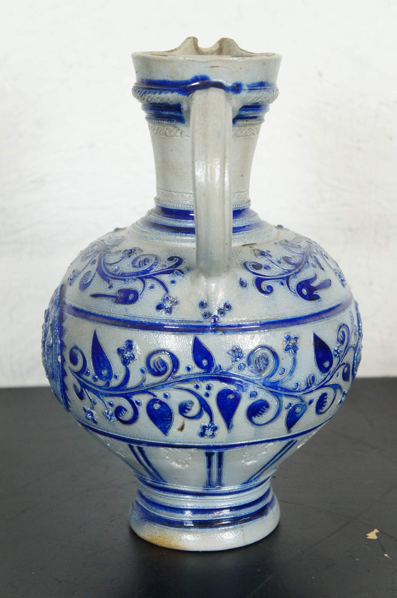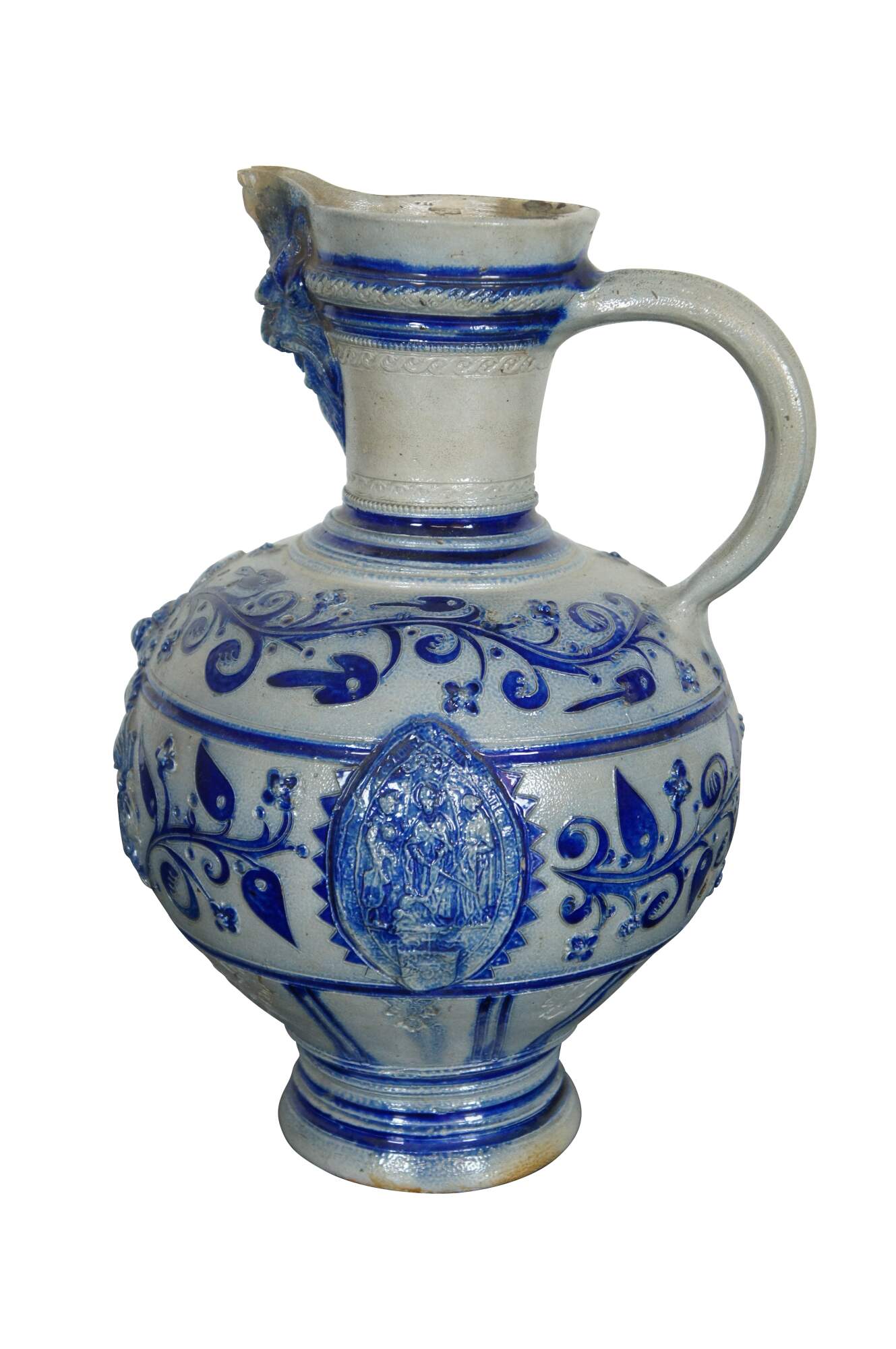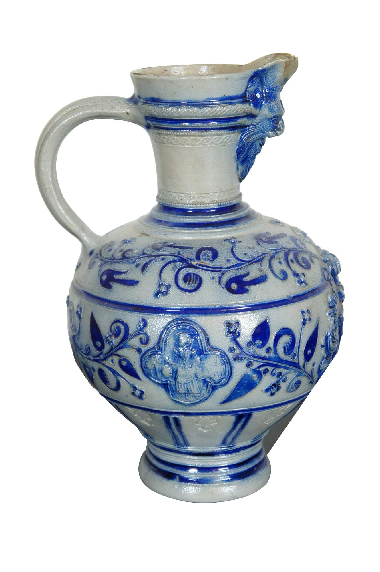 Antique German Westerwald stoneware pottery decanter jug or pitcher. Made of cobalt blue salt glaze stoneware featuring Dionysus / Bacchus, a heraldic crest / shield and floral motif.