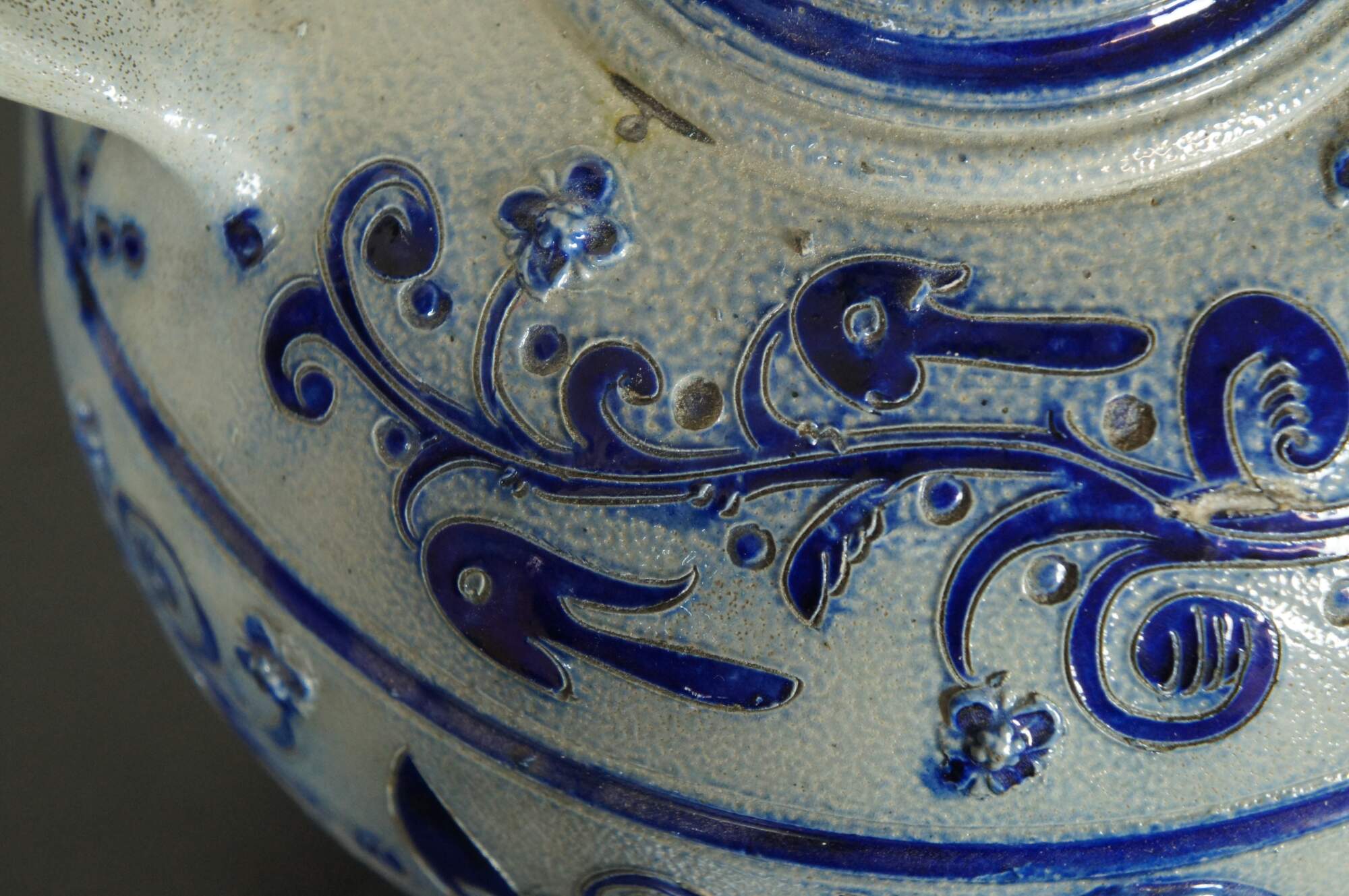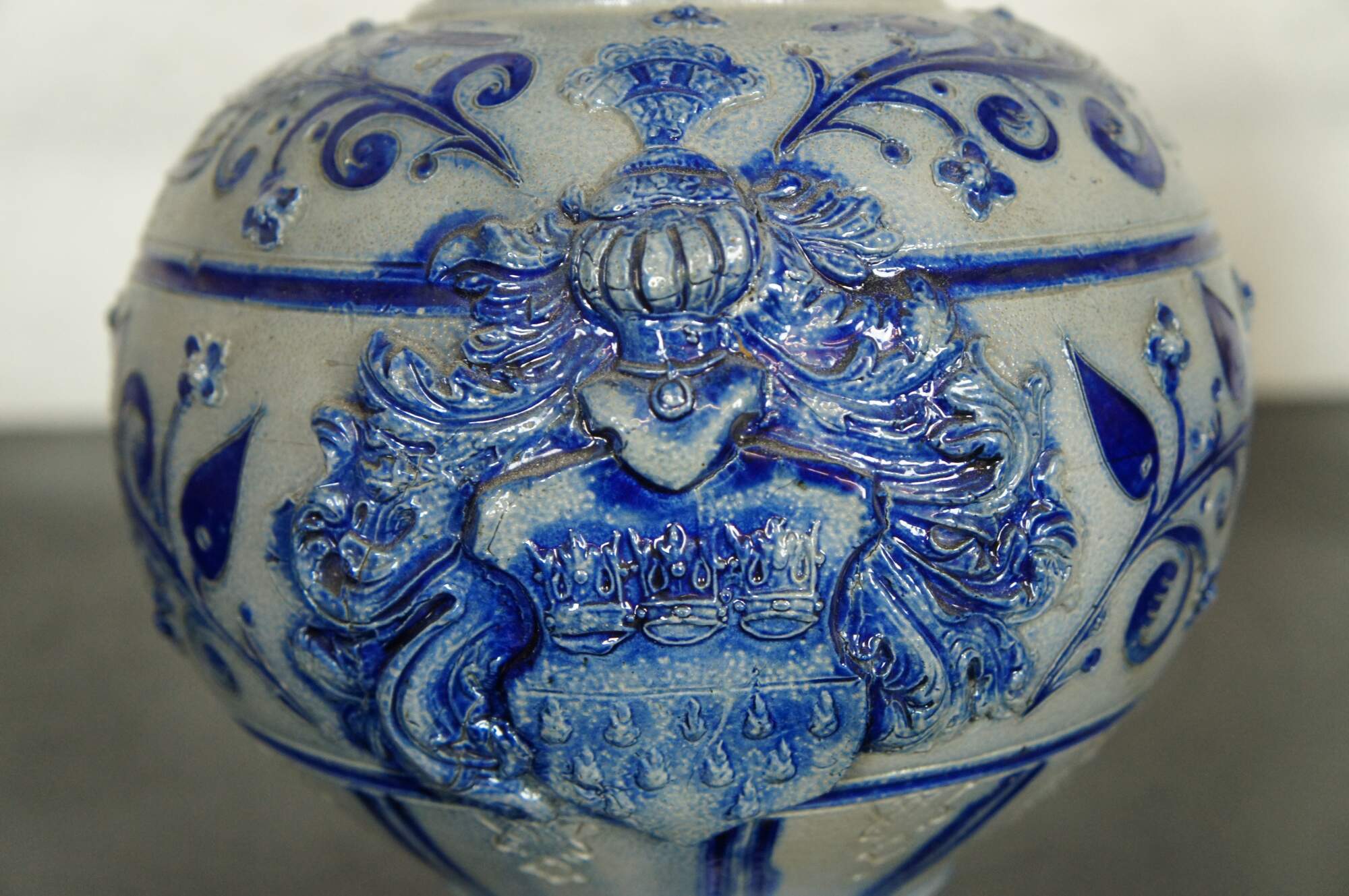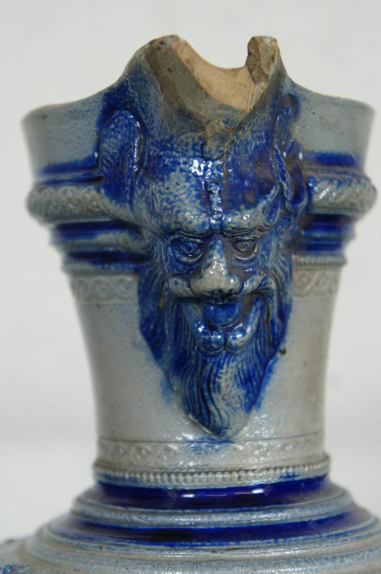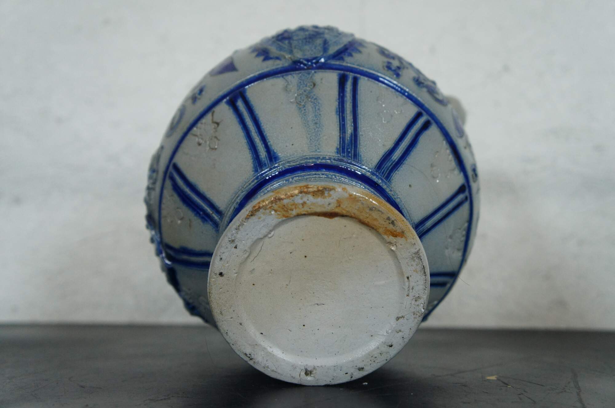 Antique German Westerwald stoneware pottery decanter jug or pitcher. Made of cobalt blue salt glaze stoneware featuring Dionysus / Bacchus, a heraldic crest / shield and floral motif.
