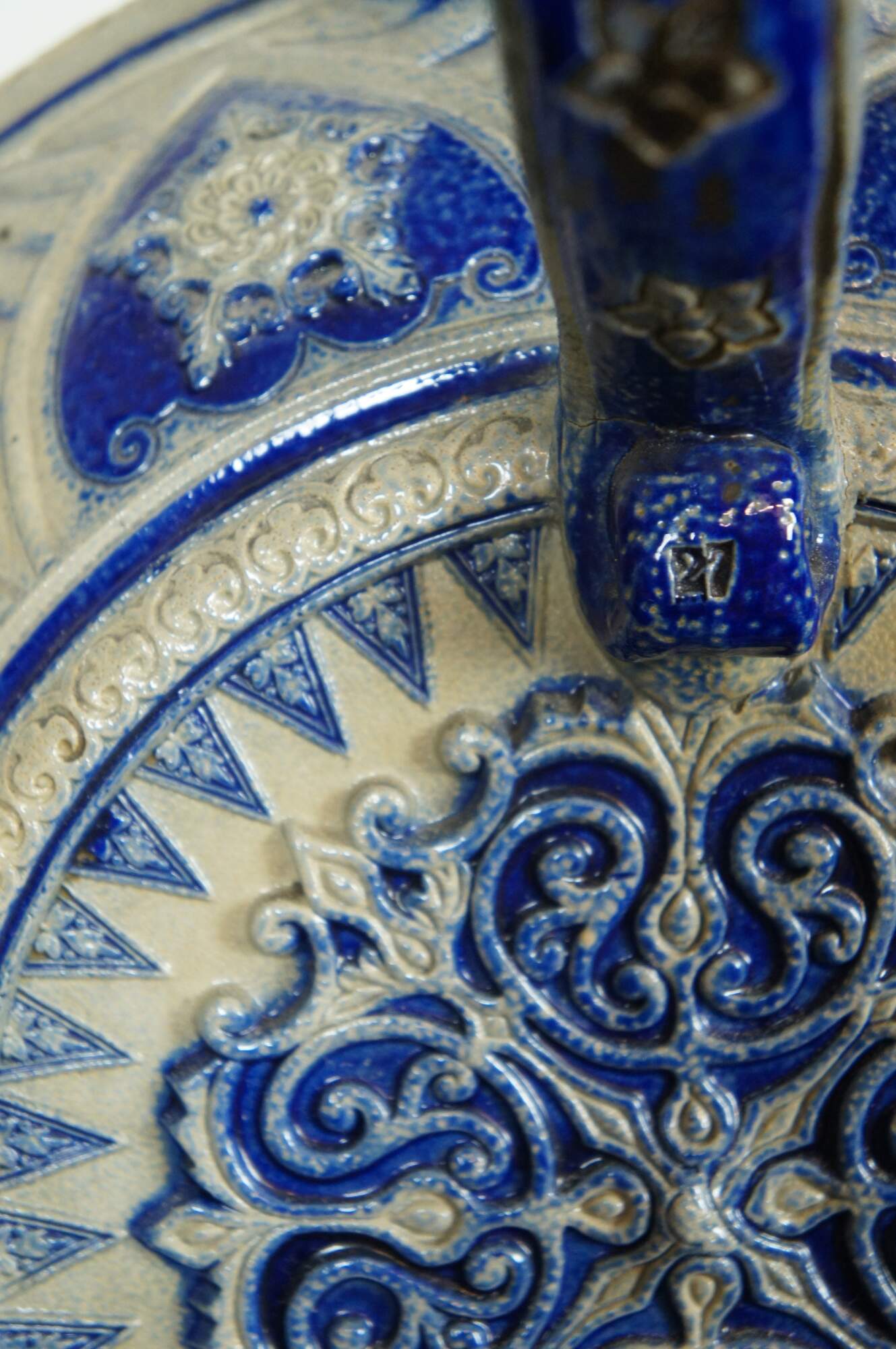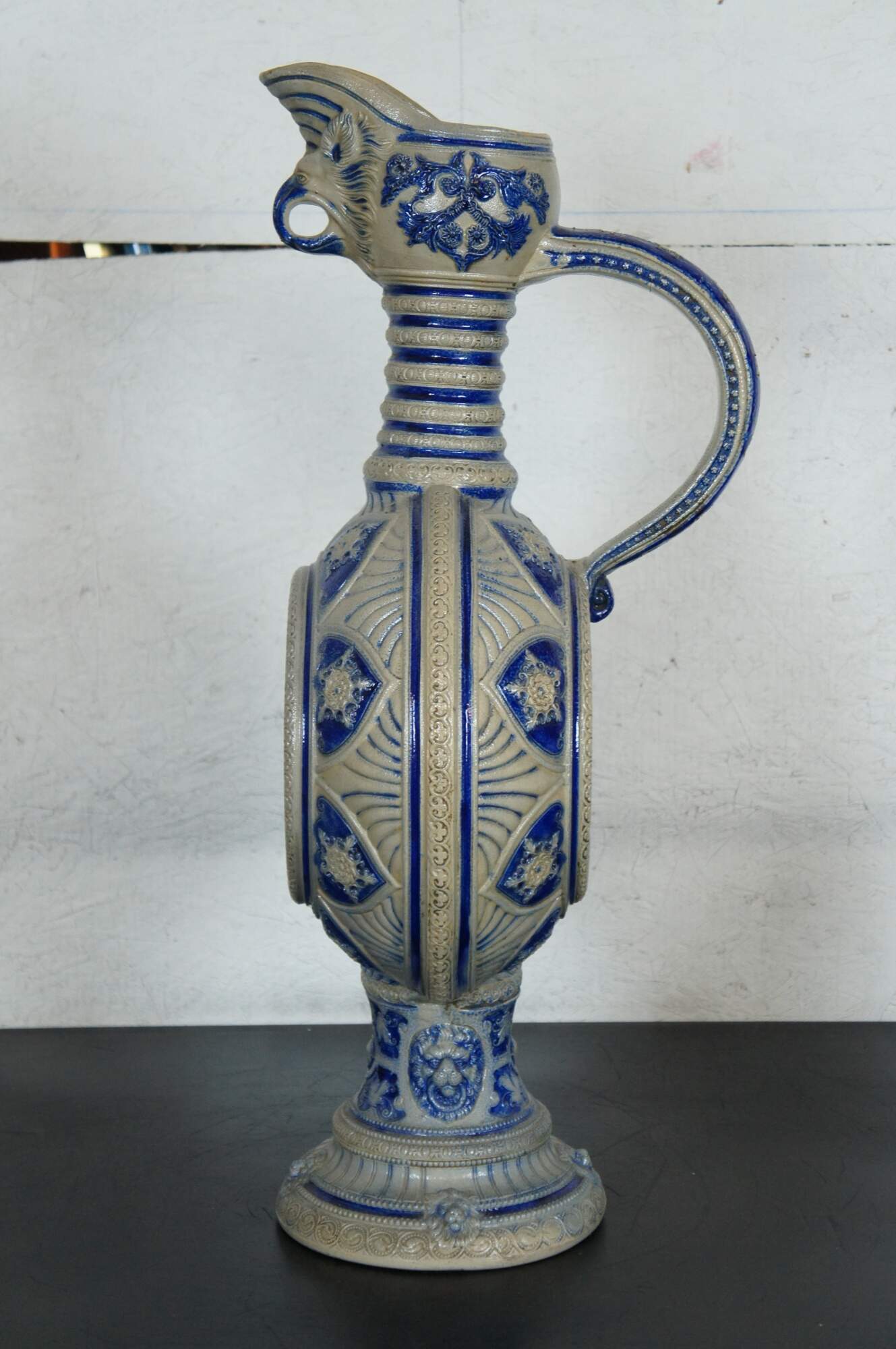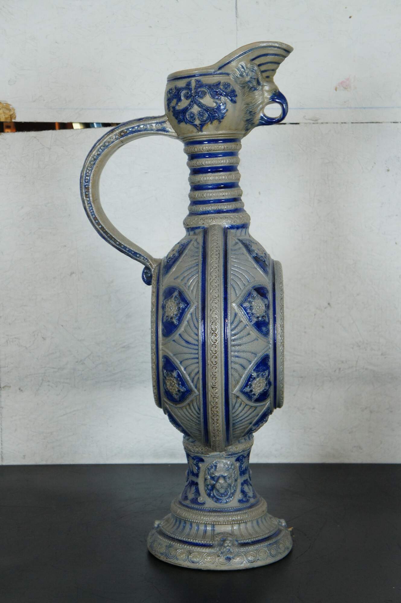 Antique German Westerwald stoneware pottery decanter jug, ewer or pitcher. Made of cobalt blue salt glaze stoneware featuring a mythical gryphon / griffon (cross between eagle / lion / elephant) spout, heraldic crest / shield, lion head and fleur de lis.