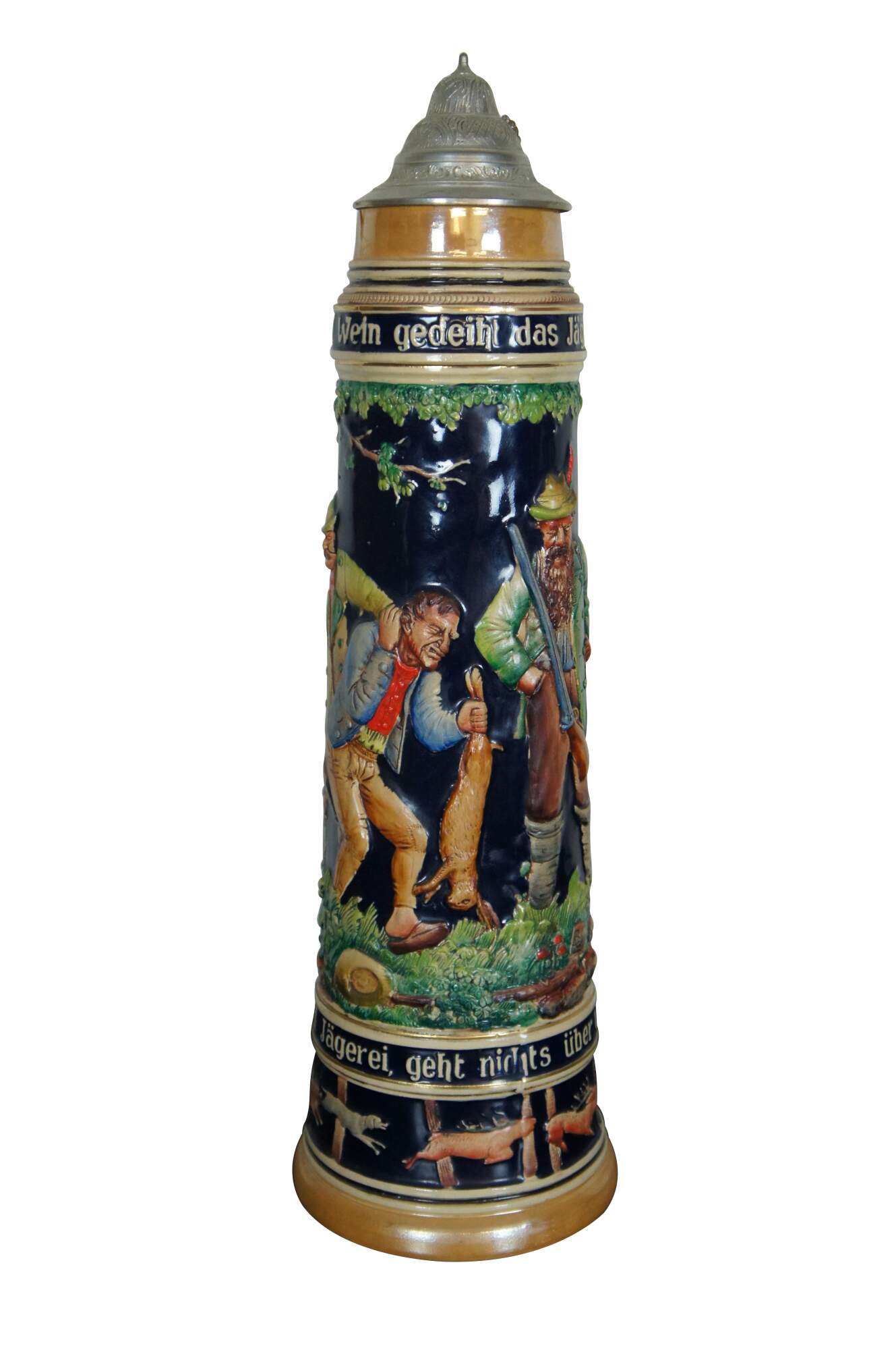 Oversized German five liter stein, lidded mug or tankard featuring a hunt theme with two men holding shotguns while another carries a rabbit. Adorned with foxes, dogs / hounds and forest designs.