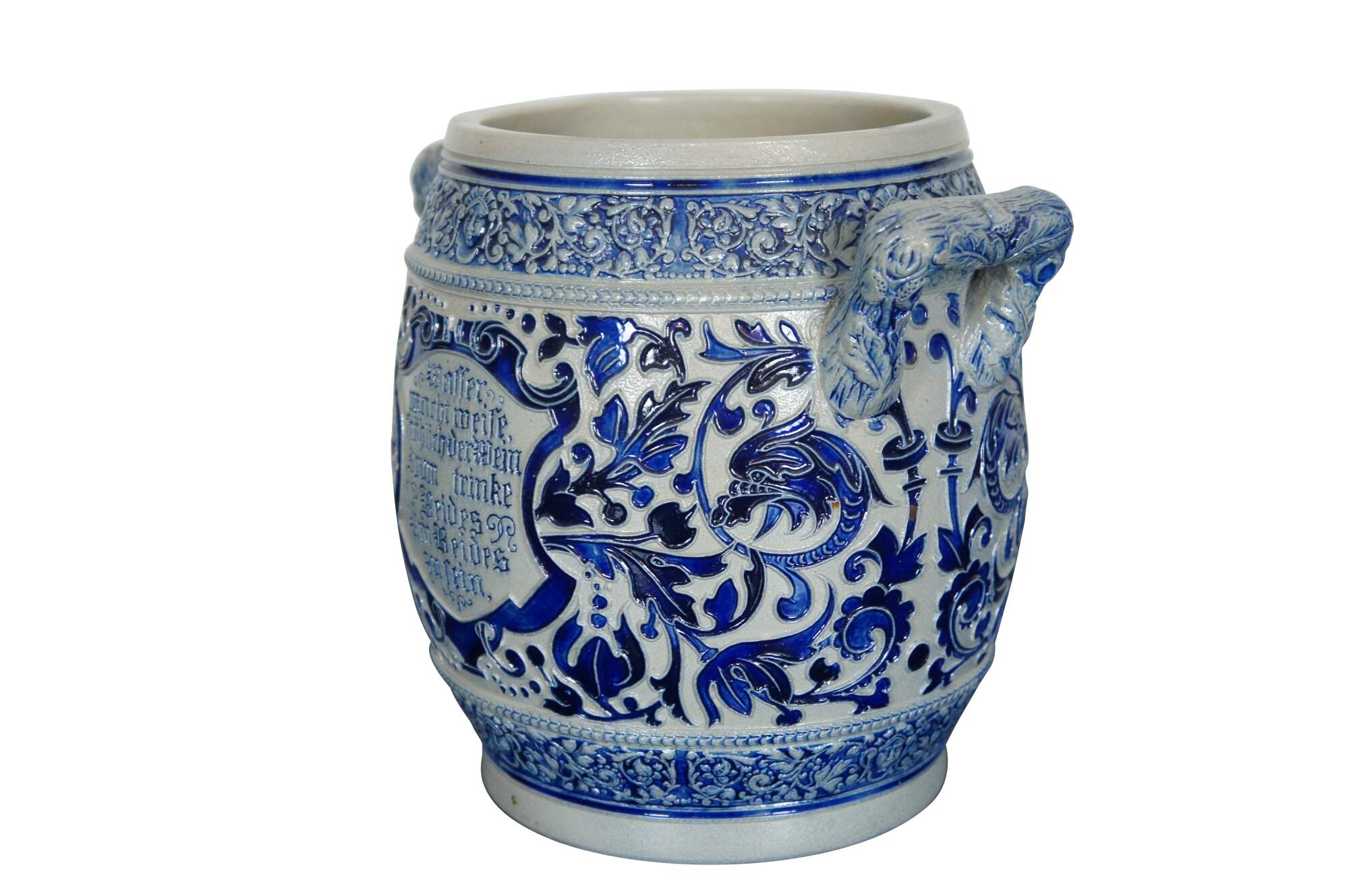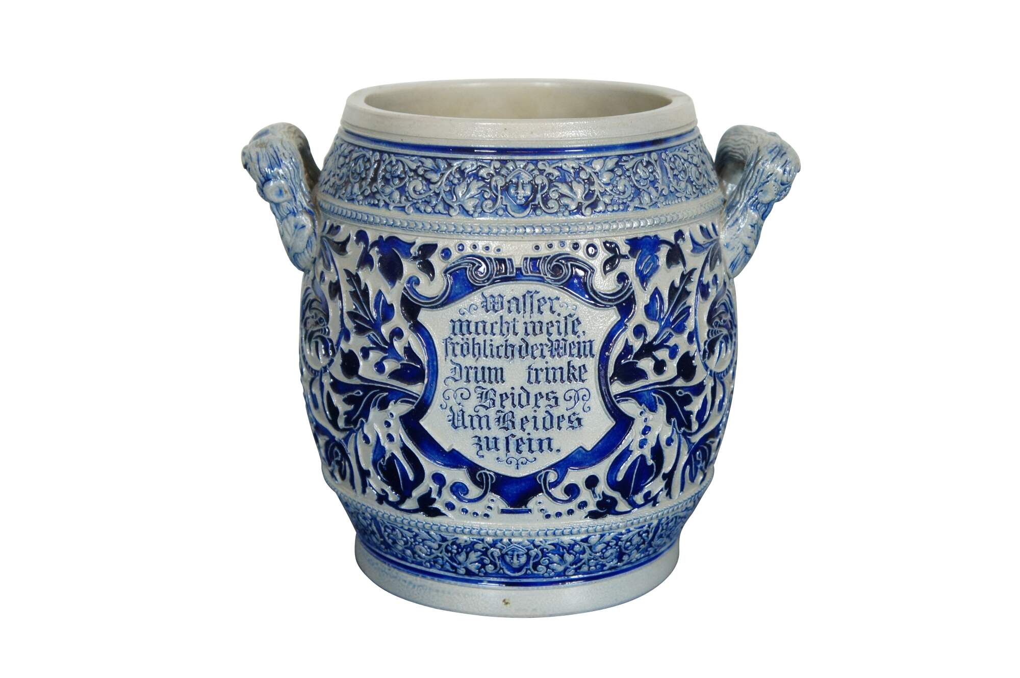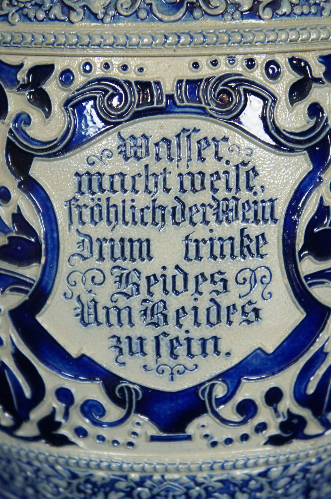 Text reads: Gin gut Gericht ein guter Trnnk Hatimmer einen guten Klang. / Waffer macht meife, Frohlichder Mein Drum trinke Seides Um Beides zufein. Translates to Gin good dish a good drink always has a good sound. / Weapon makes meife, cheerful man, I drink silk to make both fine.