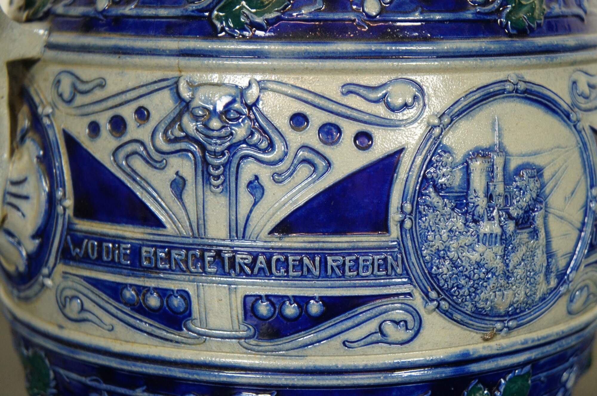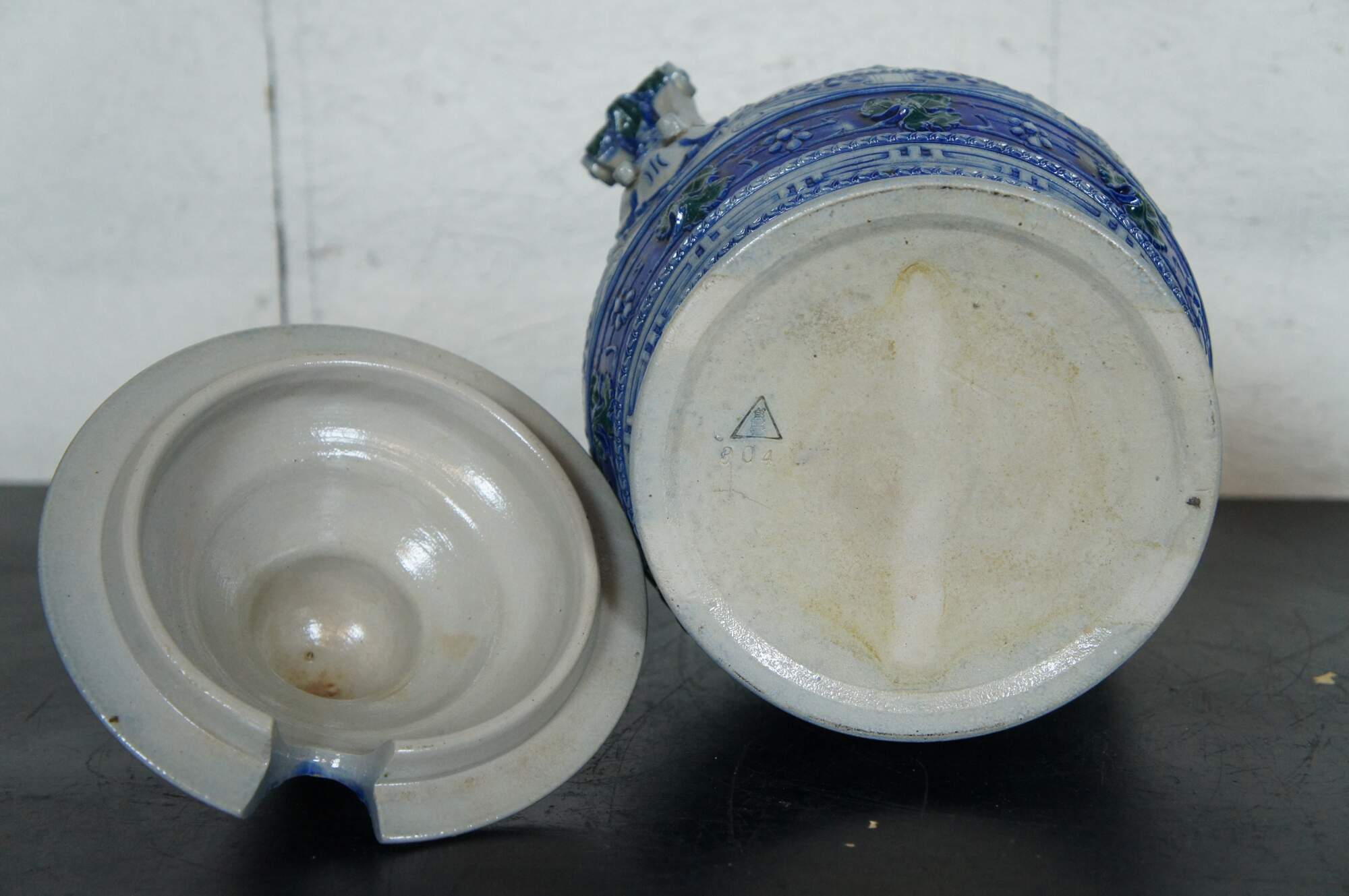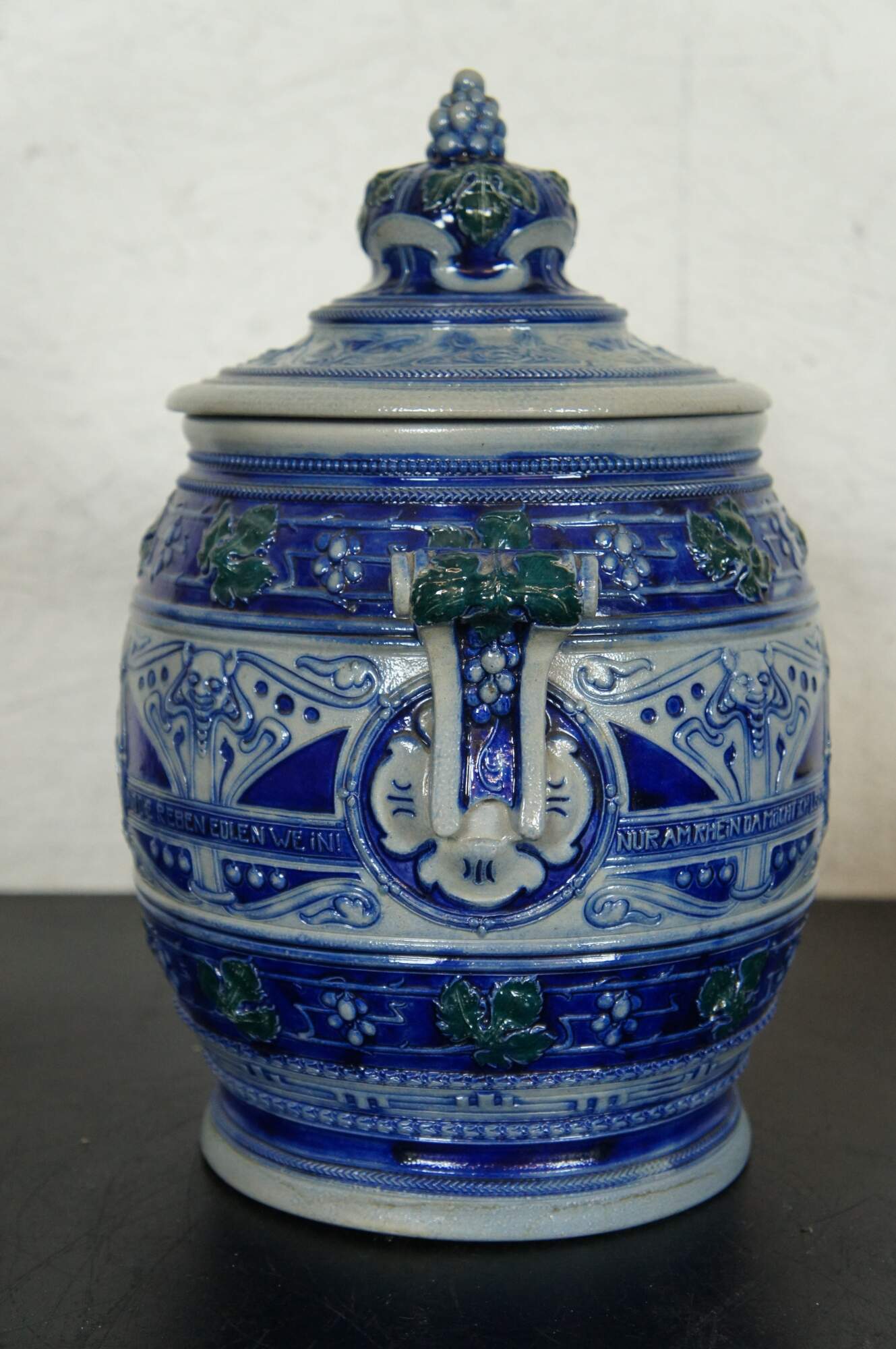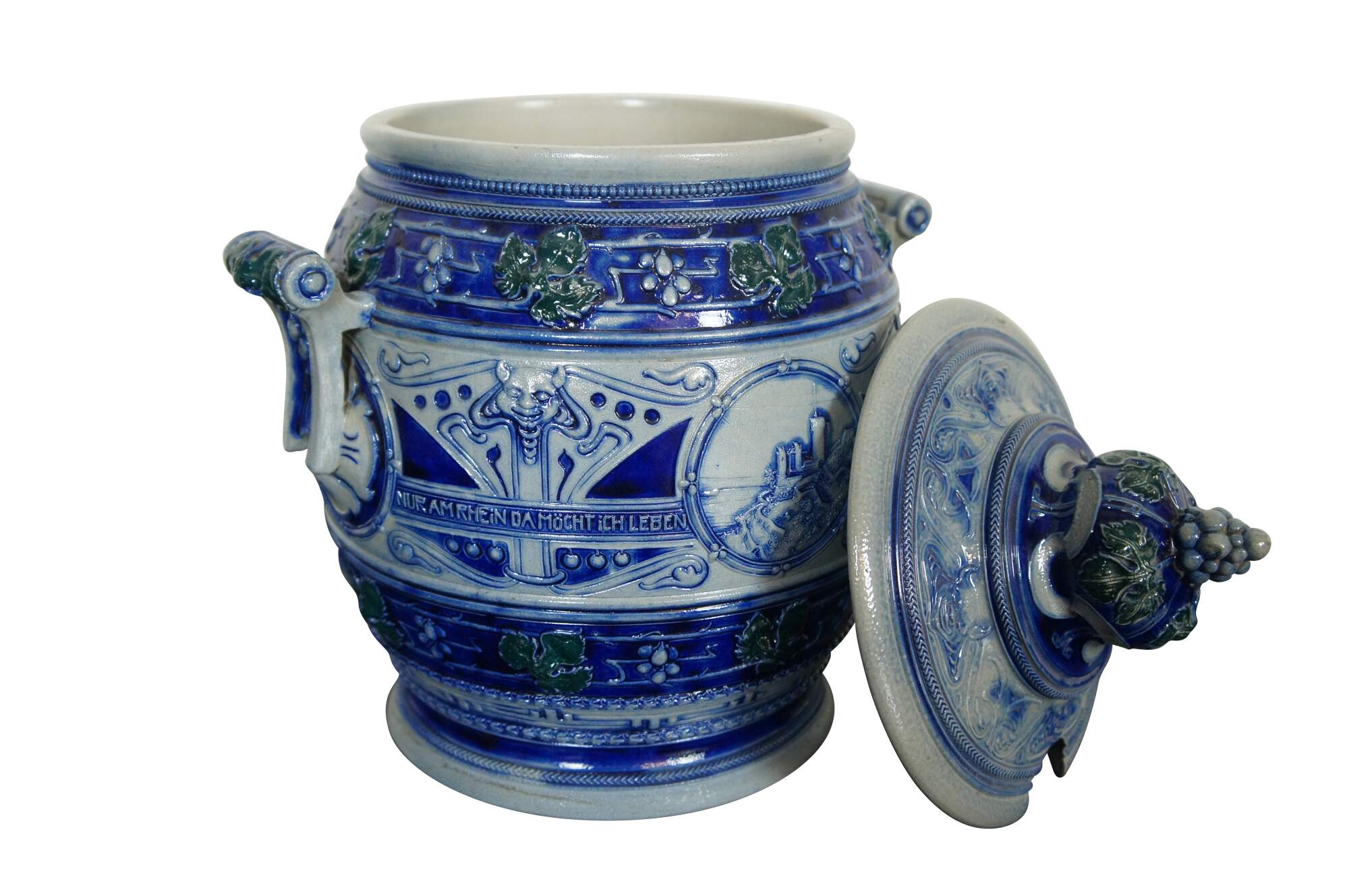 Antique German Westerwald cobalt blue salt glaze stoneware pottery rumtopf jar / crock / tureen with lid. Features a floral and grapevine / grape leaf theme with castle landscape and devil like faces.