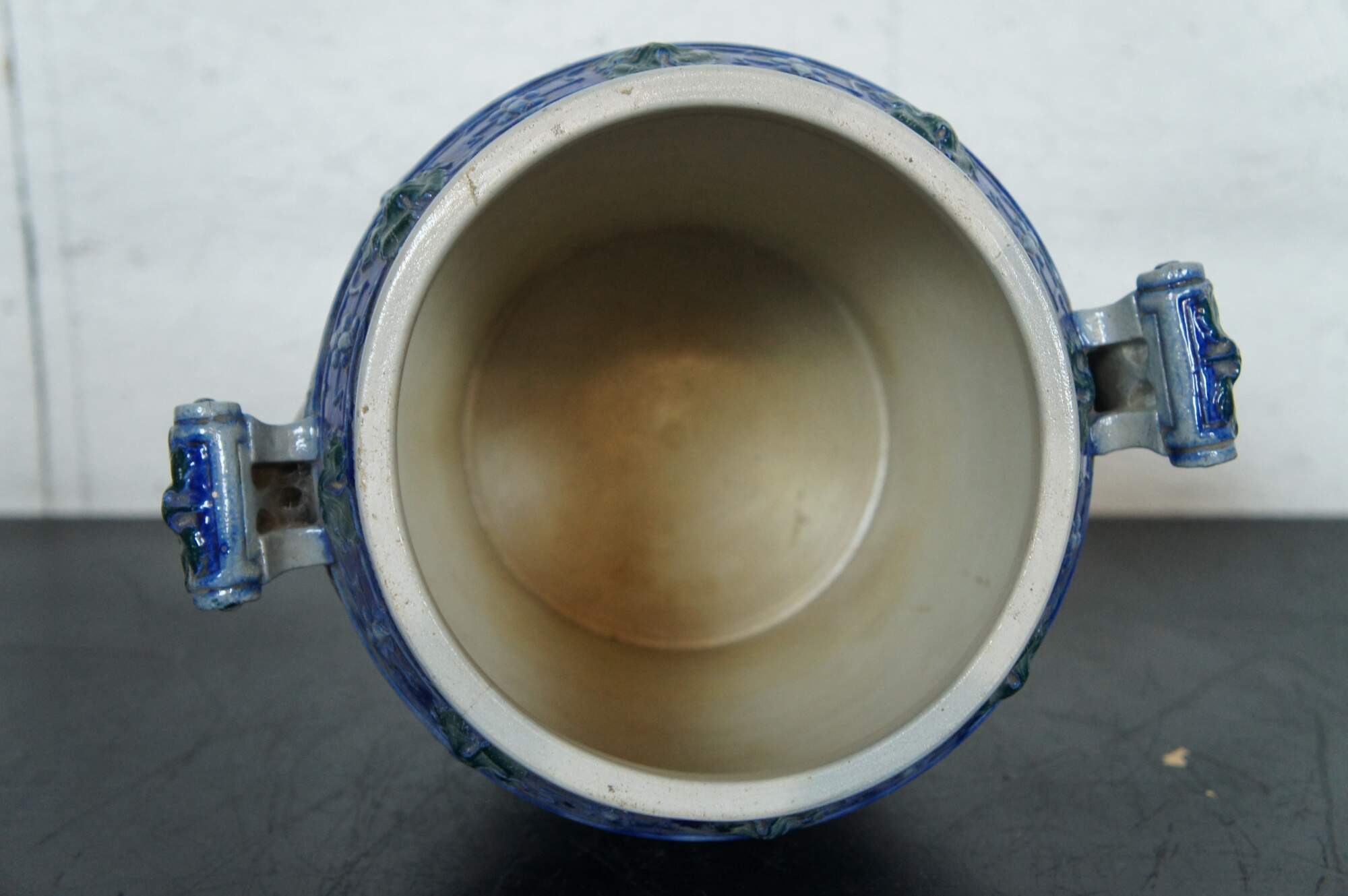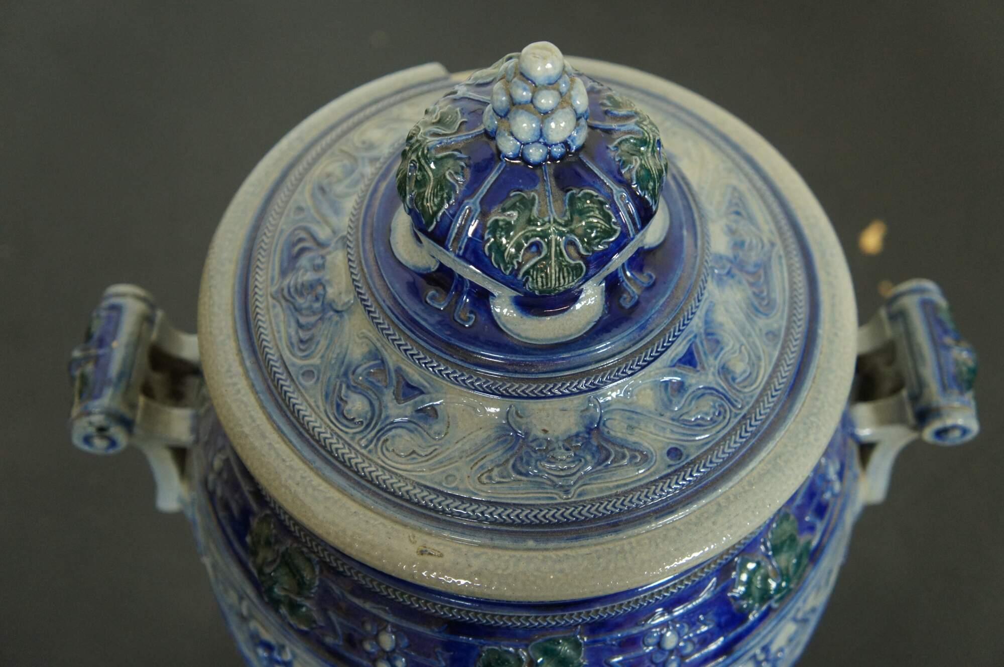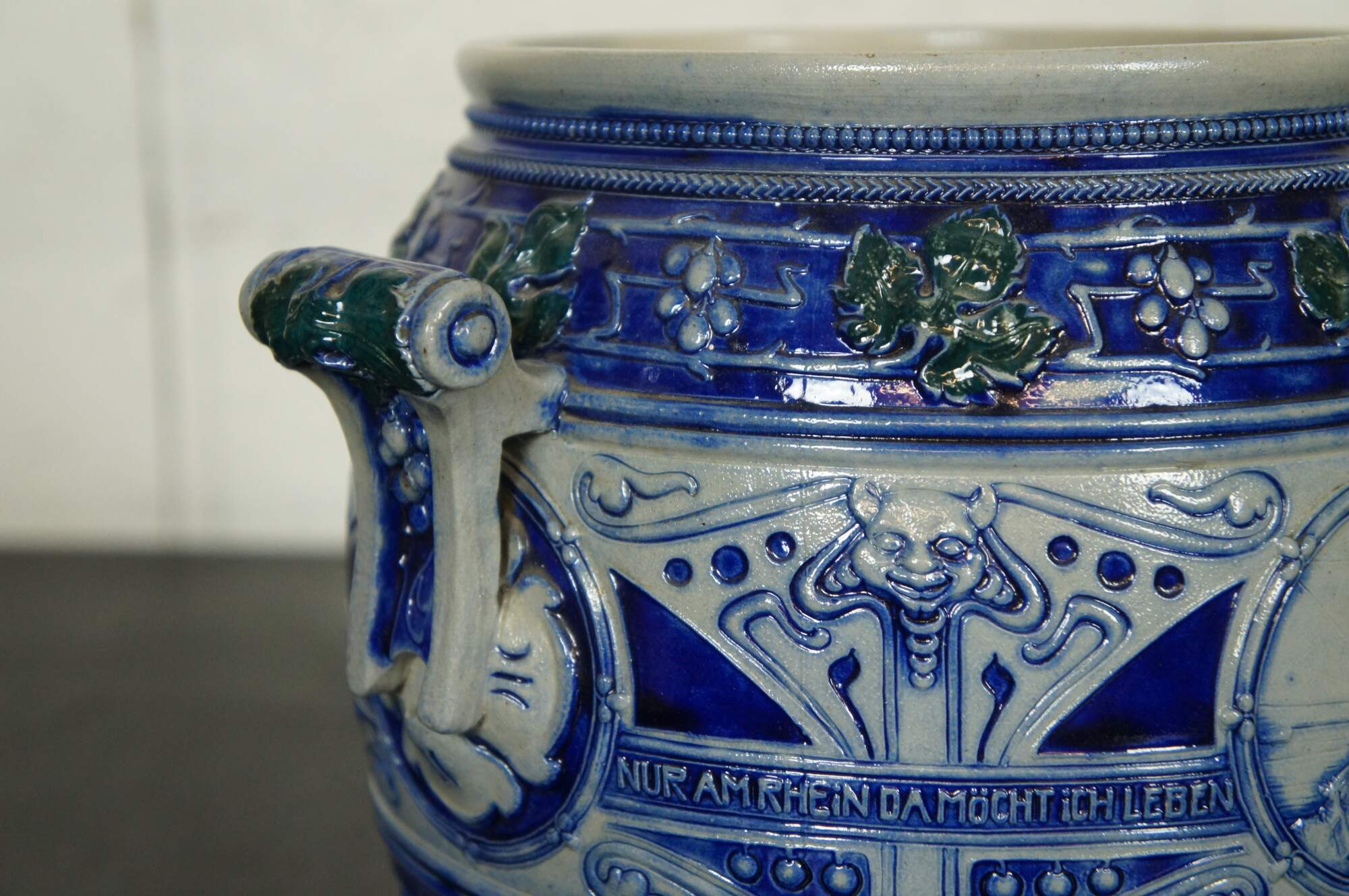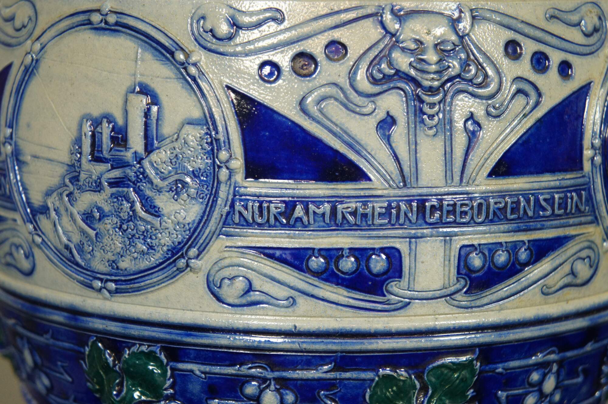Antique German Westerwald cobalt blue salt glaze stoneware pottery rumtopf jar / crock / tureen with lid. Features a floral and grapevine / grape leaf theme with castle landscape and devil like faces.