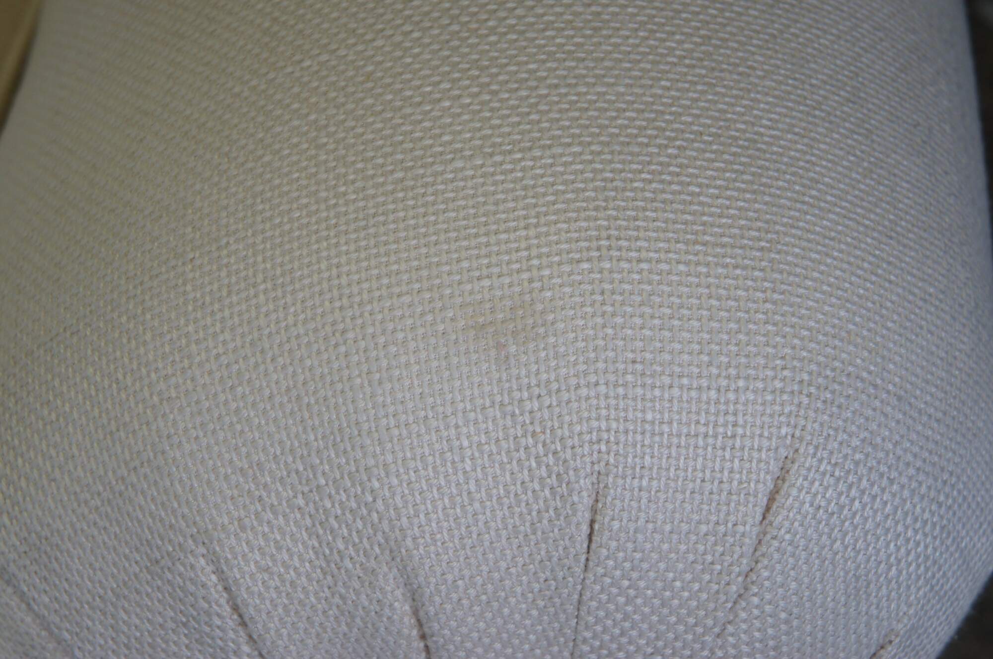 Vintage pair of two contemporary / modern lounge sofas featuring plush overstuffed rolled arm design with off white cotton fabric, skirted base and lumbar pillows. Attributed to Taylor King.