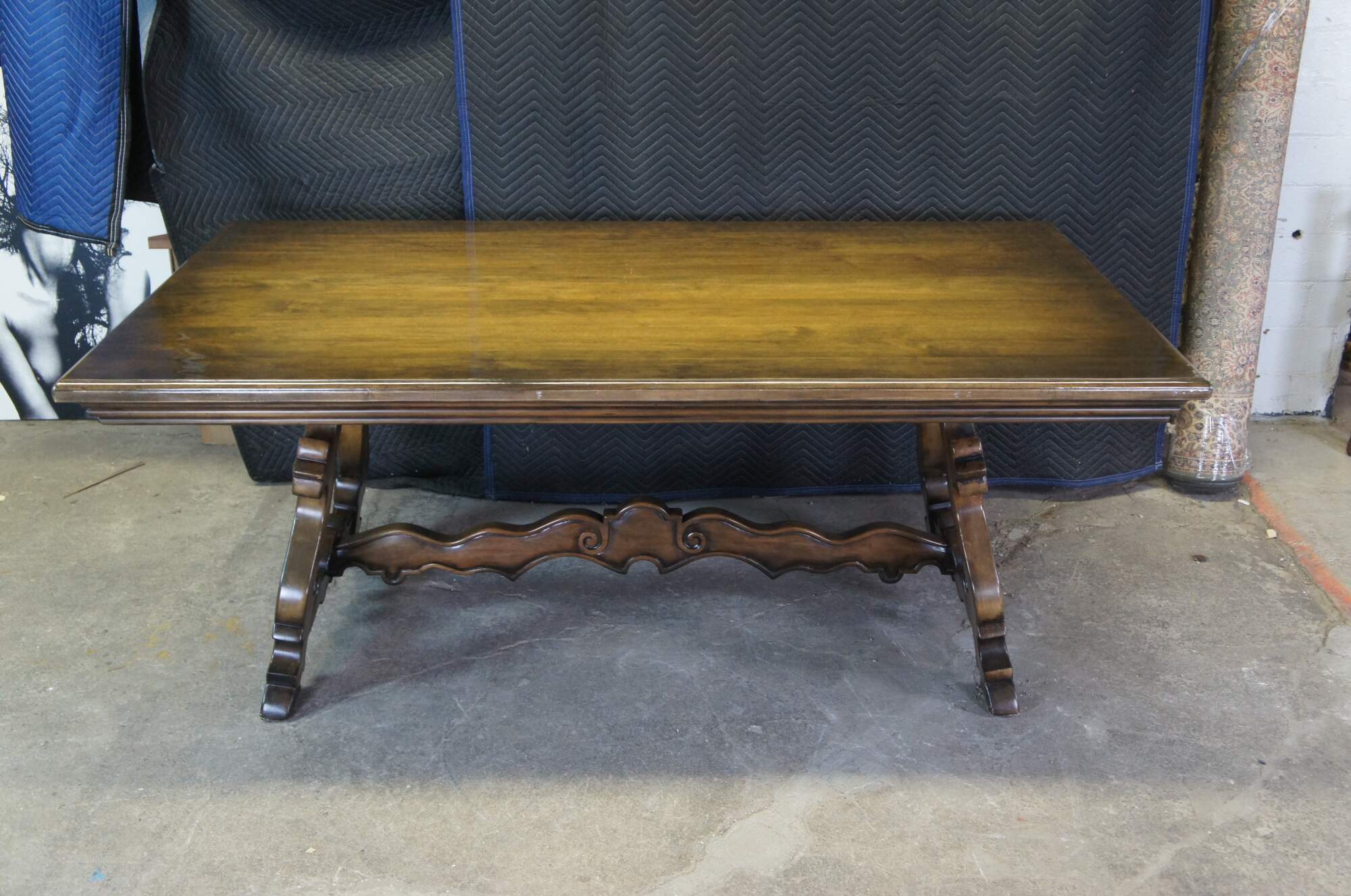Vintage Spanish Revival / Tuscan / old world dining table. Made of walnut featuring rectangular form with carved baroque serpentine legs connected by a trestle.