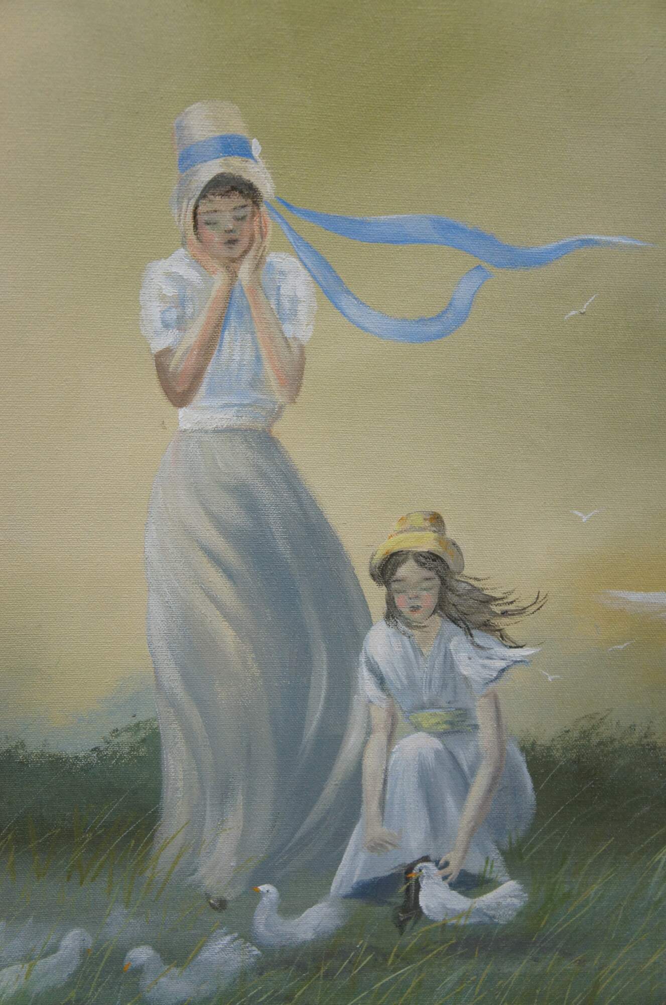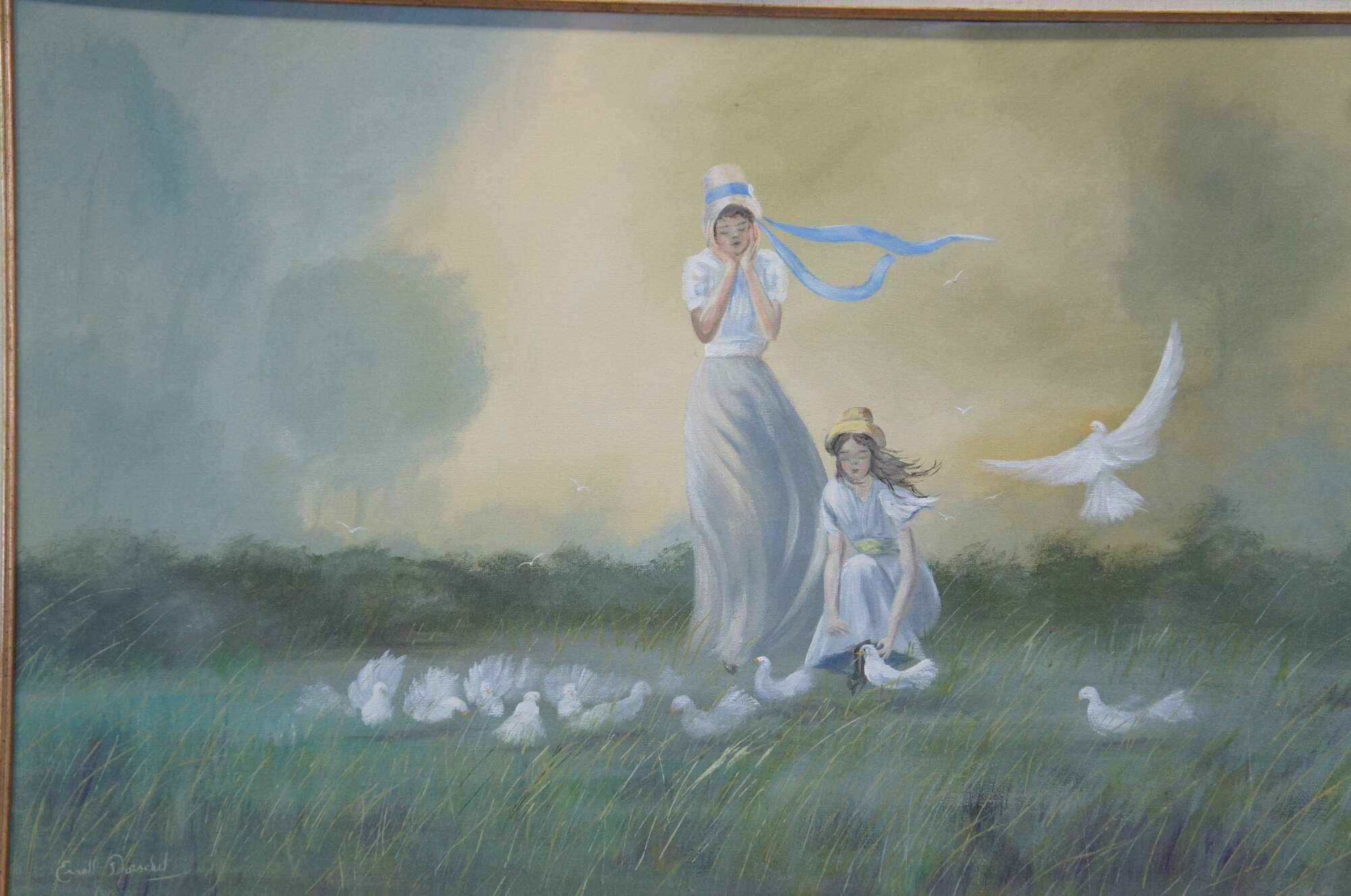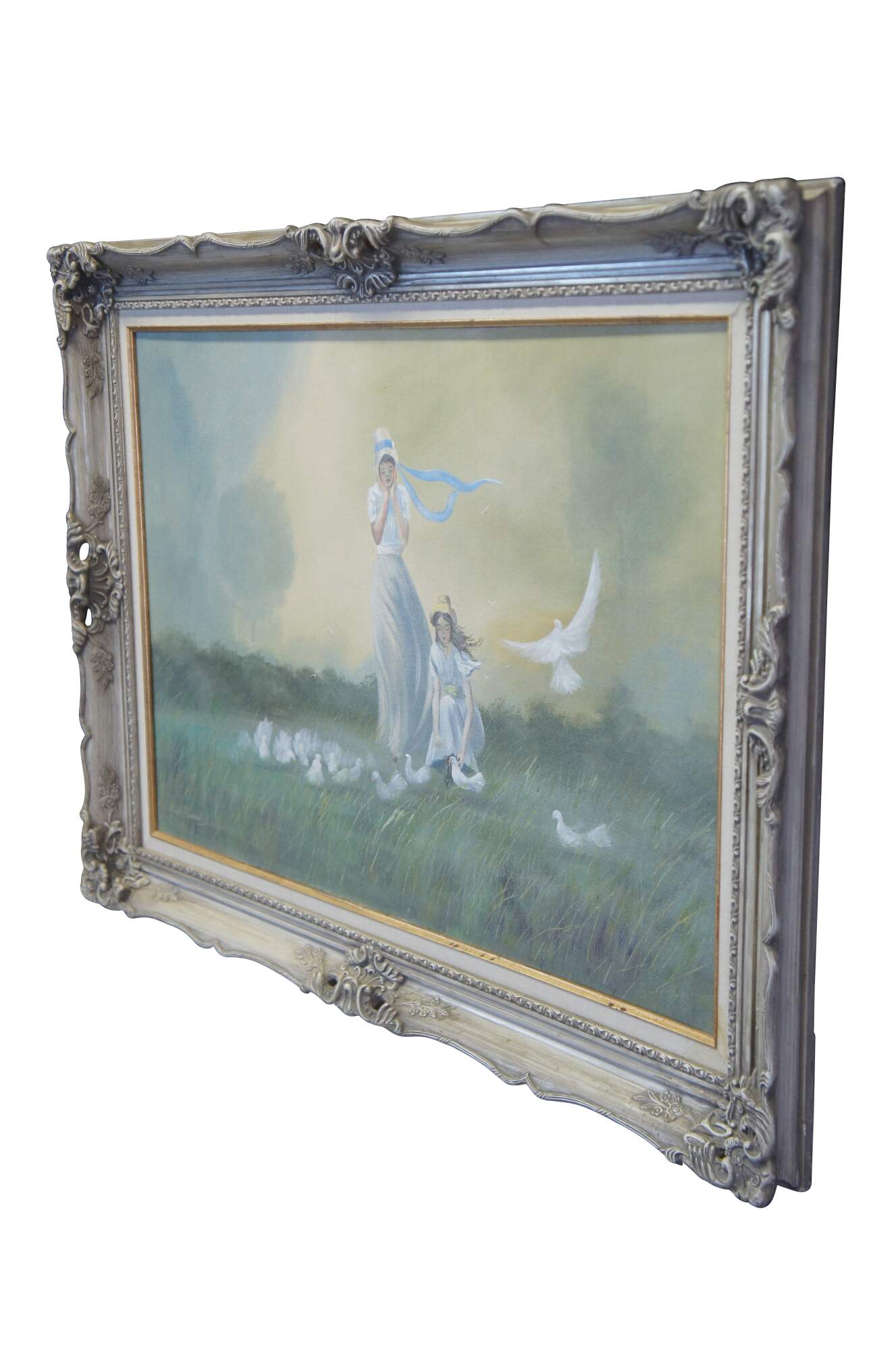Vintage Erroll Dorschel original landscape oil painting on canvas. Featuring two girls walking through the prairie with birds / doves. Framed in scalloped baroque frame.