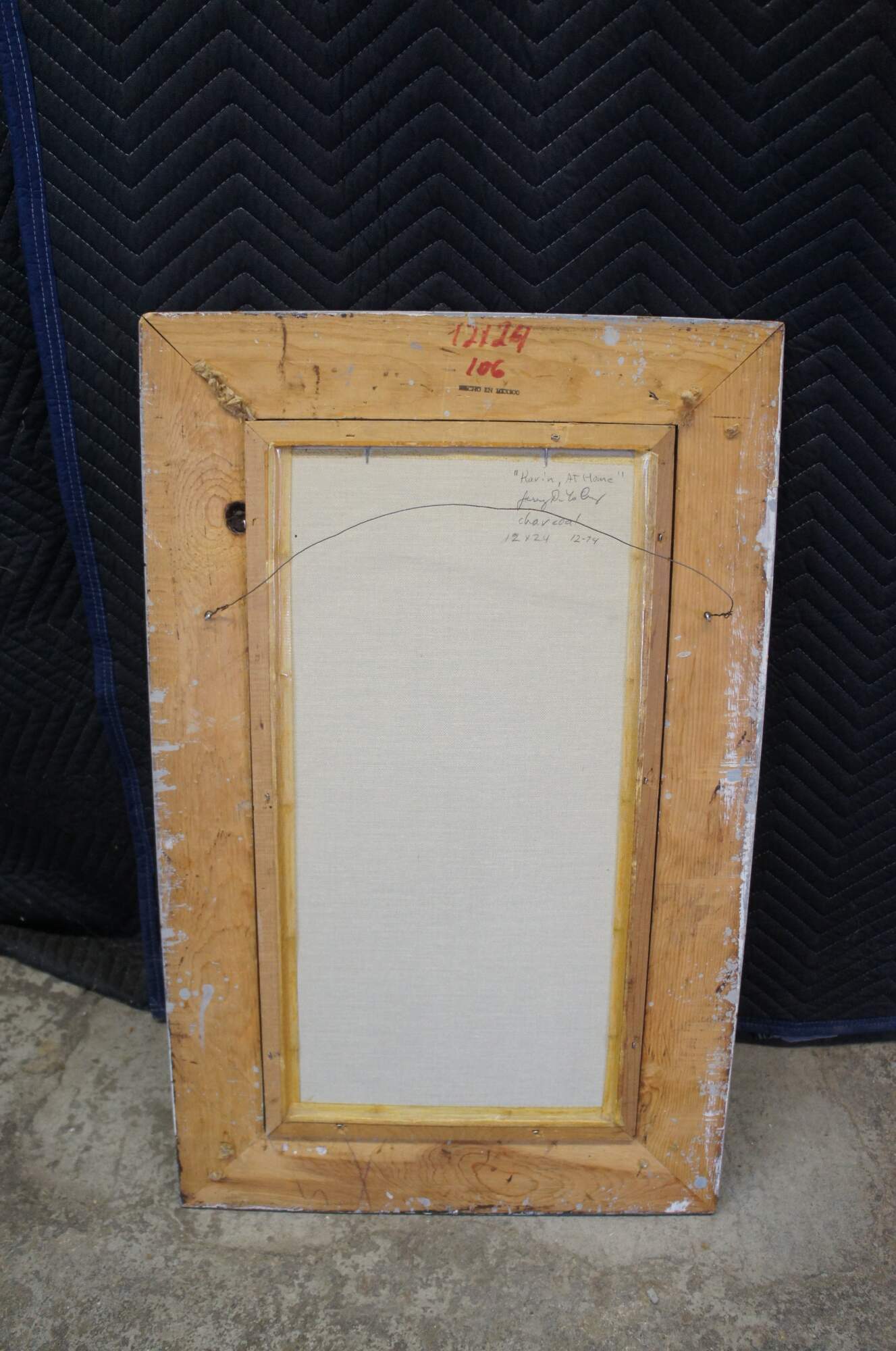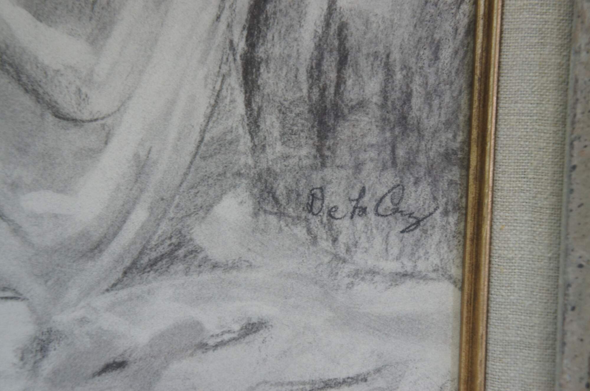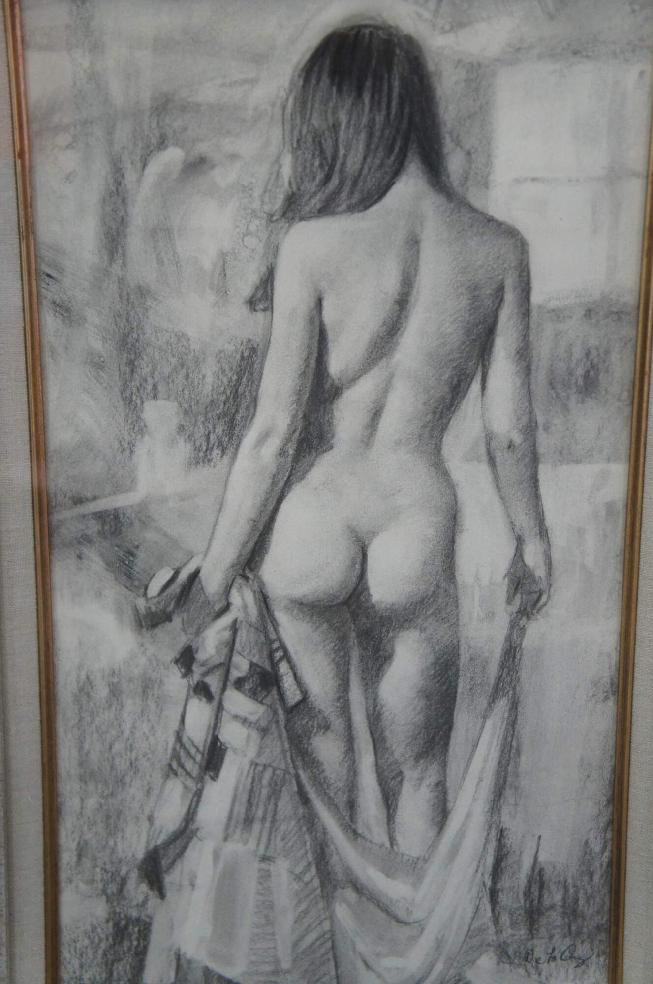 Vintage Jerry Del La Cruz original charcoal drawing on paper titled Kavin, At Home. Features a nude female figure undressing. Circa 1974.