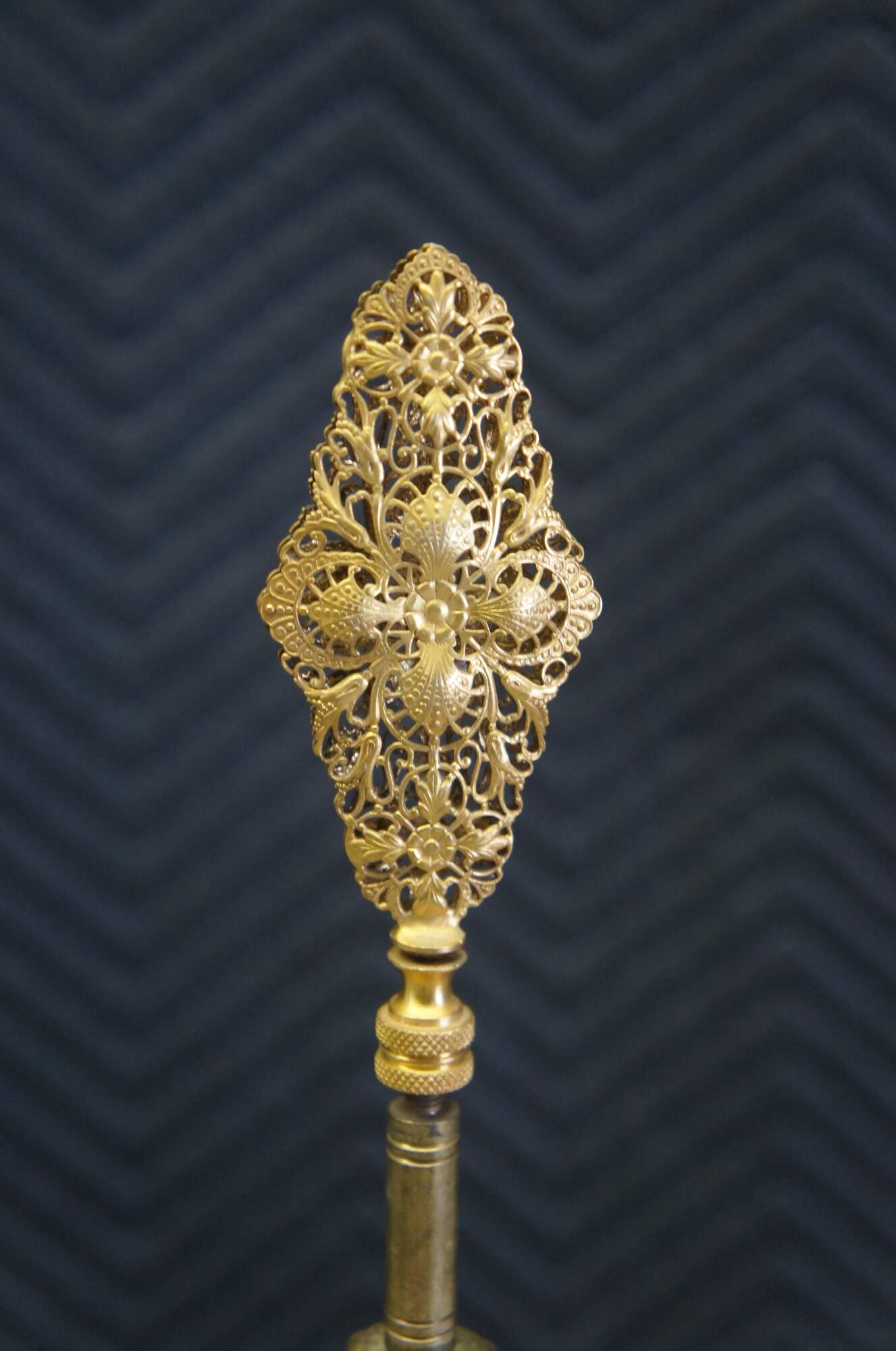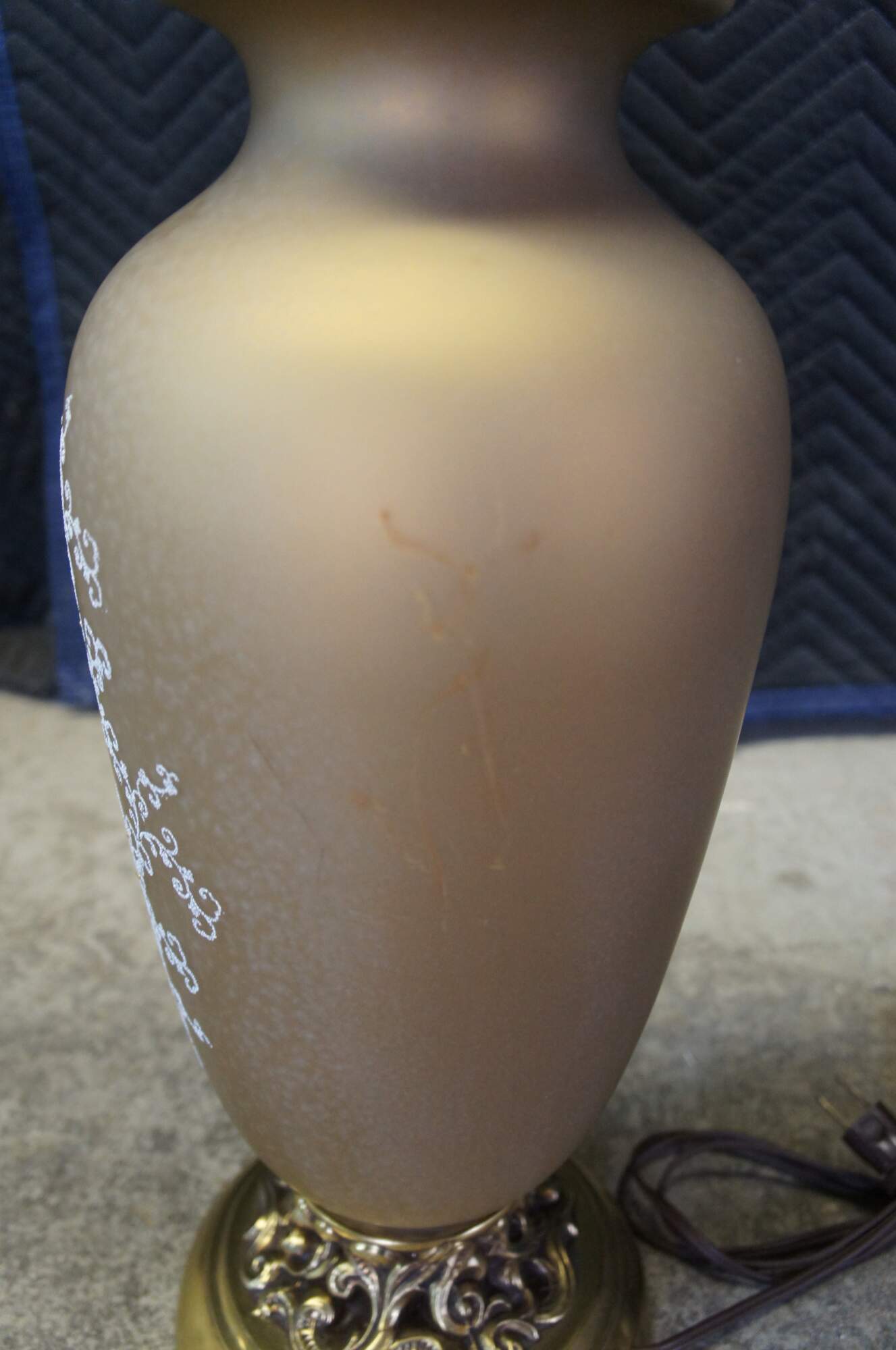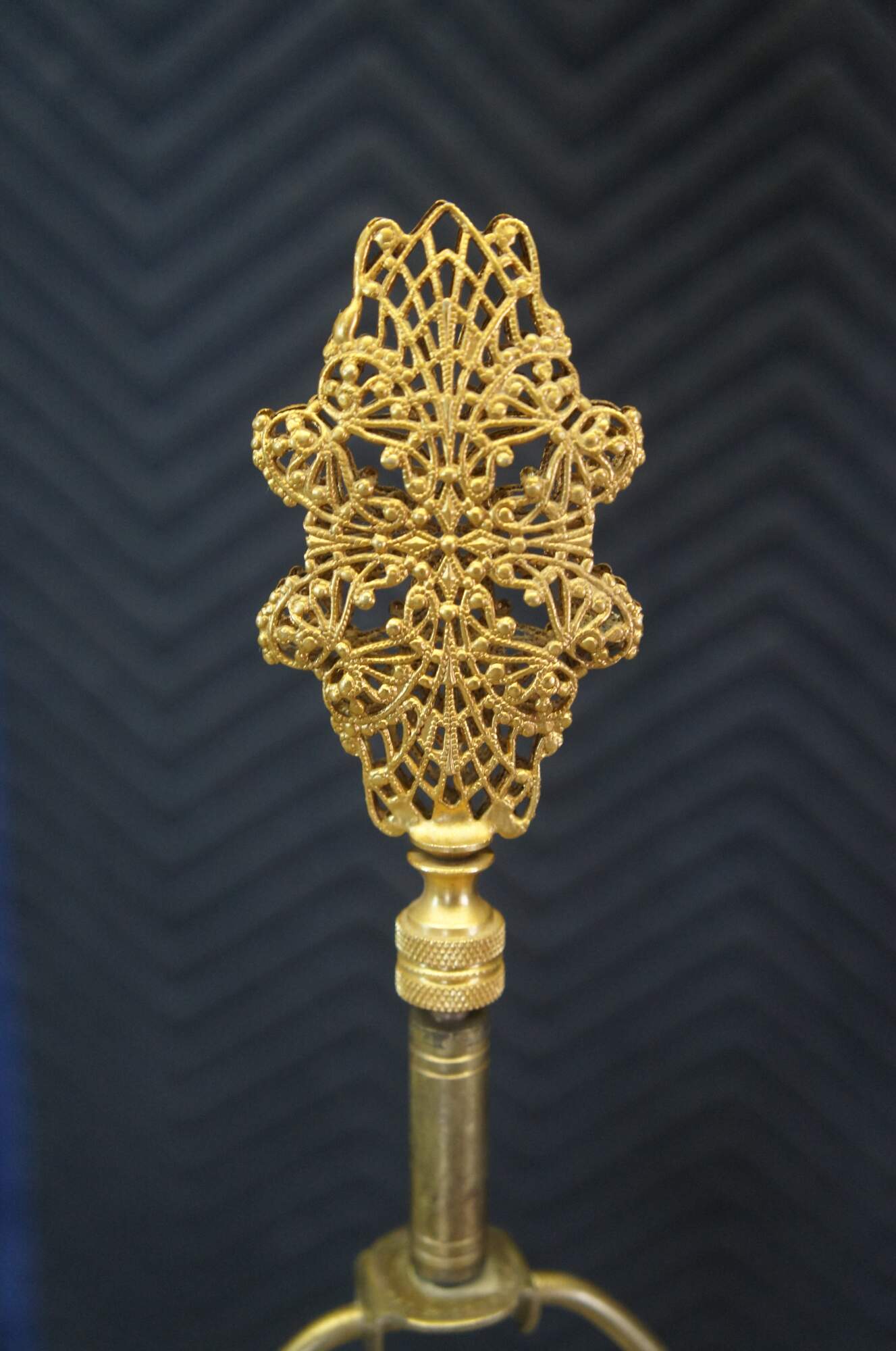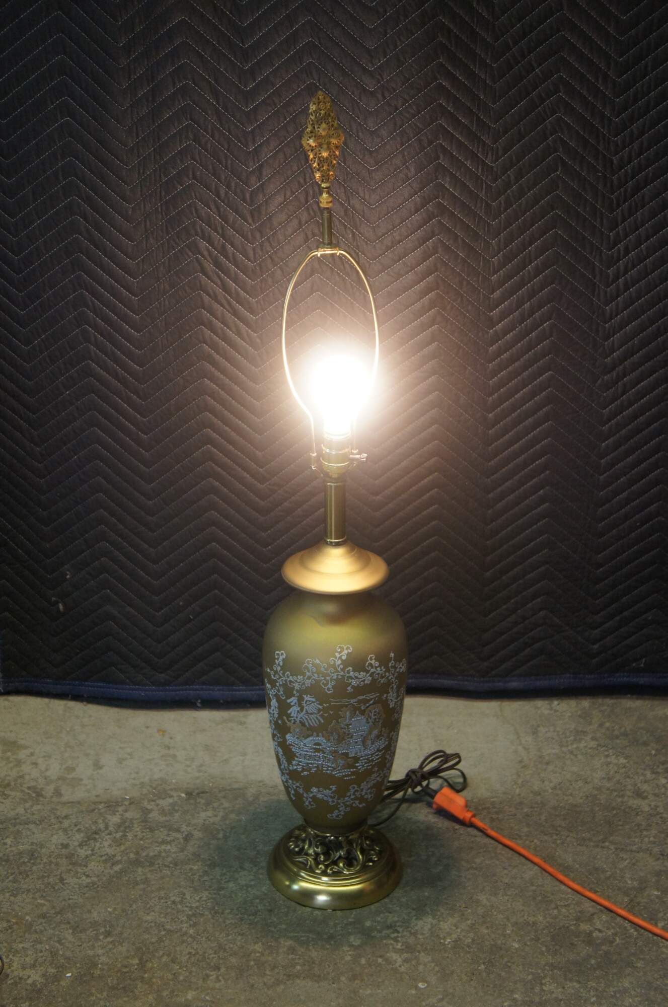 Two vintage Japanese Satsuma moriage painted table lamps. Made of porcelain featuring a chinoiserie theme landscape scene of pagodas, bridges, flowers and trees. Includes brass filigree finials.