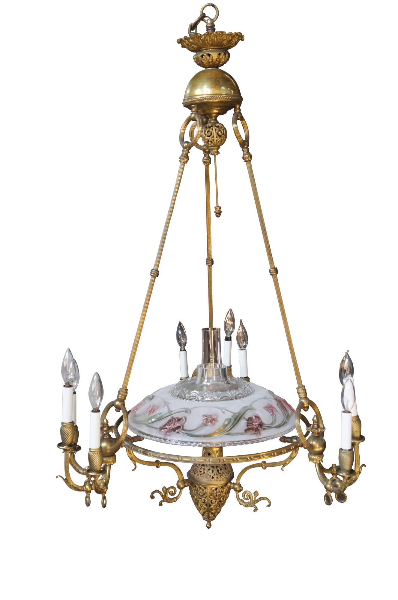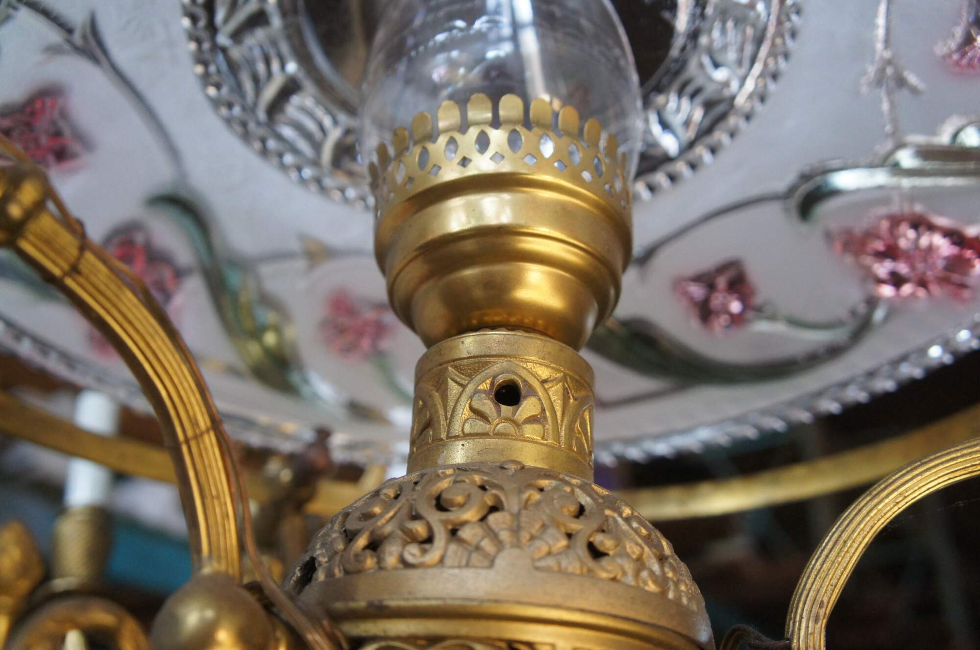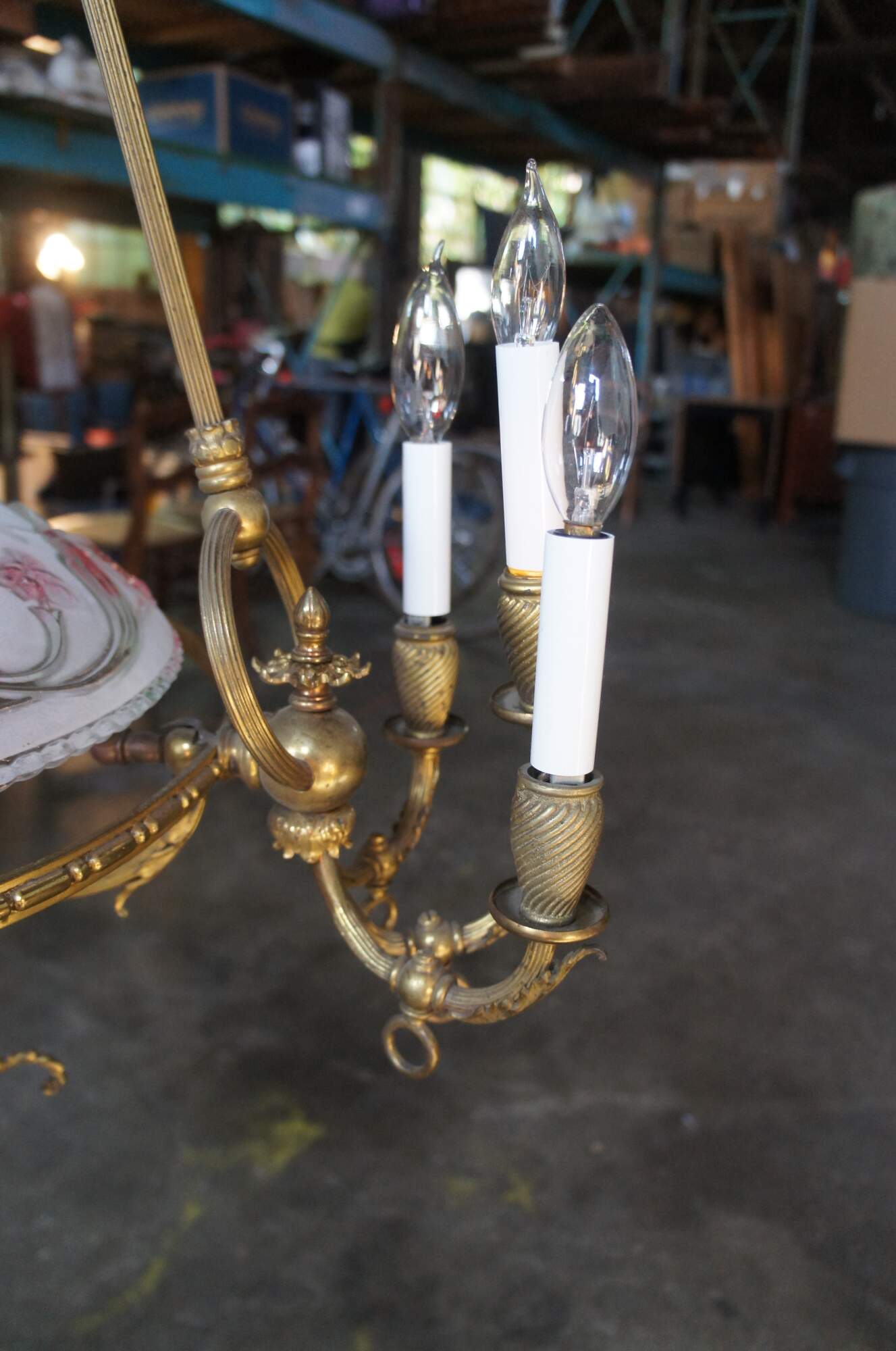 Good Antique Condition; General age and use related wear. Converted from gas to electric. Some bending to arms and slight differences in candelabra light heights.