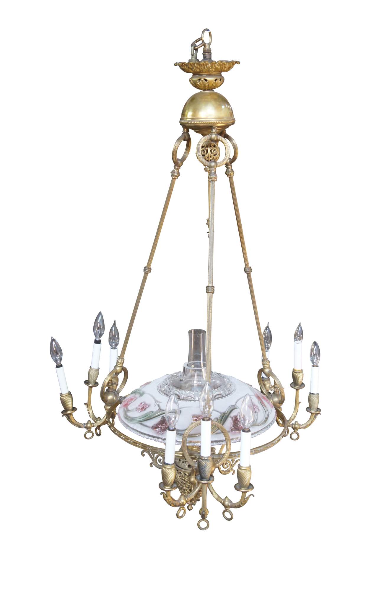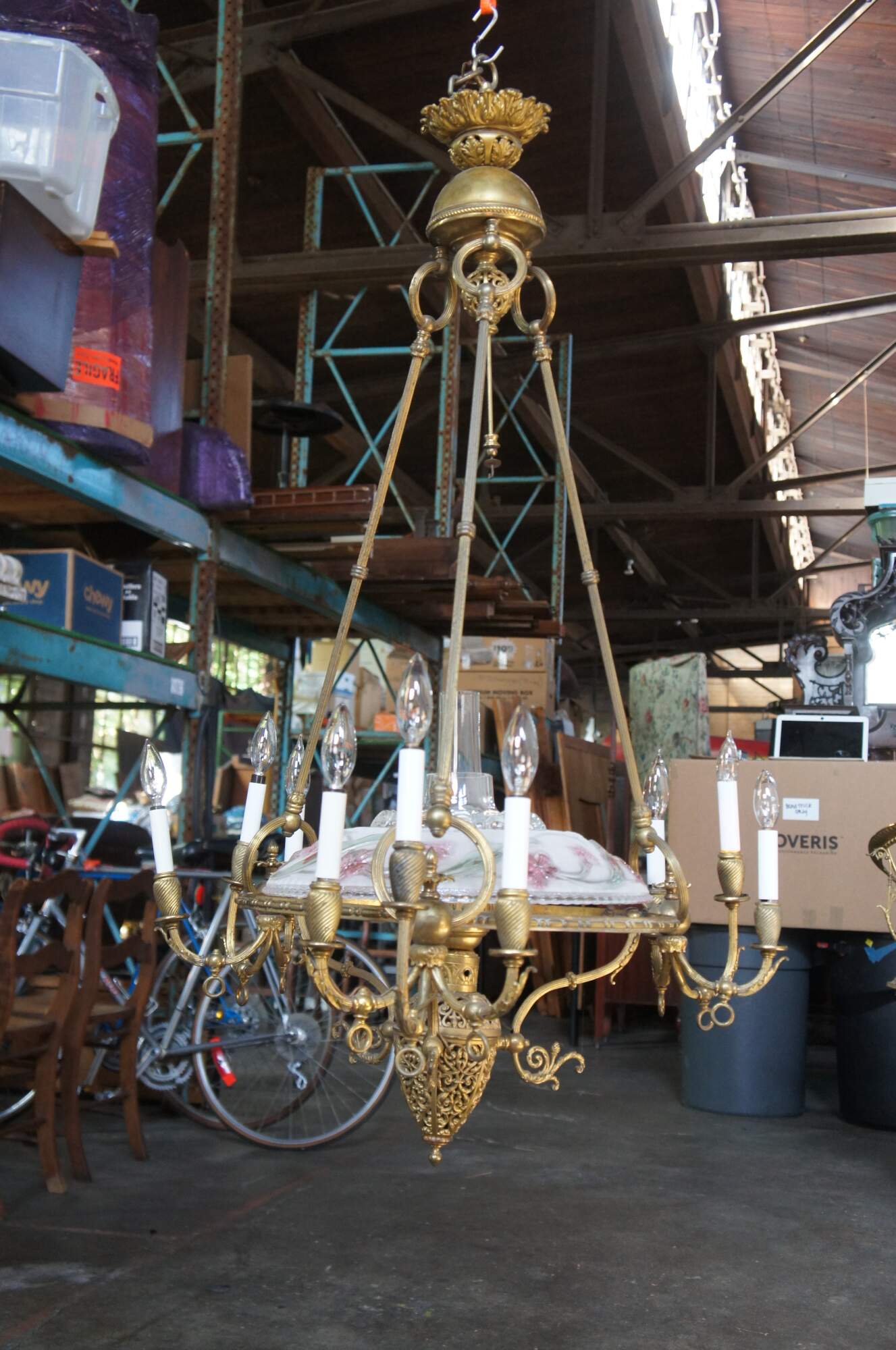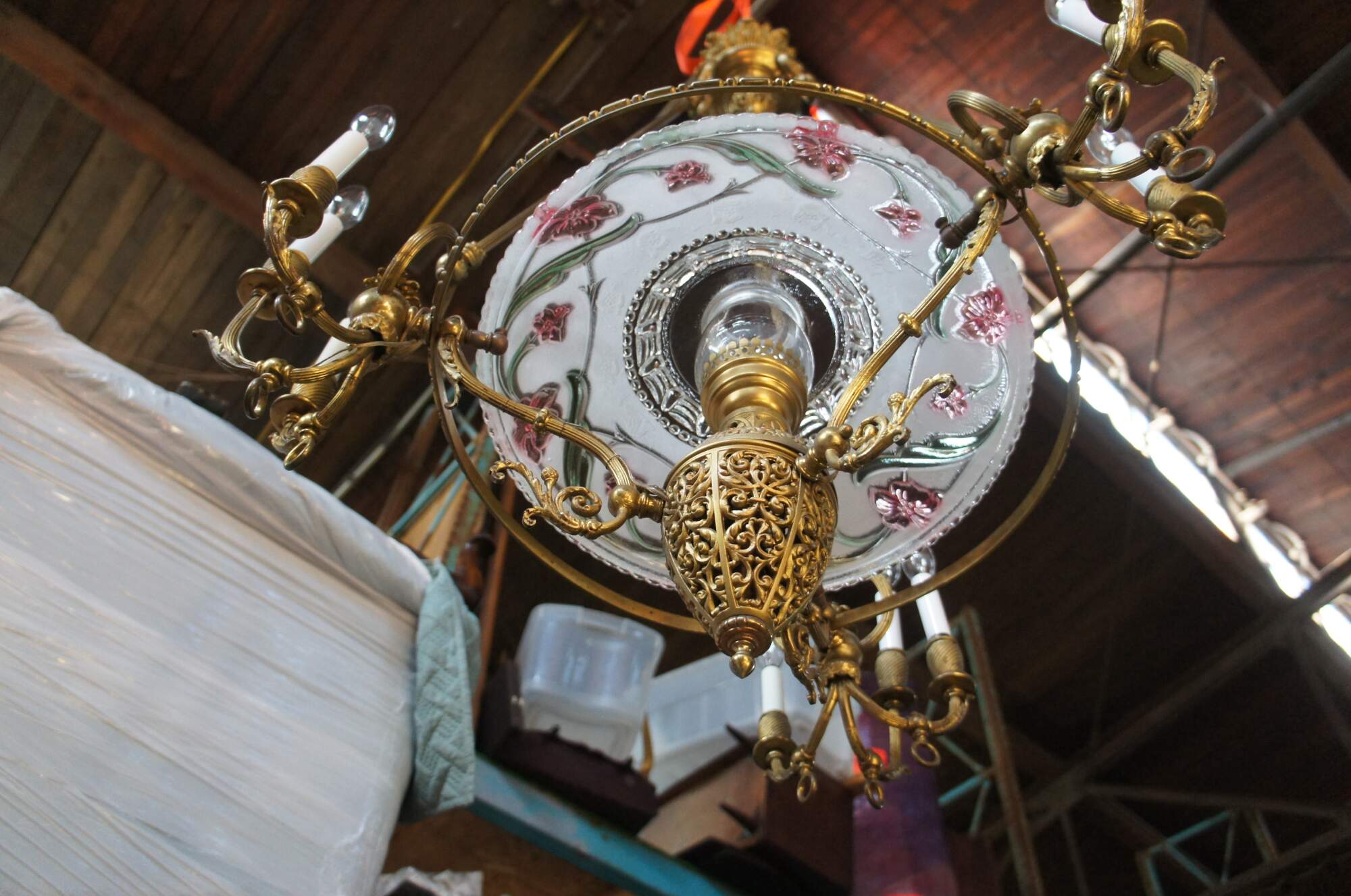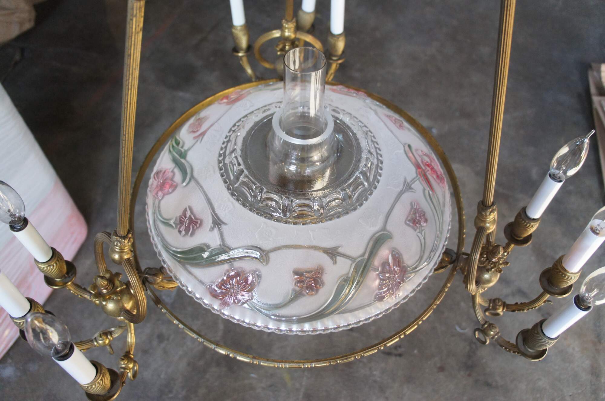 Good Antique Condition; General age and use related wear. Converted from gas to electric. Some bending to arms and slight differences in candelabra light heights.