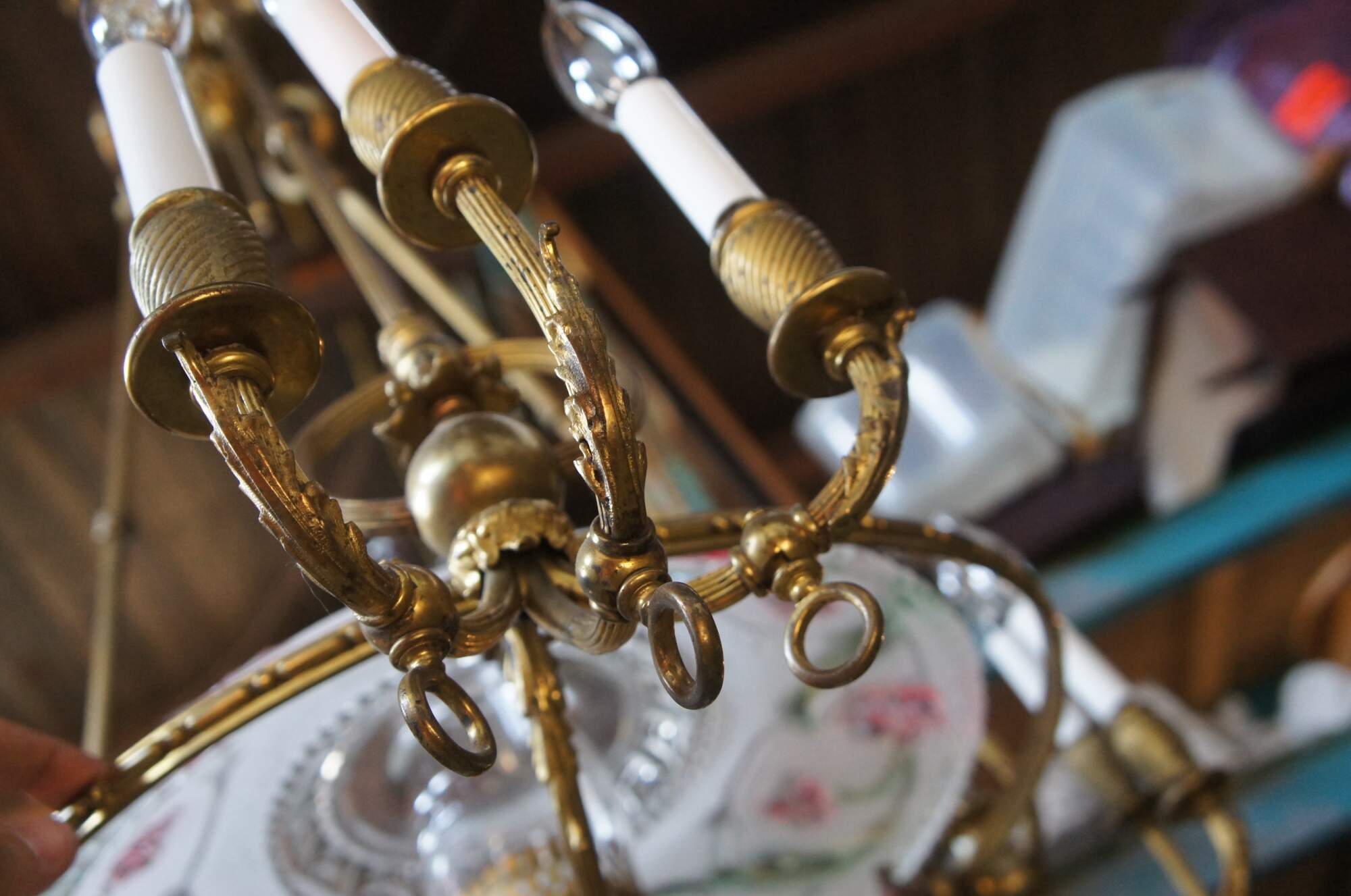 An impressive Victorian era Neoclassical converted gas chandelier. Made from brass with ornate filigree throughout. The chandelier is supported by an acanthus medallion that leads to a reverse urn over reeded rings and rods. The three rods lead to a rounded lower tier flanked by three light candelabras. The center which is supported by three reeded and acanthus scrolled arms is accented by a beautiful pressed glass shade with sawtooth edge and flower motif. The glass shade is beaded at the center and fits over a hurricane lantern. The lower side which is in eyes view shows an elegant tapered center with S scrolled filigree panels and a lower finial. Each candle light arm has a ring at the bottom allowing for the addition of crystals. A beautiful work of art that will light up any space!