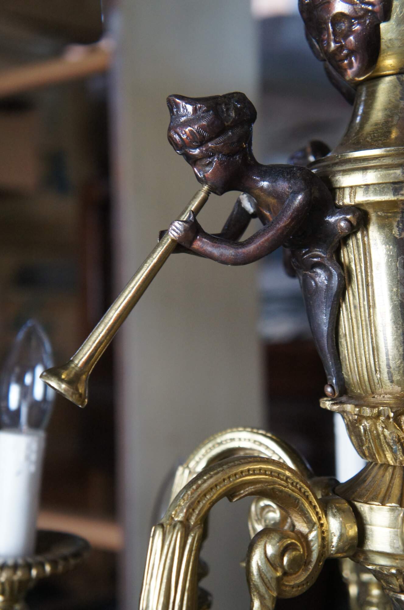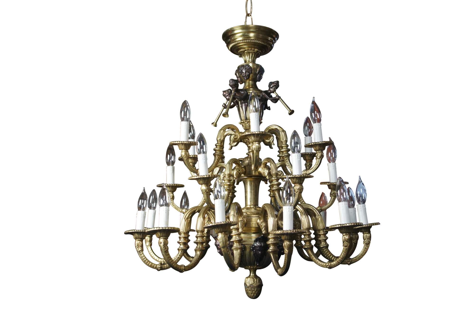 Impressive Louis XV / French Empire / Pierre Gouthière style gilt bronze twenty four light, three tier Cherub / angel / trumpet candlestick chandelier. Made of gilt bronze featuring Cherubs / Puttis / Angels playing trumpets, surrounded by three tier layer of serpentine candlestick lights, and large acorn drop finial.