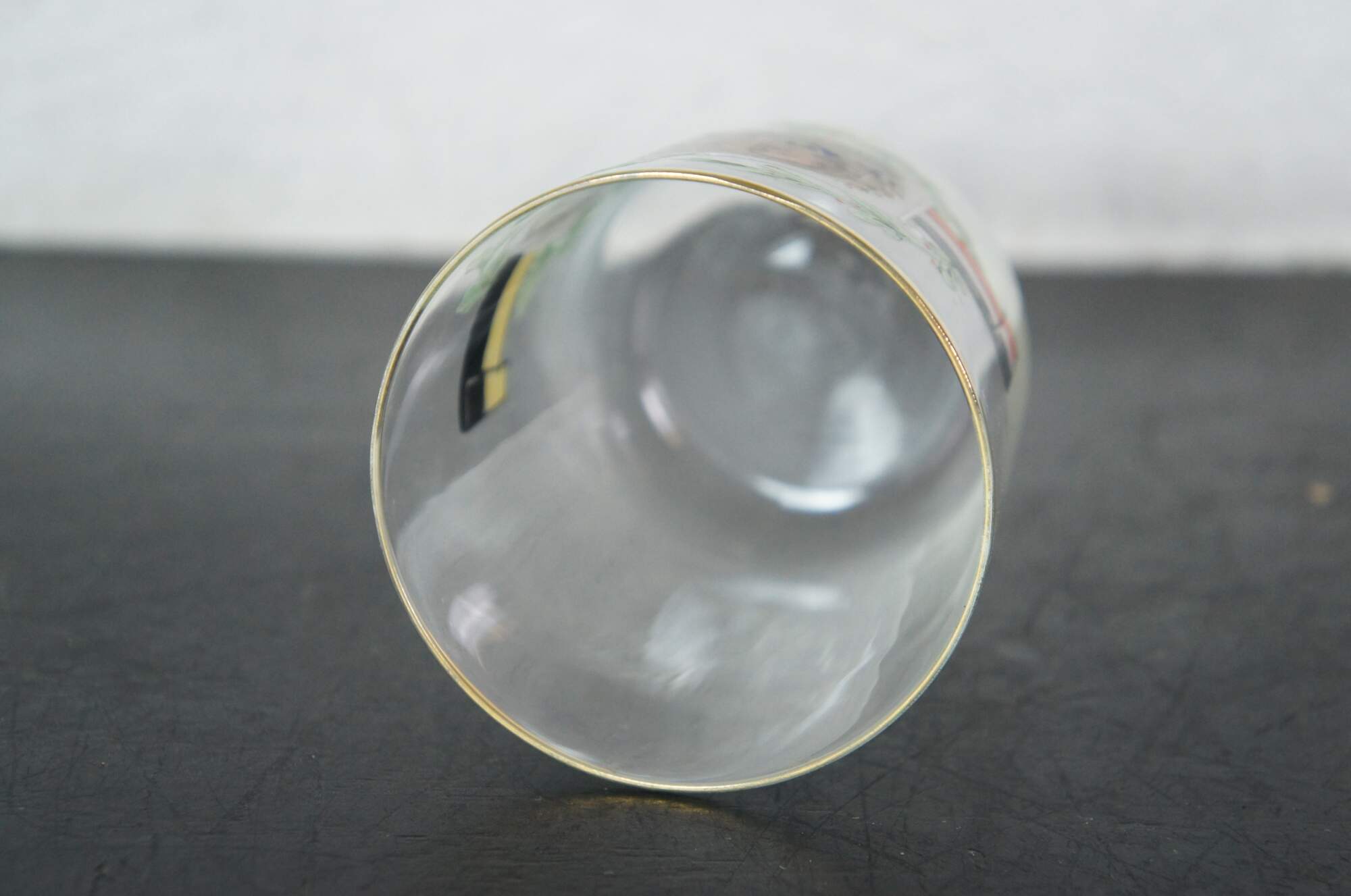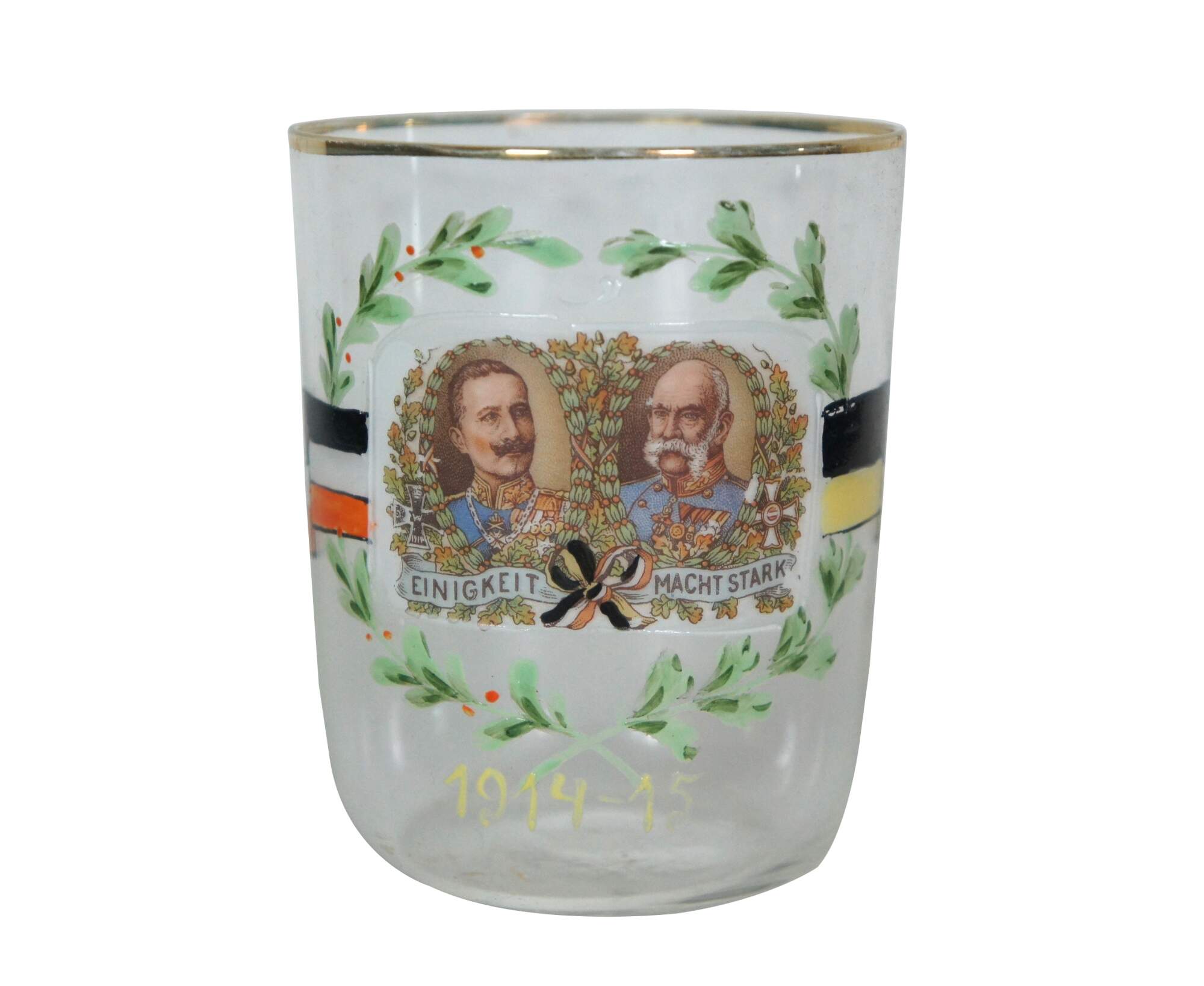 Antique early 20th century patriotic commemorative glass cup and pin depicting the decades long alliance of Kaiser Wilhelm II of Germany and Emperor Franz Jospeh I of Autria-Hungary. The glass features a litho print depiction of the rulers and the motto "Eingkeit Macht Stark" (Unity makes strength), surrounded by a hand painted wreath, country flags and the date 1914-15. The brass pin features a pair of flags containing portraits of the rulers over a wreath and smal plaque reading "1870 Sedan 1910." "The Battle of Sedan, was a decisive defeat of the French army on September 1, 1870, during the Franco-German War, causing the surrender of Napoleon III and the fall of the Bonaparte dynasty and the Second French Empire." (Source: Brittanica)