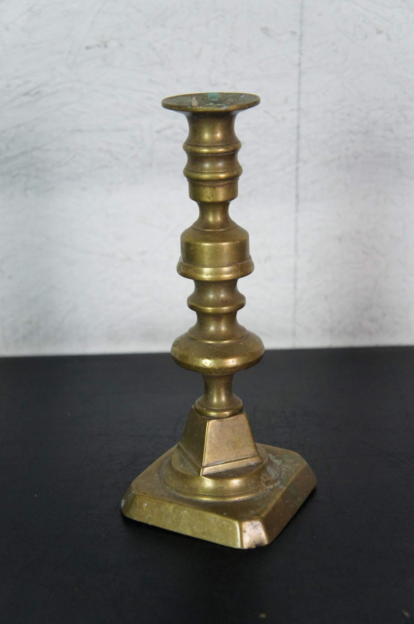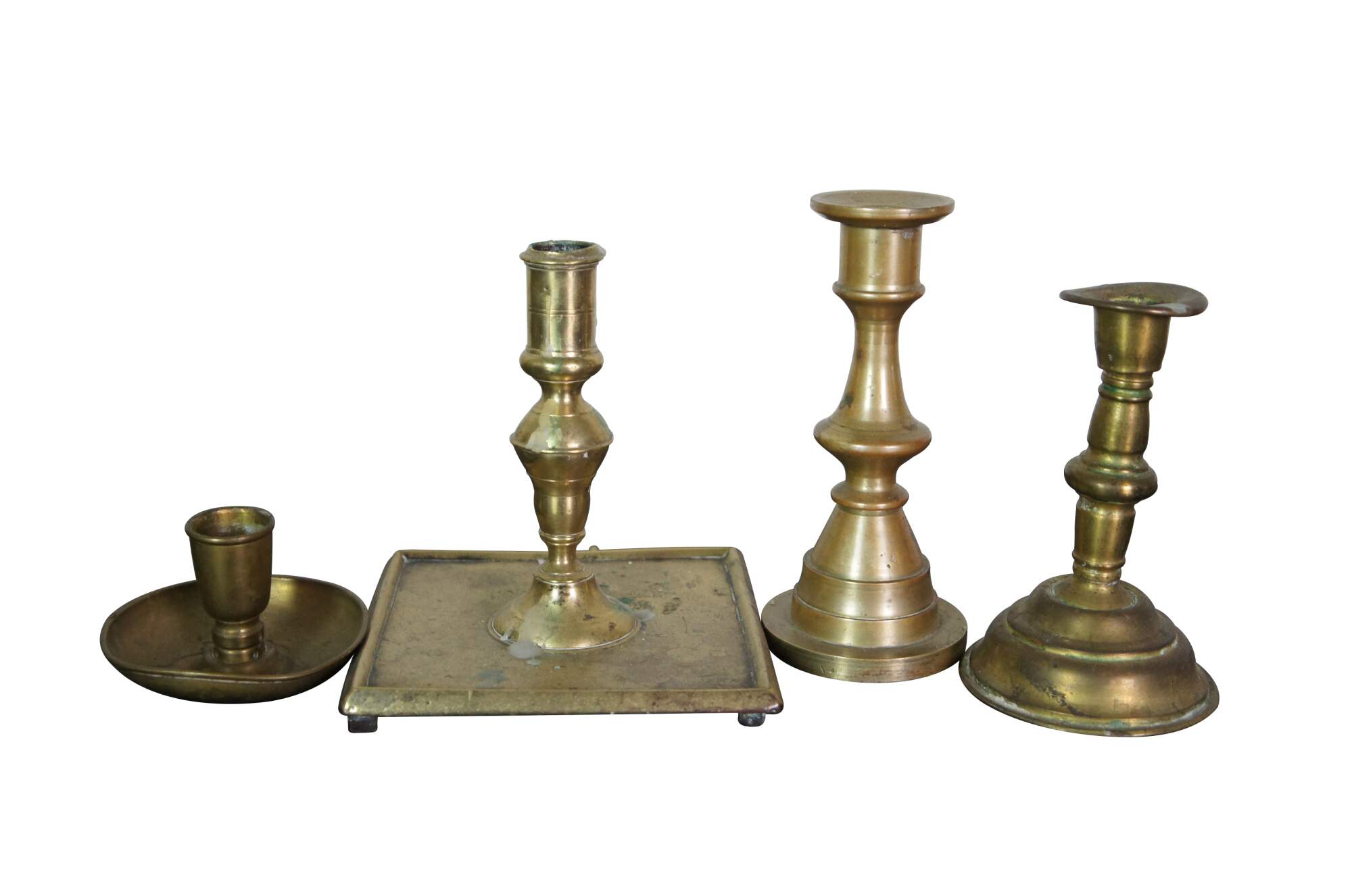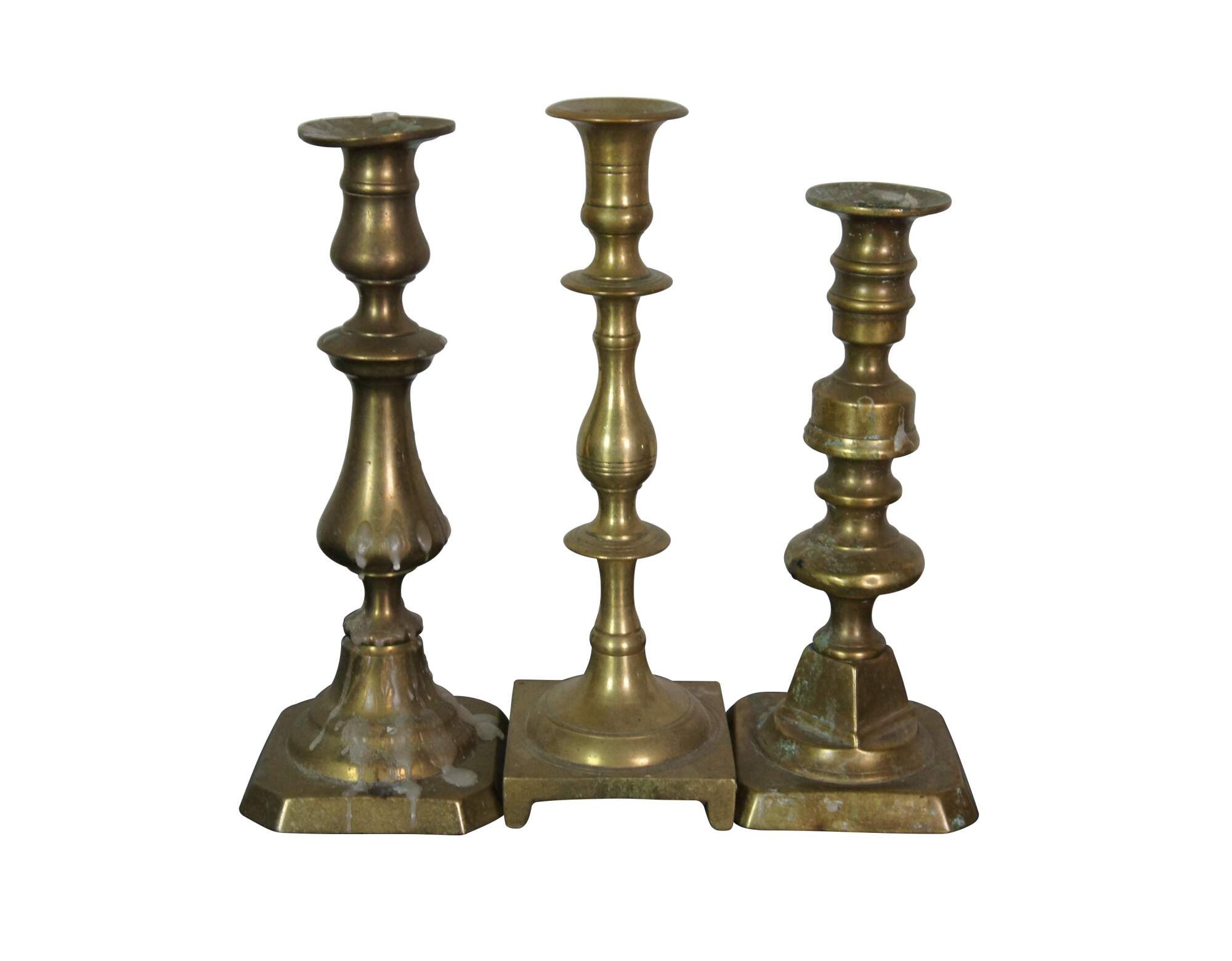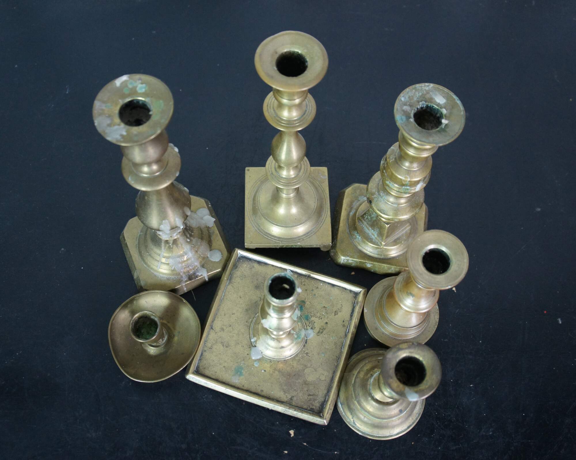 Lot of seven antique and vintage 20th century brass candlesticks in assorted styles. Including one Civil war / officer / campaign doughnut style traveling camp candlestick.