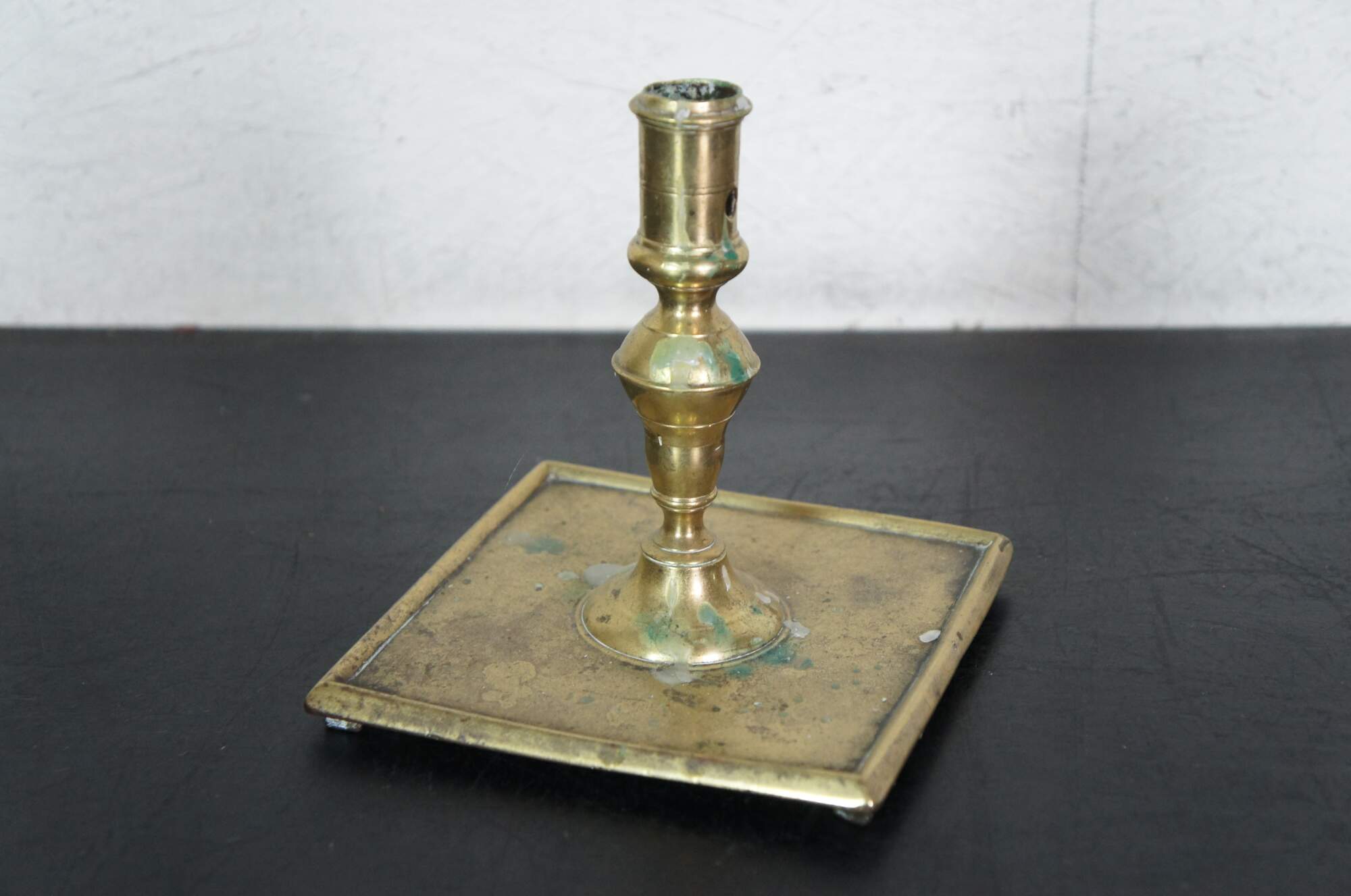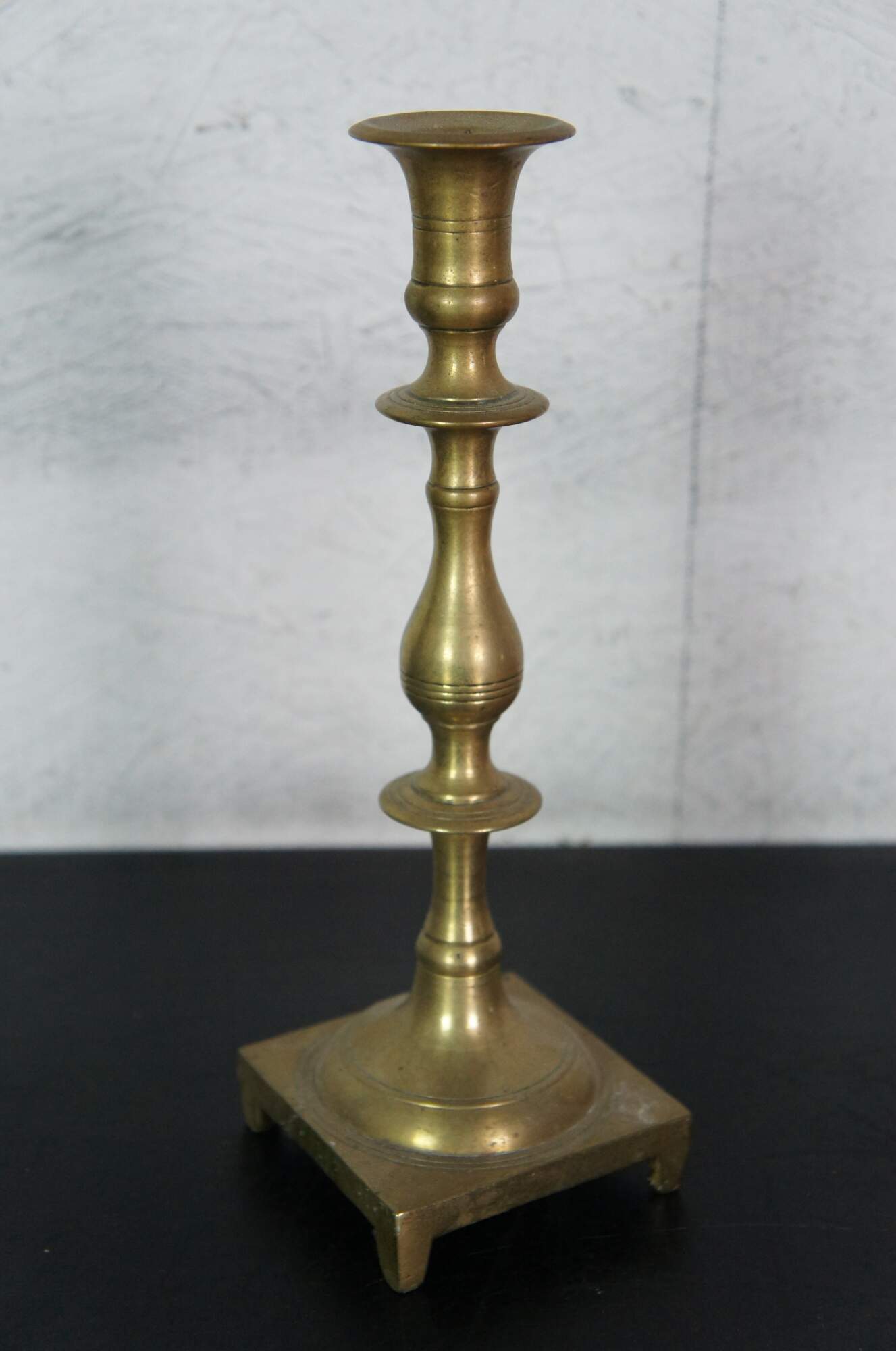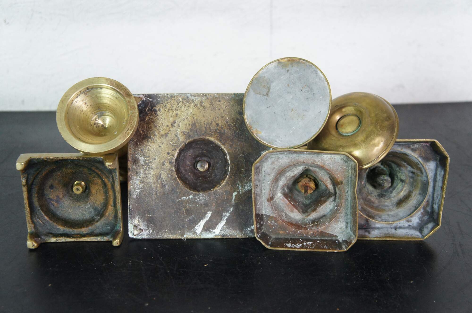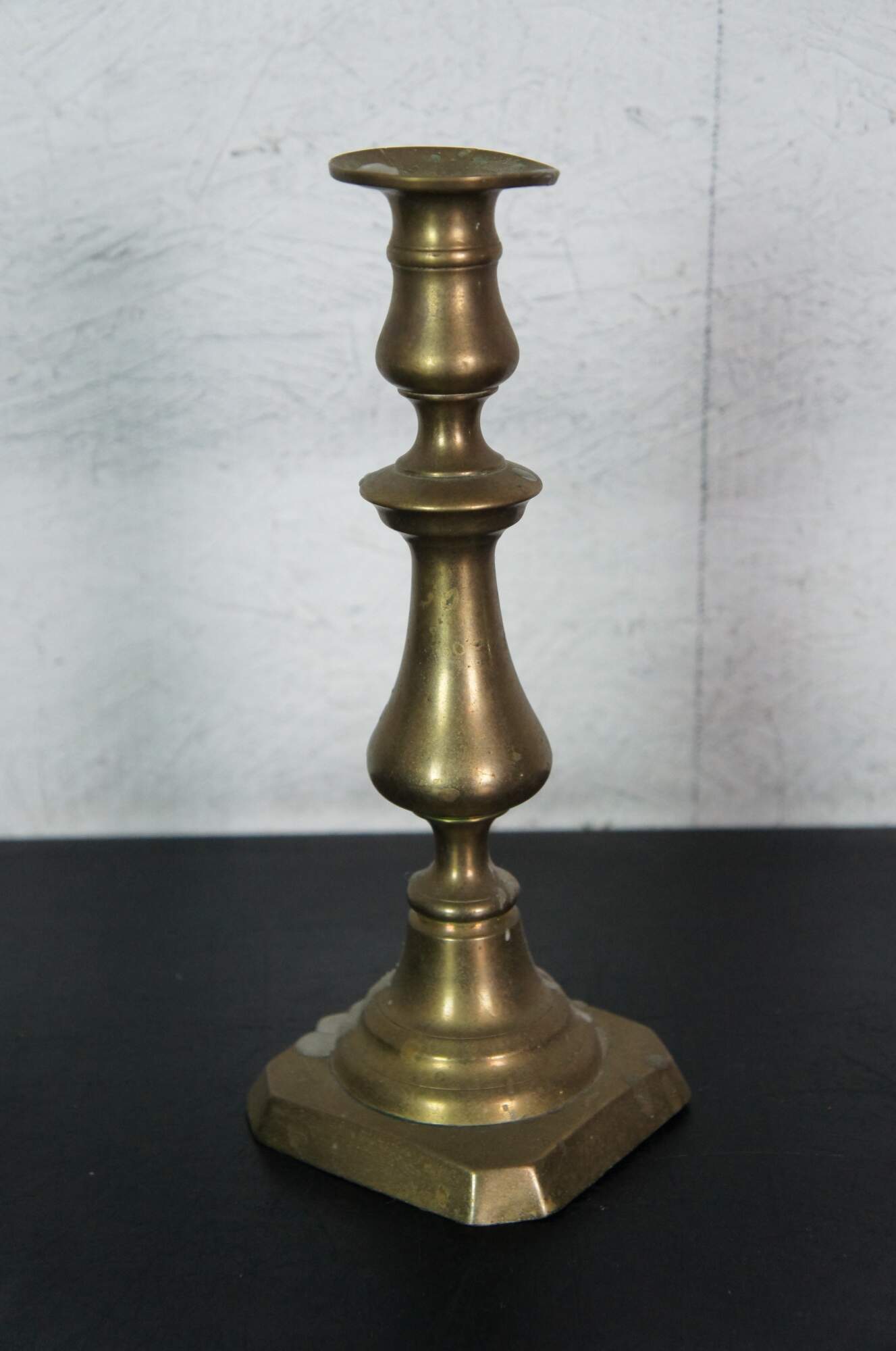 Lot of seven antique and vintage 20th century brass candlesticks in assorted styles. Including one Civil war / officer / campaign doughnut style traveling camp candlestick.