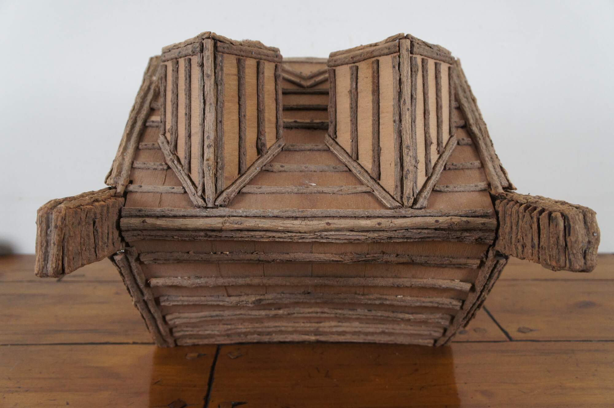 Primitive style adirondack style log cabinet. Made from wood, sticks and bark. Features a central door flanked by two windows. The upper story shows two windows and two chimneys.