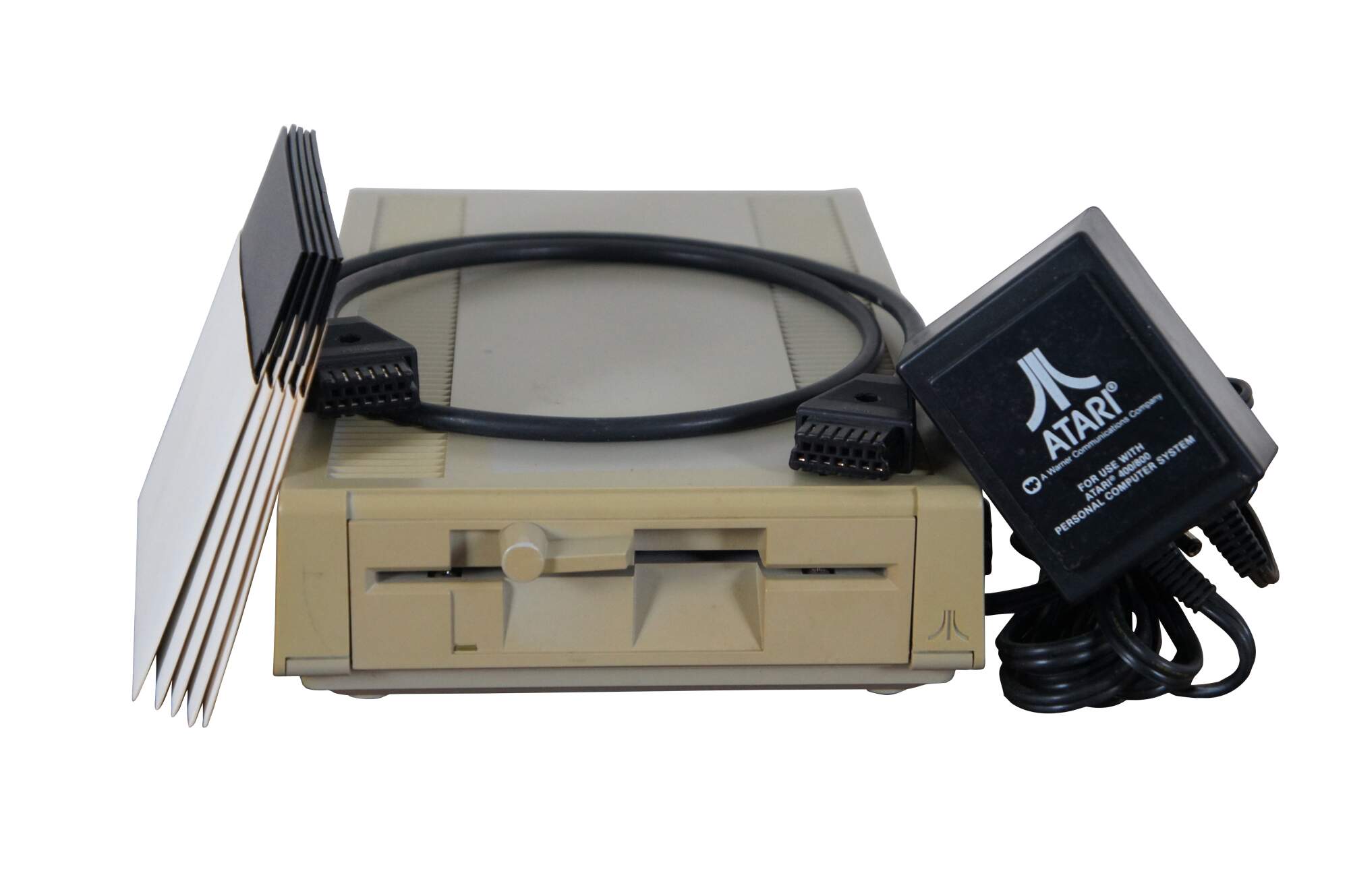 Atari XF551 double density floppy disk drive, Serial Number Q17B1001035, circa 1987. Also included: Part Number C017945 Power Supply, peripheral cable, and 5 unmarked 3.25” floppy disks.