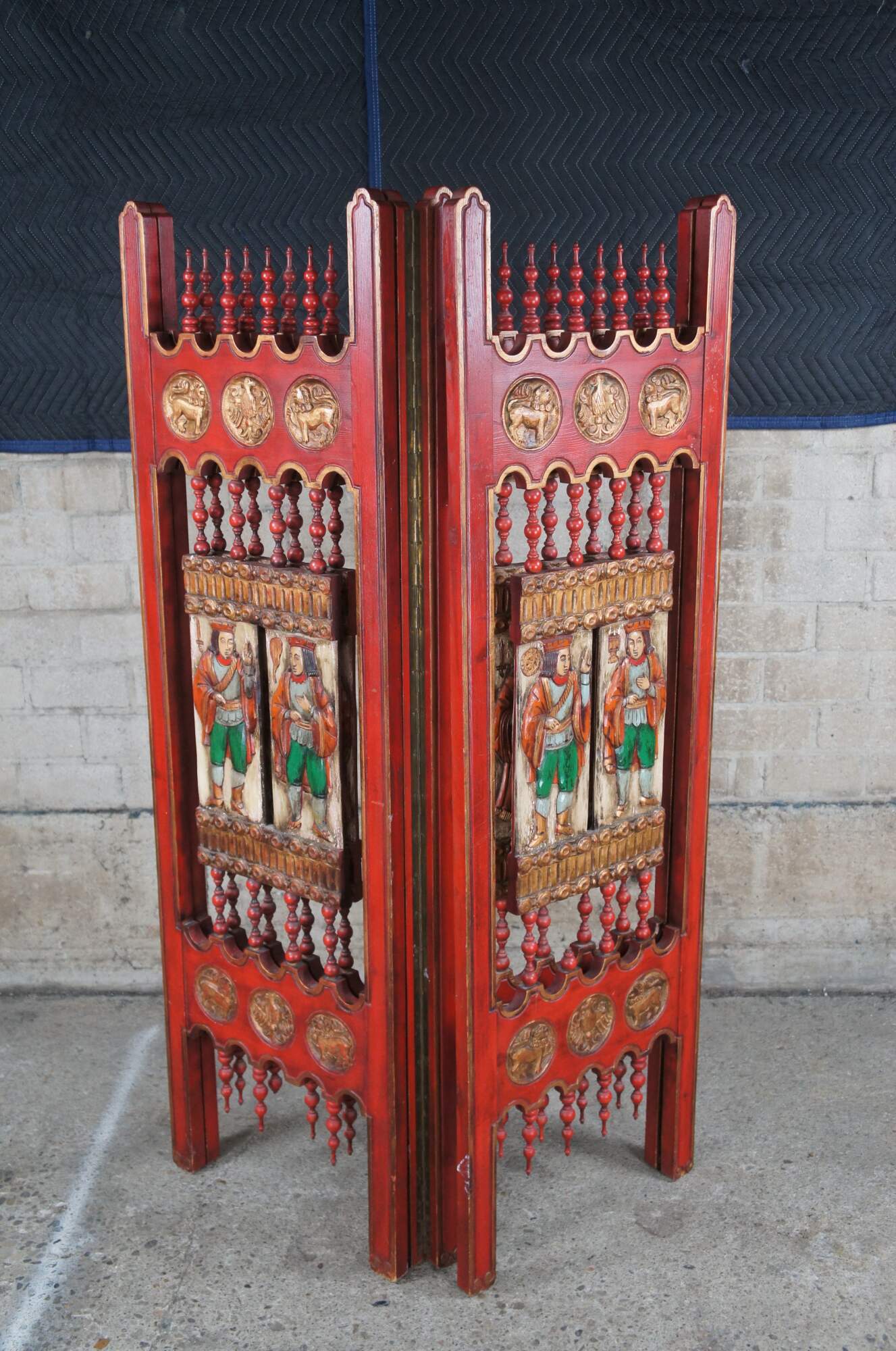 Vintage gothic / medieval four panel room divider screen. Made of red painted oak featuring reticulated turned spindle design with figural kings and noblemen plaques at the center, flanked by gold eagle and lion medallions.