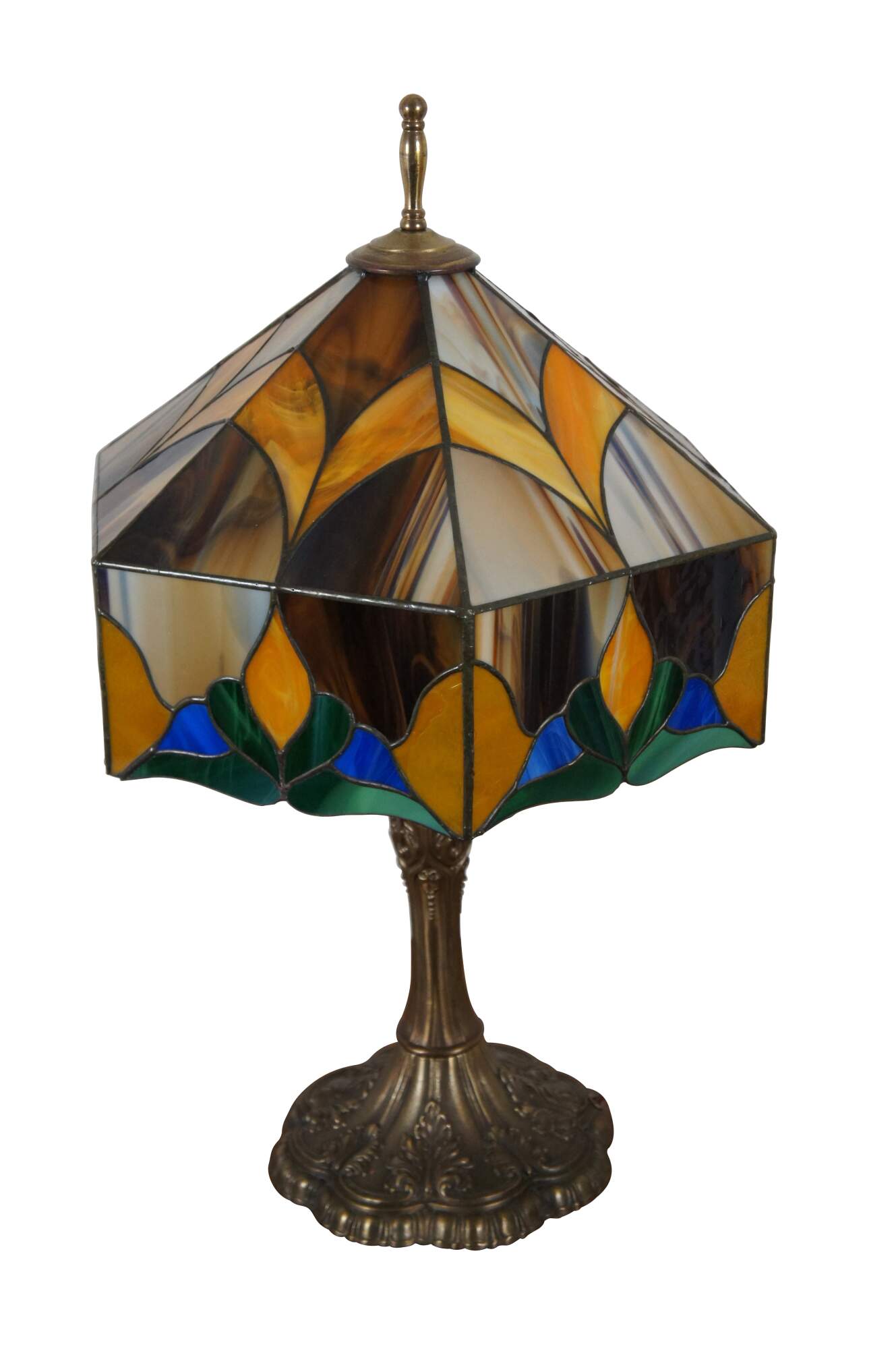 Vintage Tiffany style stained slag glass two light parlor table lamp featuring Art Nouveau styling with beautiful abstract floral design shade of blues, greens, orange and tortoise brown supported by a tapered and scalloped acanthus base.