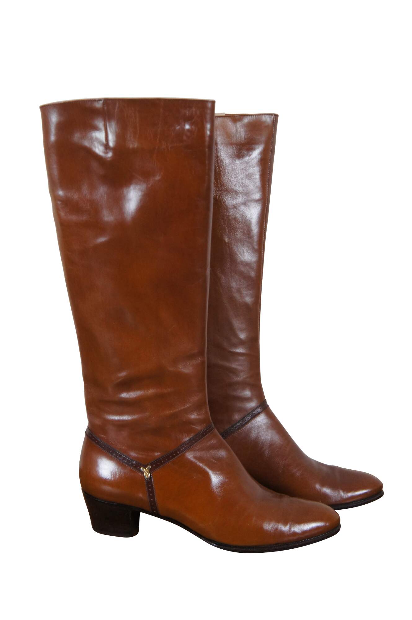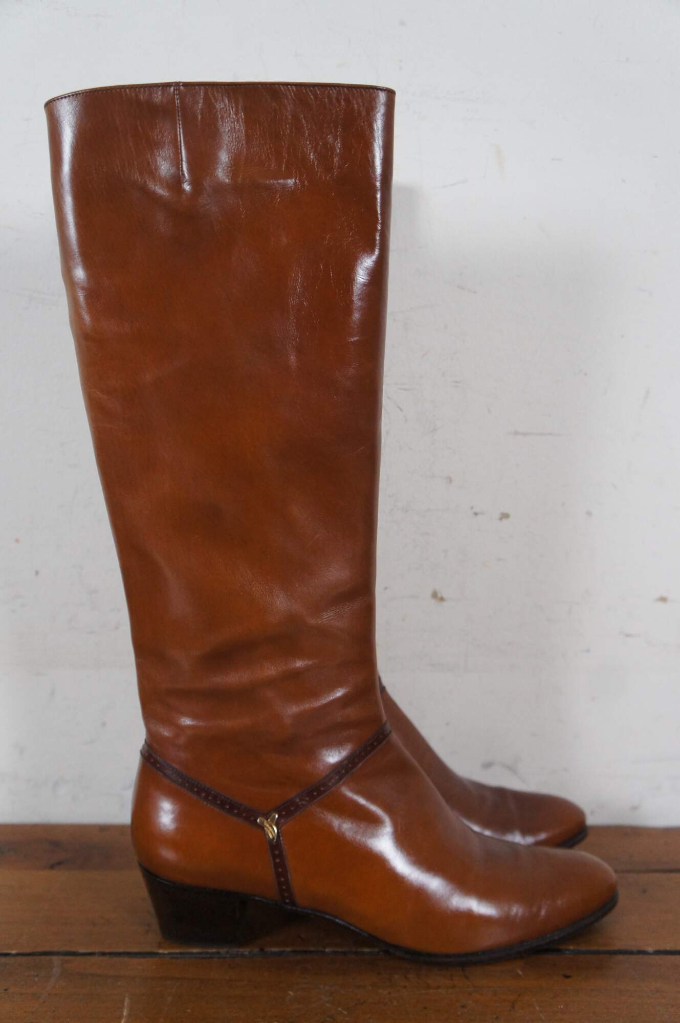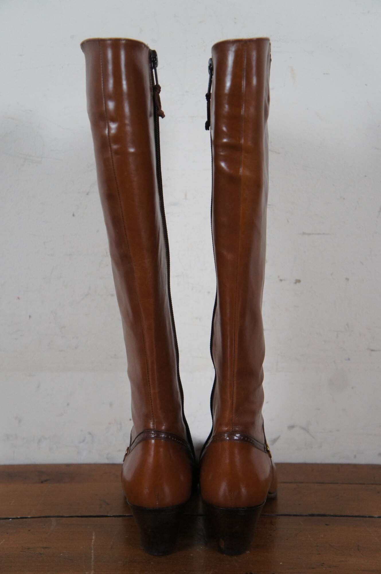 Vintage pair of tall riding boots by Salvatore Ferragamo in Rallina brown calf leather. Made in Italy. Original box included. Size 6.5 AAA. DFU 1544